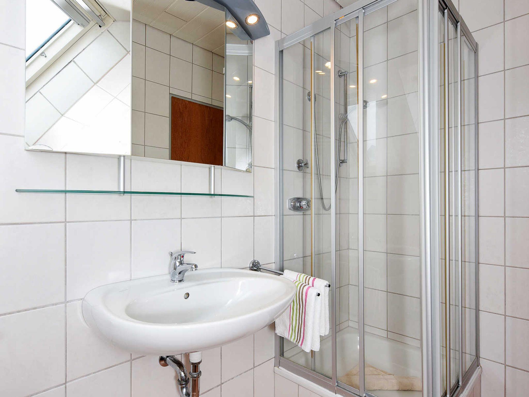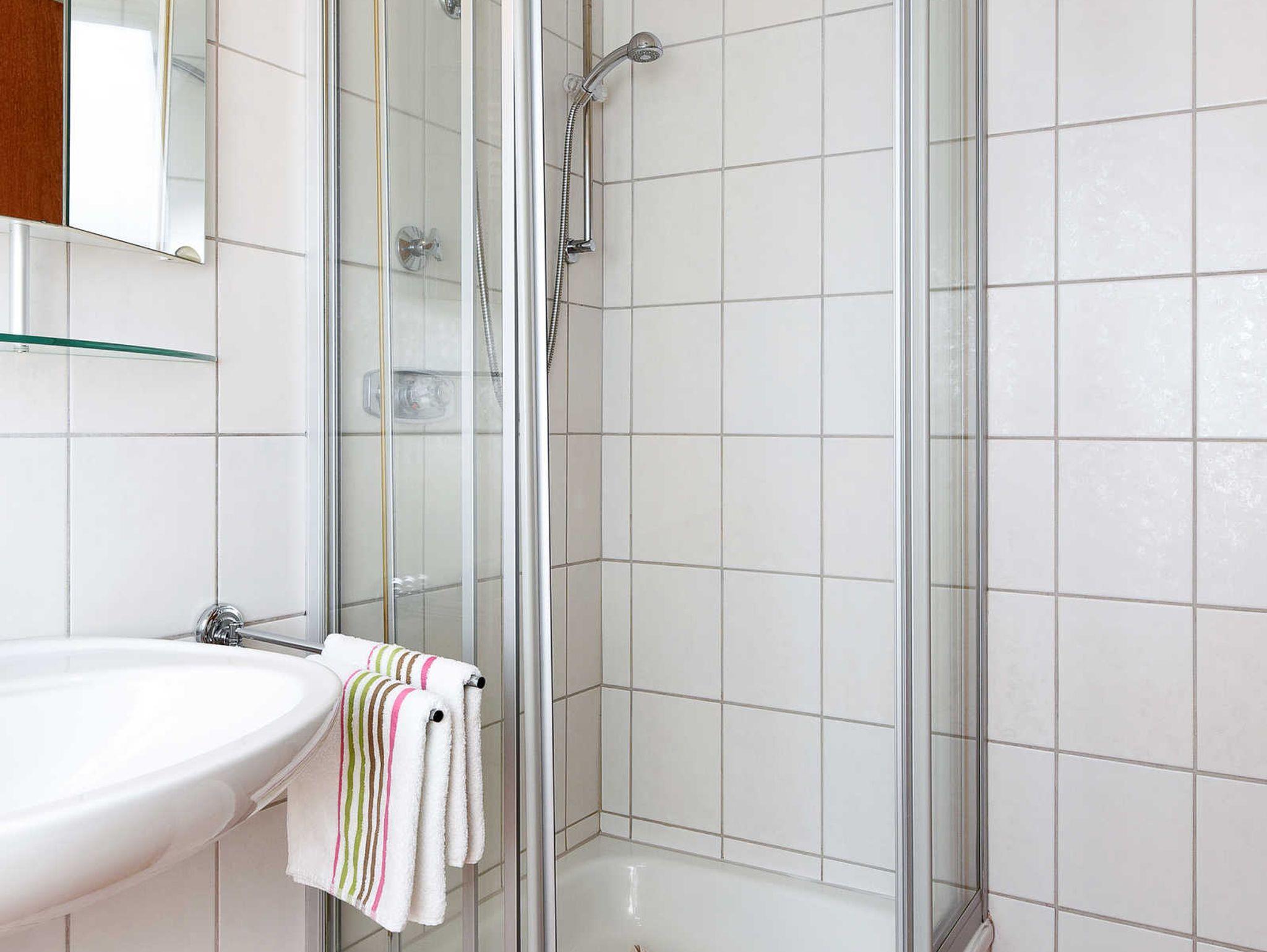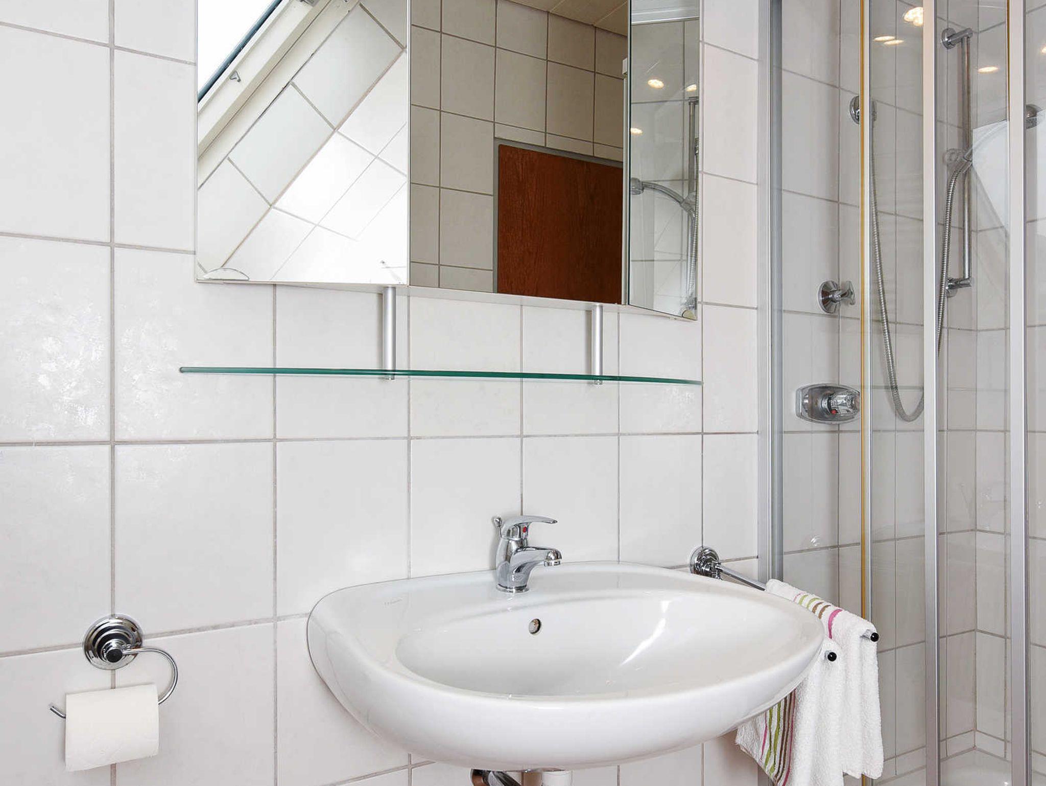 Badezimmer mit Dusche, Waschtisch und WC