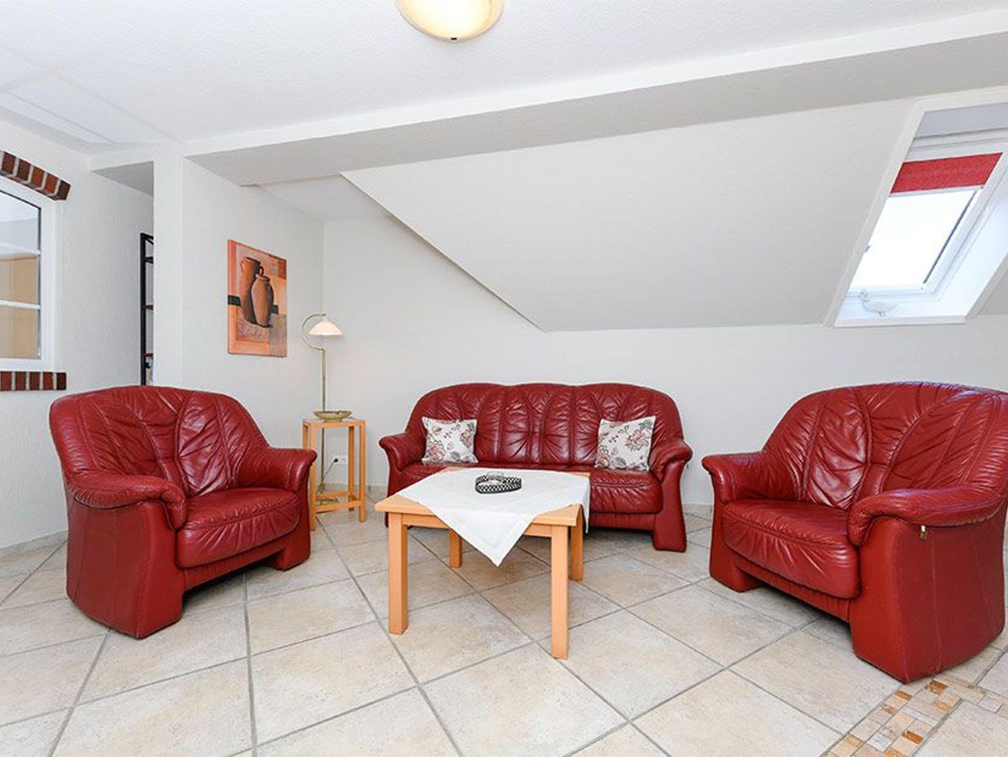 Größe ca. 72 Quadratmeter, Wohnraum mit integrierter Küche, Schlafzimmer, zweites separates Schlafzimmer/Kinderzimmer, Badezimmer mit Badewanne, Dusche, Waschtisch, WC, Obergeschoss, Sitzgruppe im Garten, Koffer-/Abstellraum, optimal für 2 bis 4 Personen und zusätzlich ein Kleinkind.