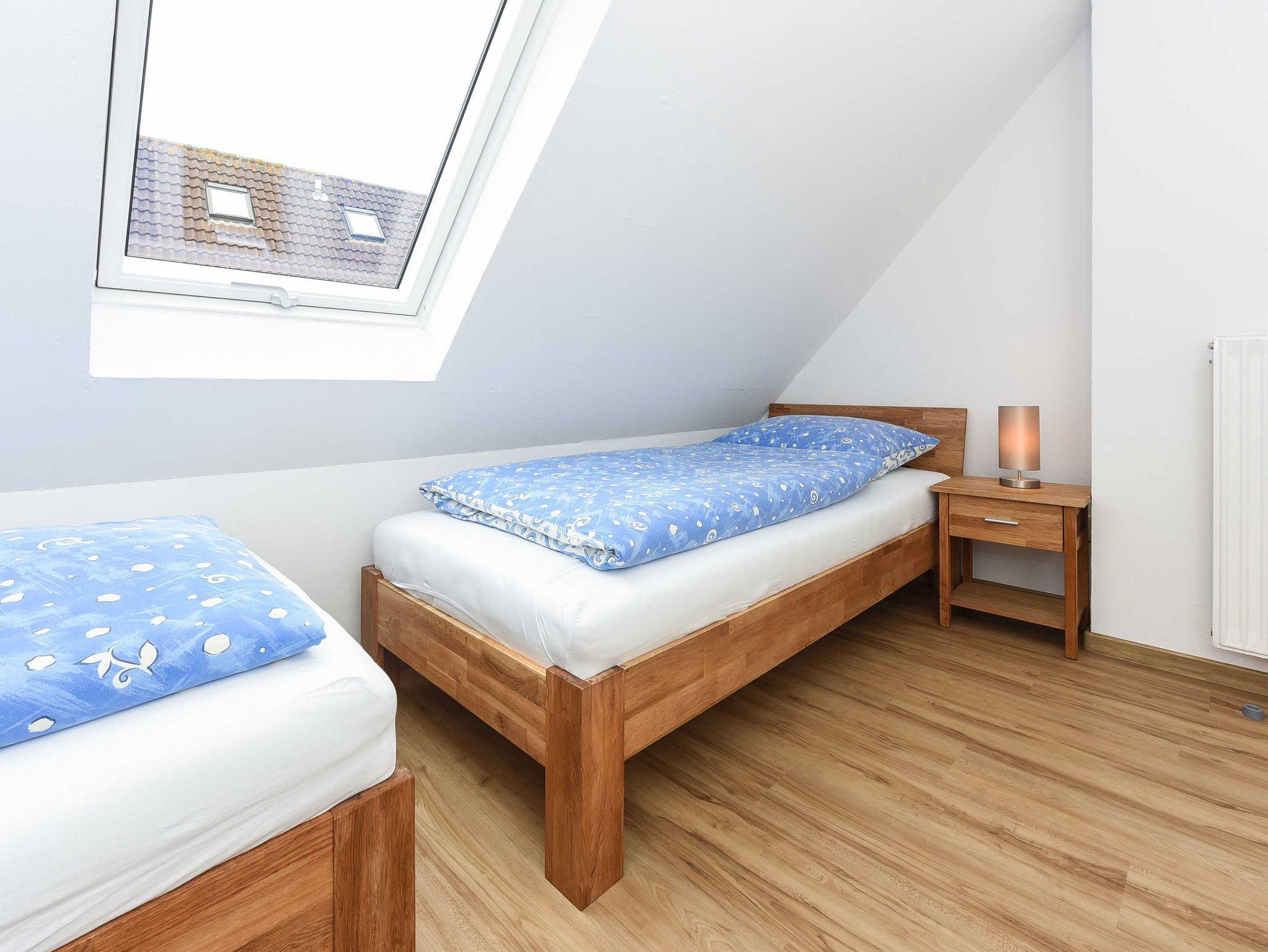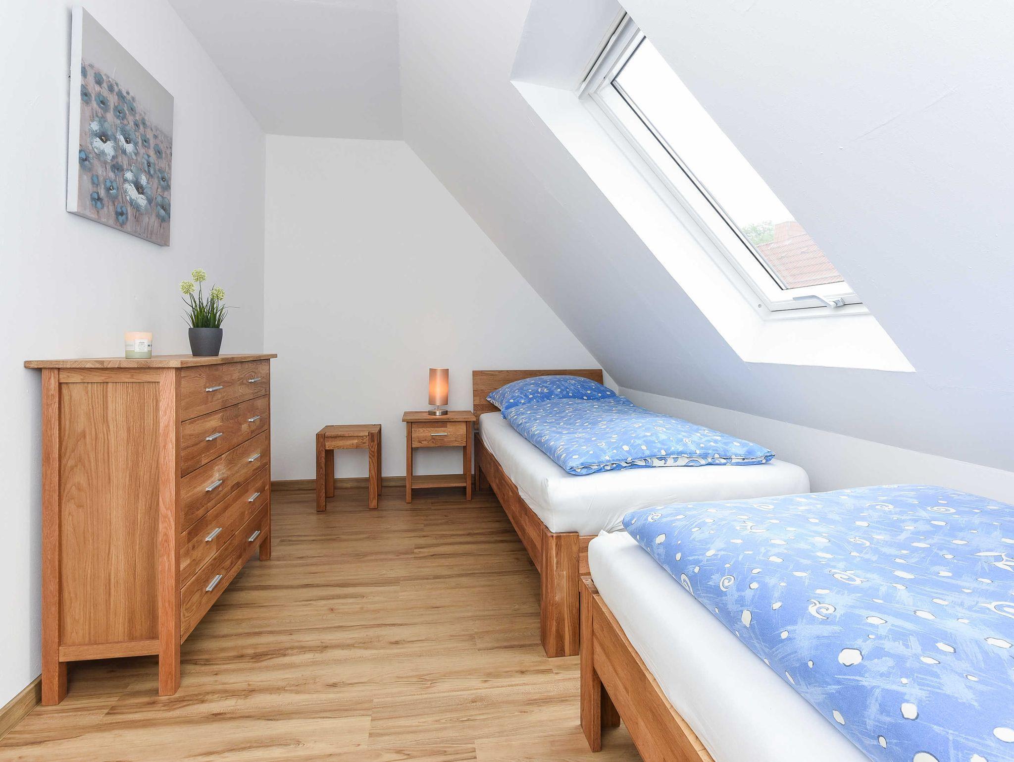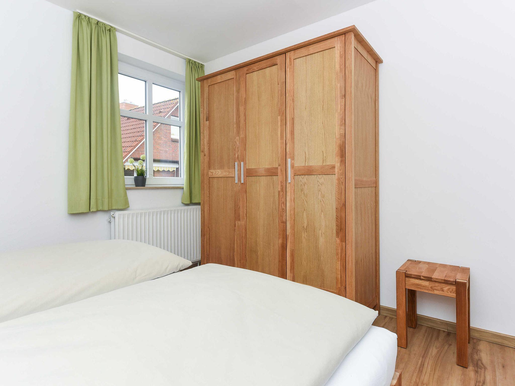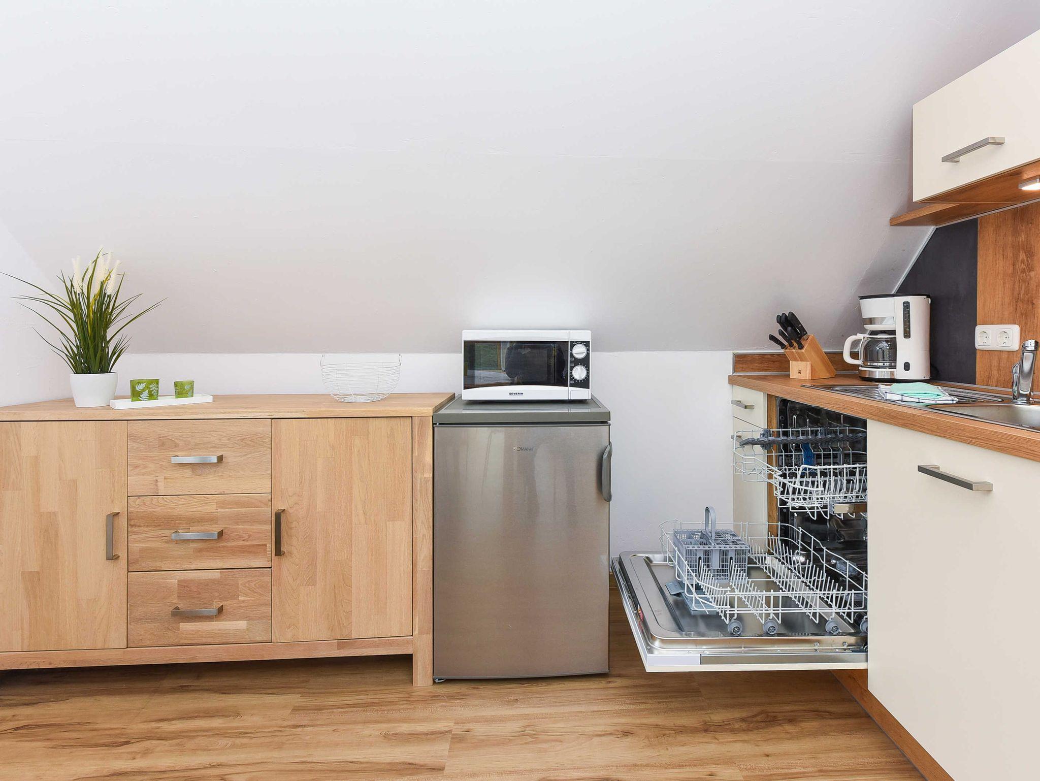 Größe ca. 52 Quadratmeter, Wohnraum mit integrierter Küche, Schlafzimmer, zweites separates, Schlafzimmer/Kinderzimmer, Badezimmer mit Dusche, Waschtisch und WC, Obergeschoss, Hauswirtschaftsraum mit Waschmaschine und Wäschetrockner, optimal für 2 bis 4 Personen nebst Kleinkind. Der gemeinsame Hauswirtschaftsraum verfügt über eine Waschmaschine.