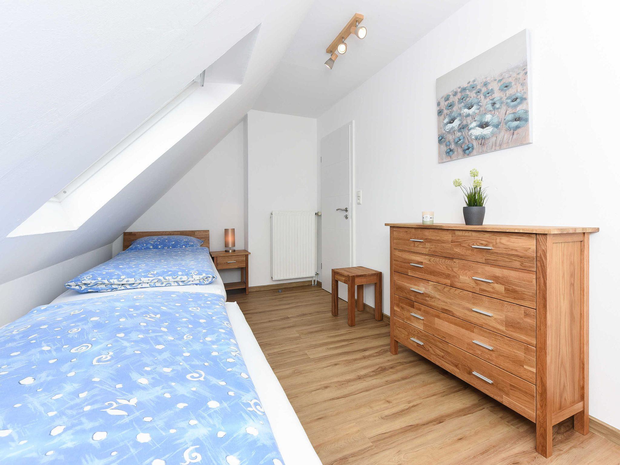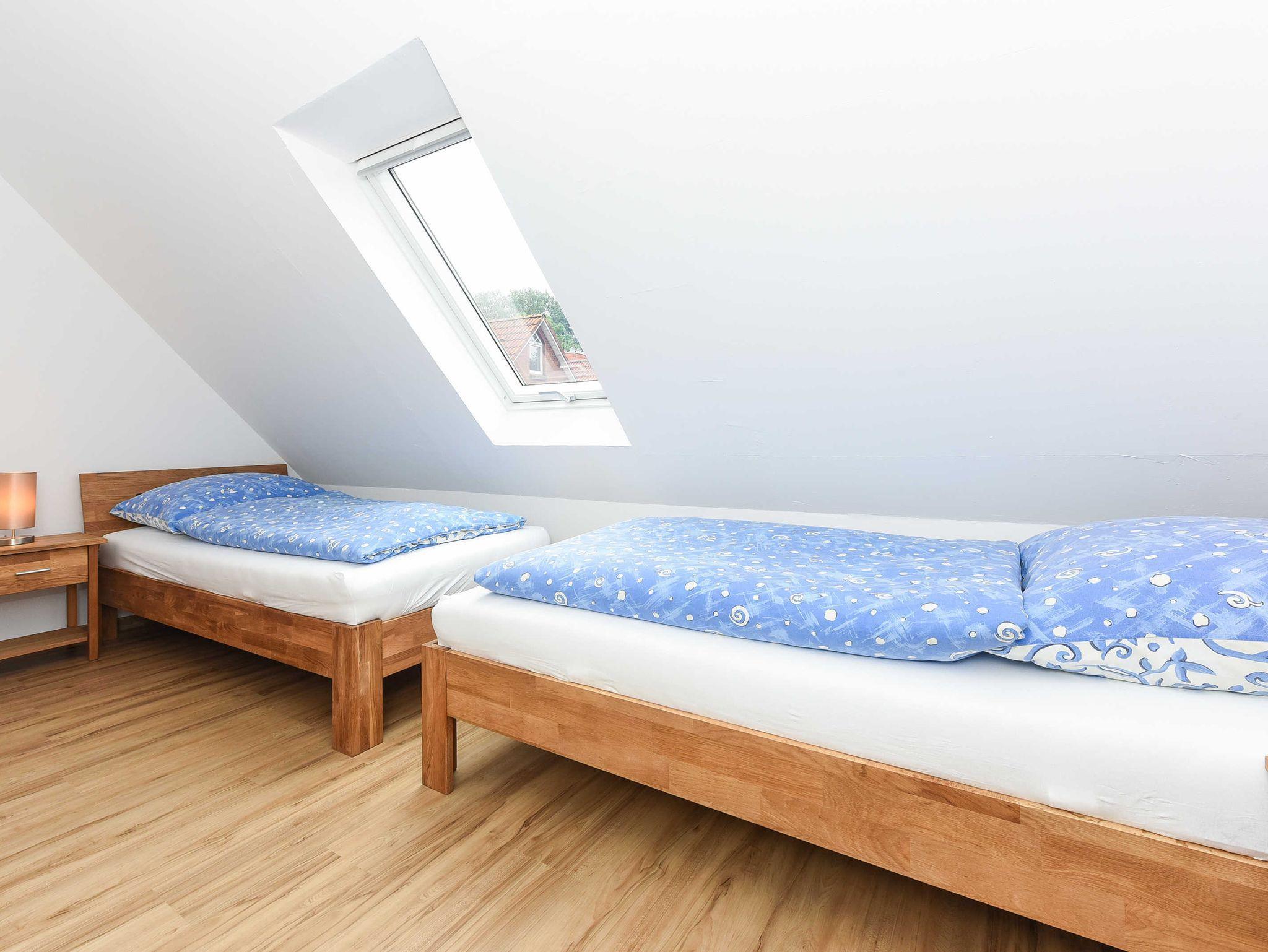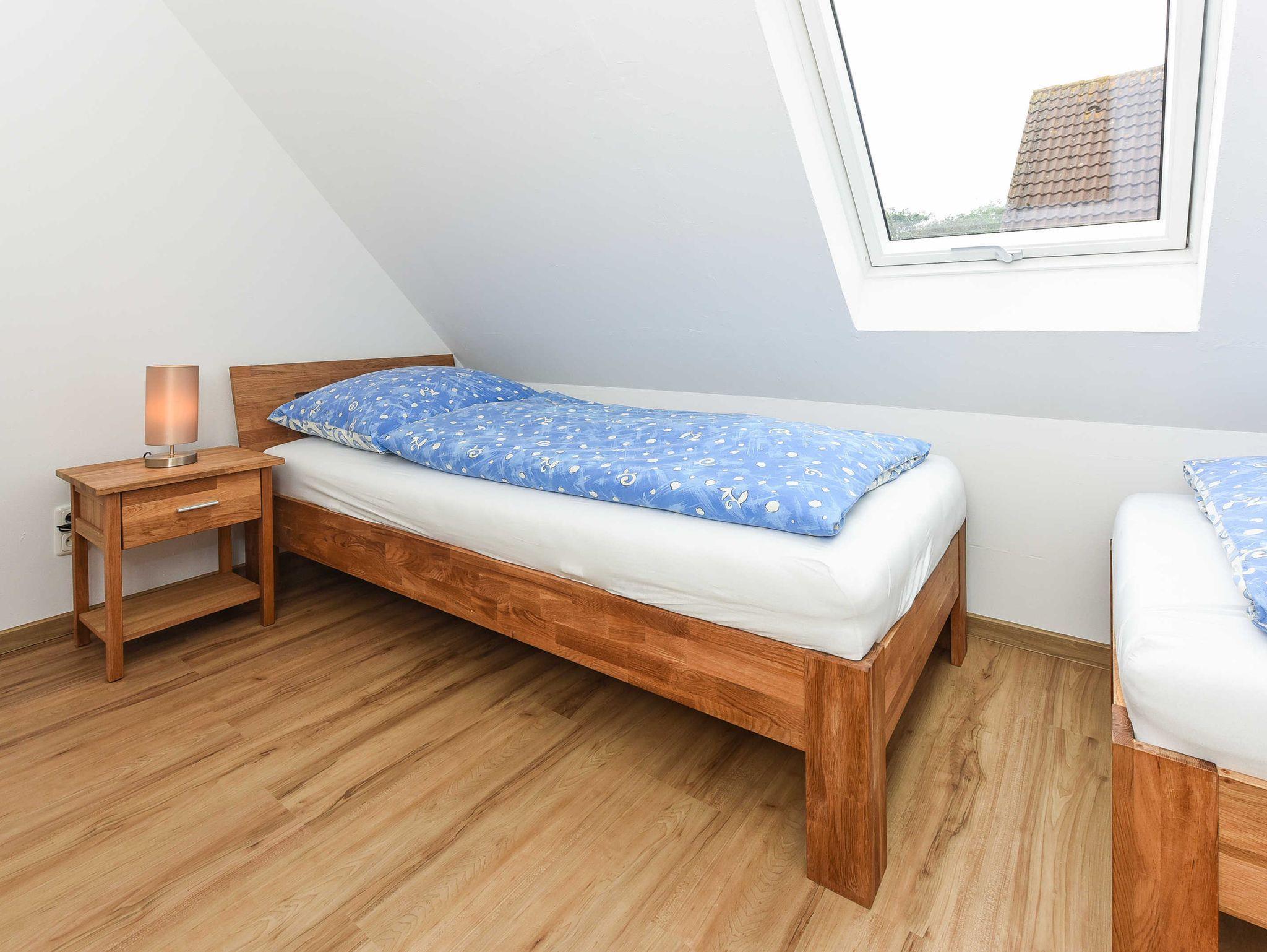 Größe ca. 52 Quadratmeter, Wohnraum mit integrierter Küche, Schlafzimmer, zweites separates, Schlafzimmer/Kinderzimmer, Badezimmer mit Dusche, Waschtisch und WC, Obergeschoss, Hauswirtschaftsraum mit Waschmaschine und Wäschetrockner, optimal für 2 bis 4 Personen nebst Kleinkind. Der gemeinsame Hauswirtschaftsraum verfügt über eine Waschmaschine.