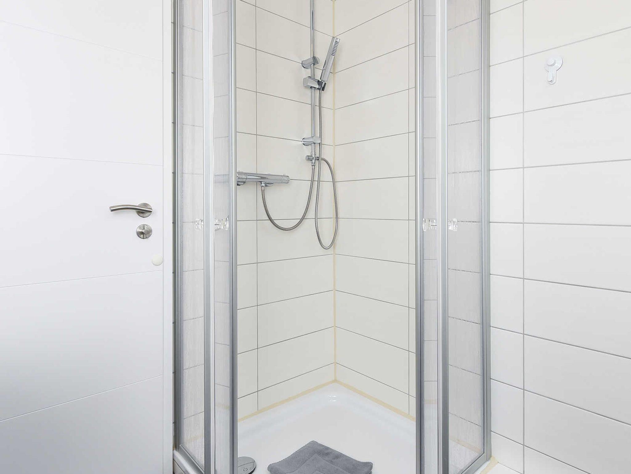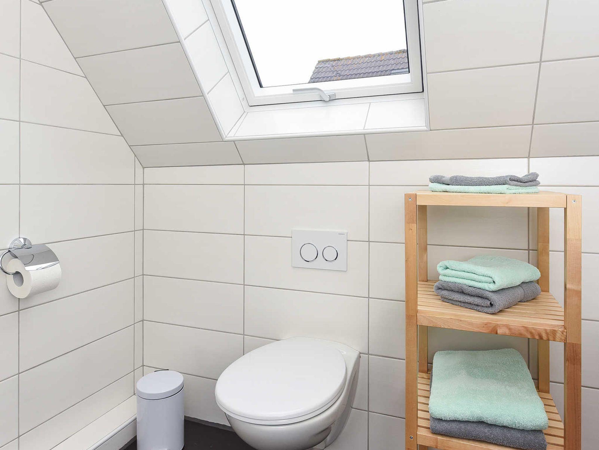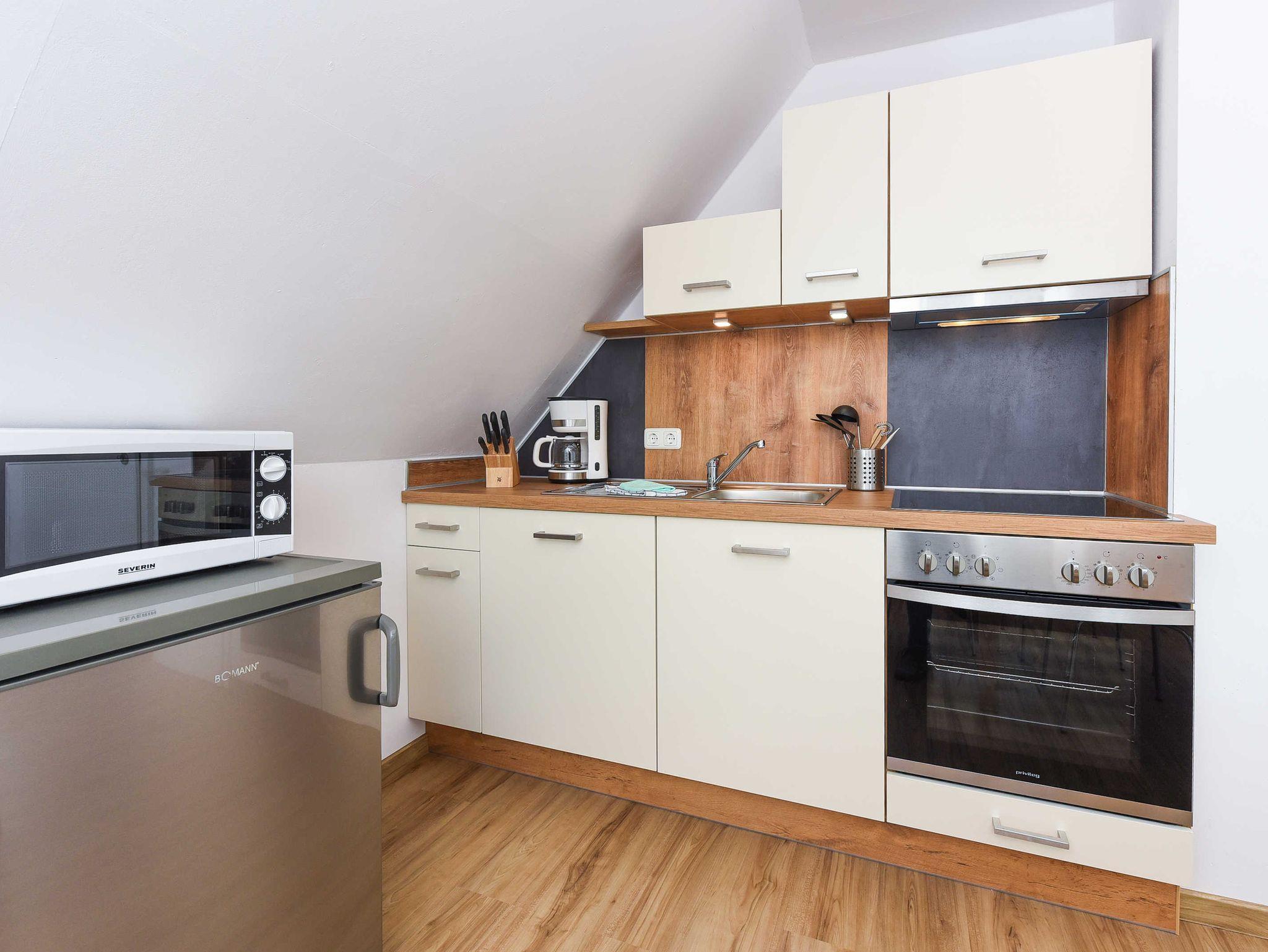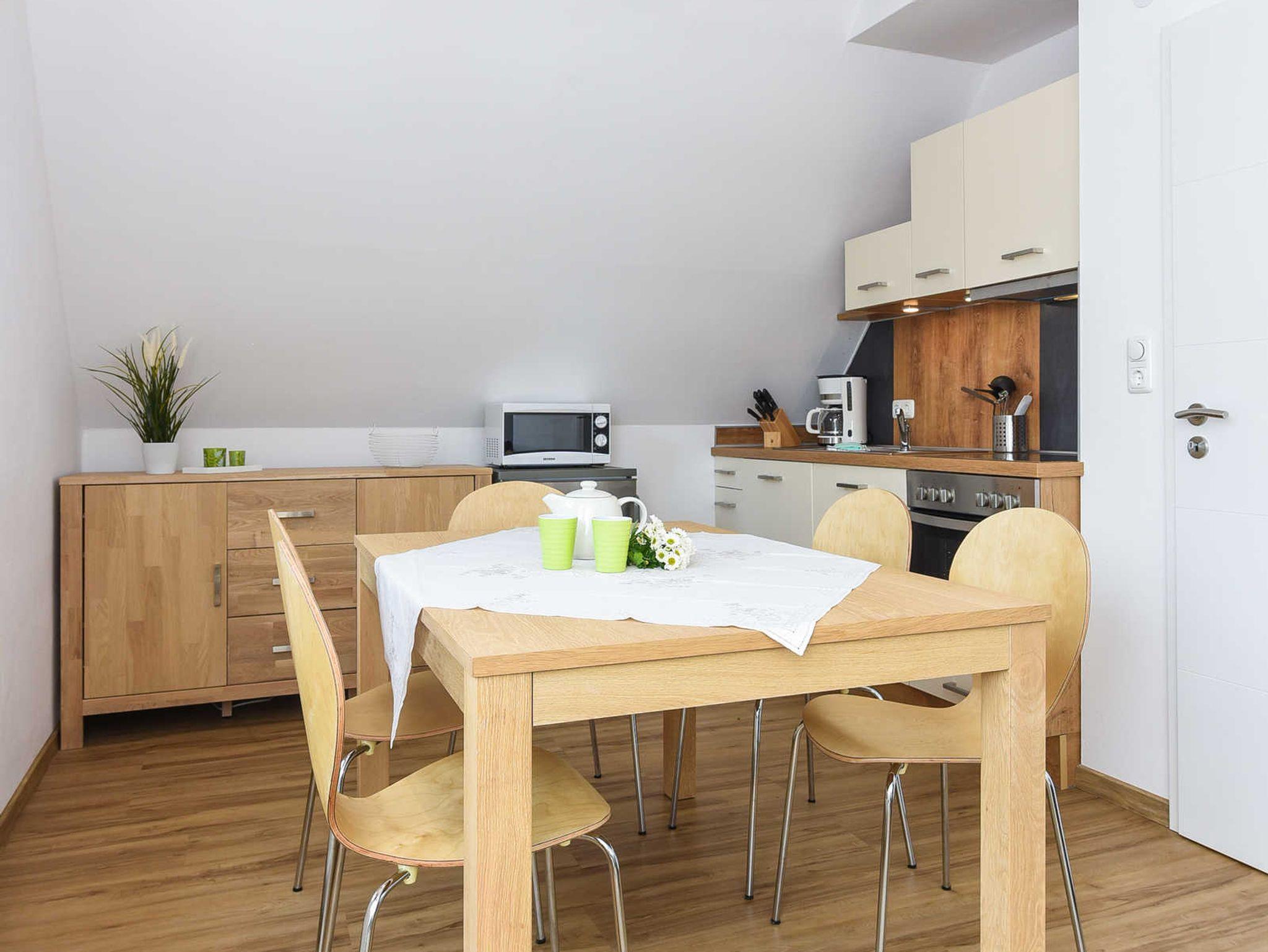 Größe ca. 52 Quadratmeter, Wohnraum mit integrierter Küche, Schlafzimmer, zweites separates, Schlafzimmer/Kinderzimmer, Badezimmer mit Dusche, Waschtisch und WC, Obergeschoss, Hauswirtschaftsraum mit Waschmaschine und Wäschetrockner, optimal für 2 bis 4 Personen nebst Kleinkind. Der gemeinsame Hauswirtschaftsraum verfügt über eine Waschmaschine.