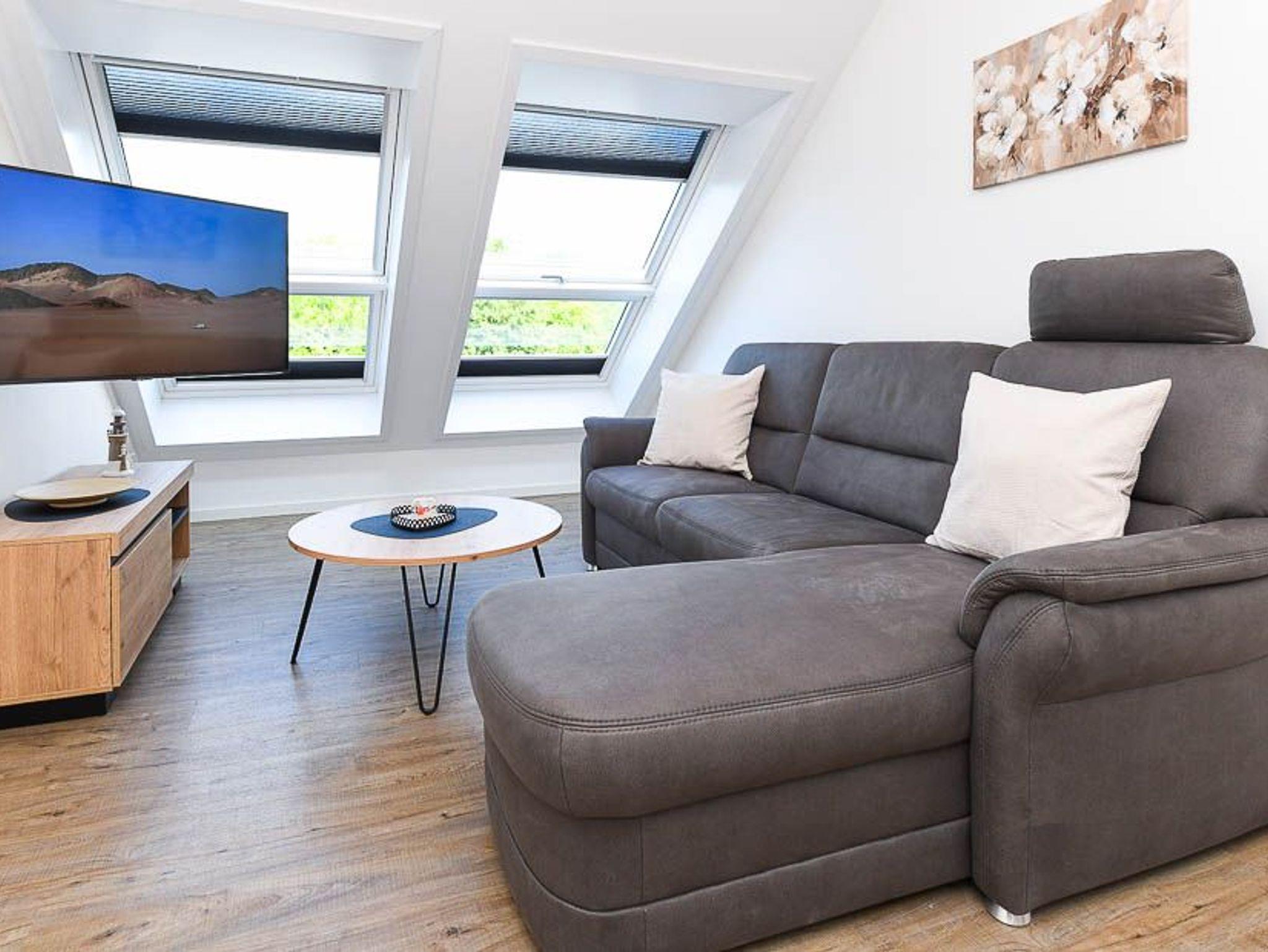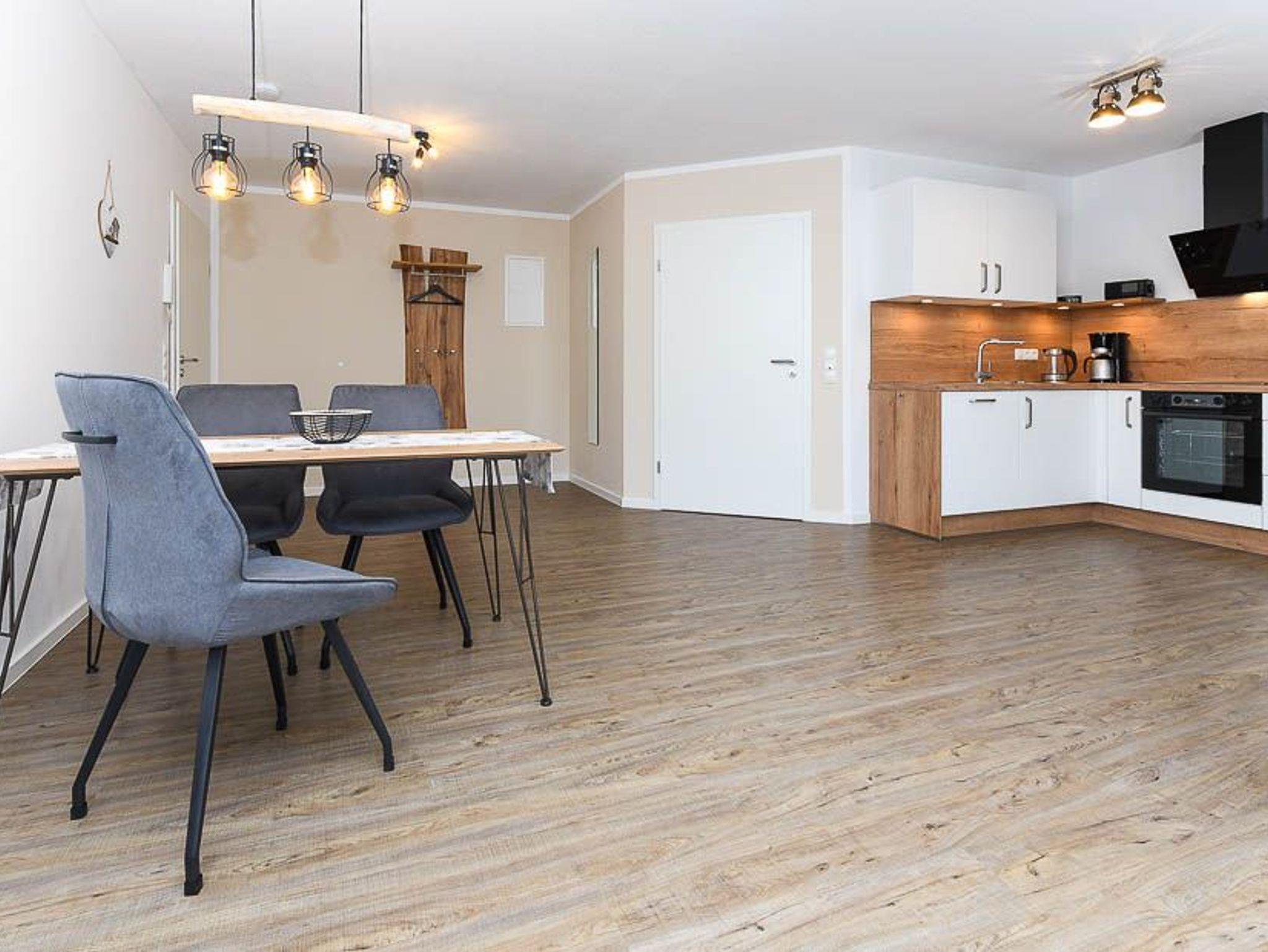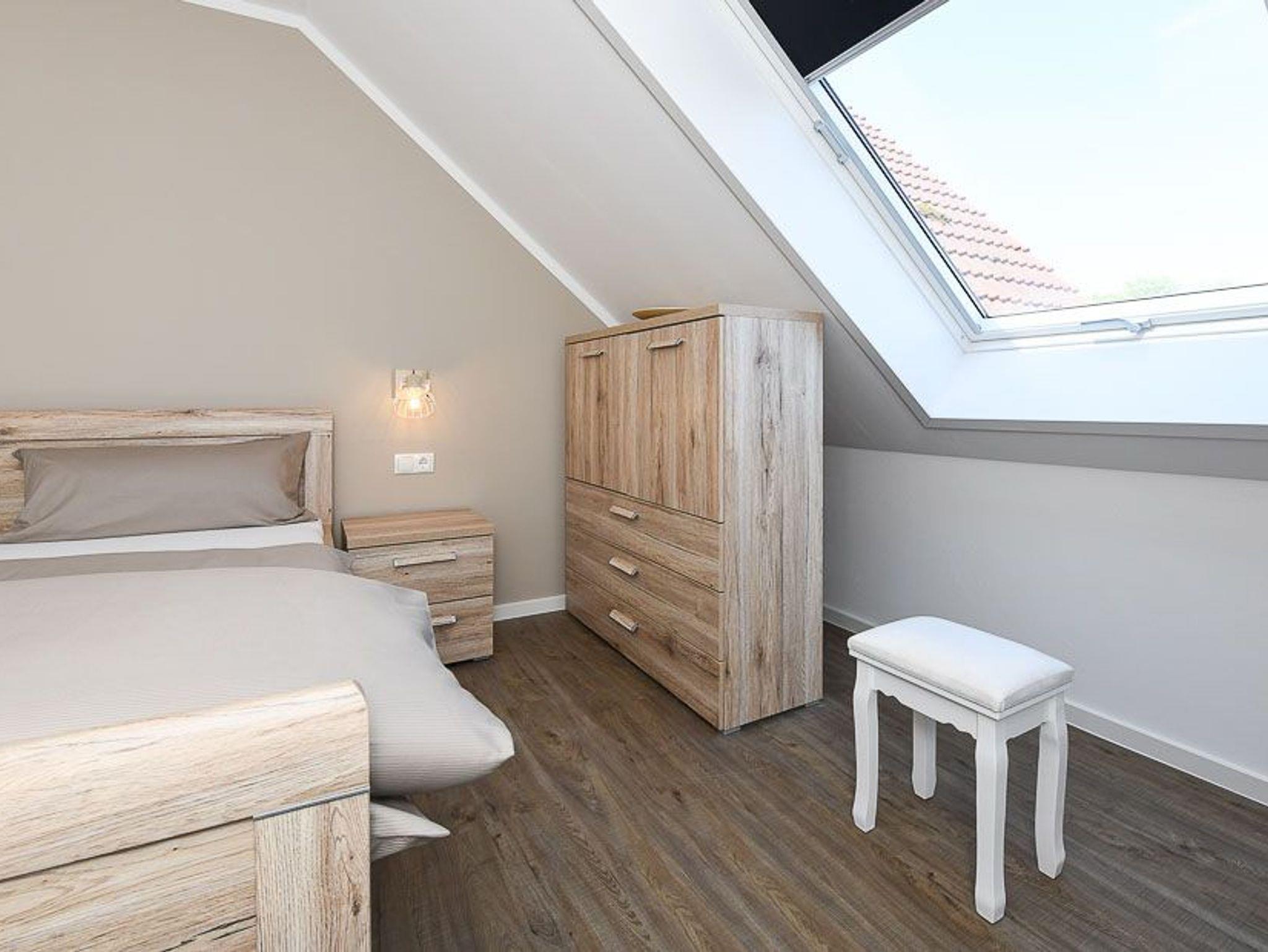Größe ca. 51 Quadratmeter. Wohnraum mit integrierter Küche. Schlafzimmer, Badezimmer mit Dusche, Waschtisch und WC, Obergeschoss, optimal für 1 bis 2 Personen und zusätzlich ein Kleinkind.