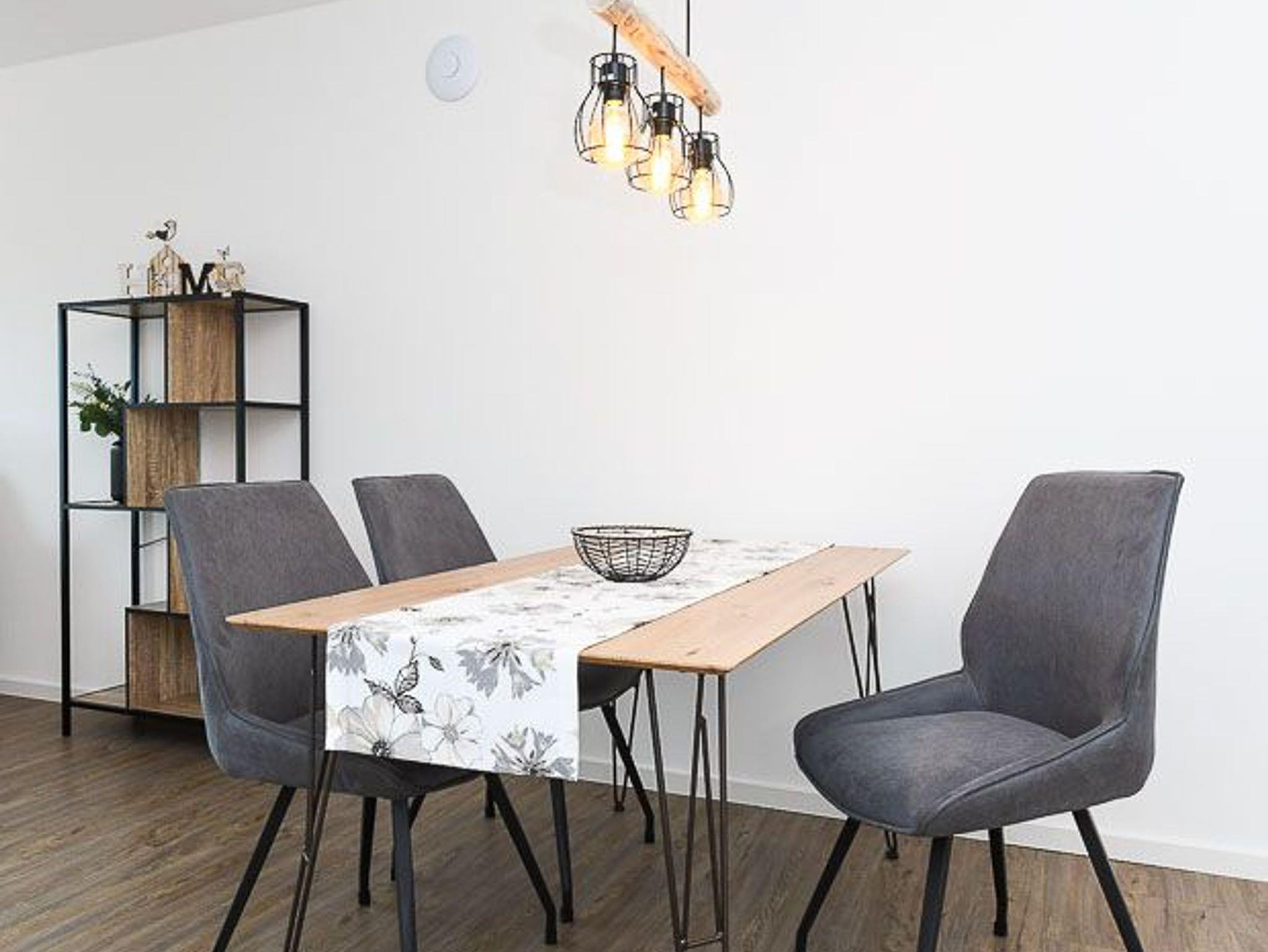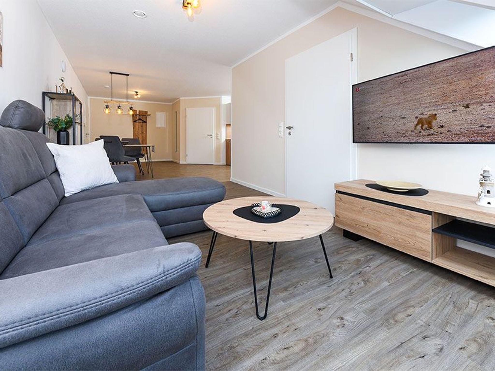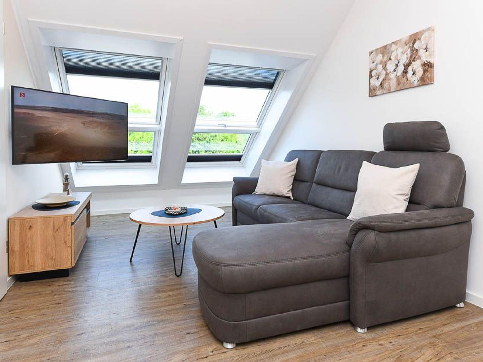 Größe ca. 51 Quadratmeter. Wohnraum mit integrierter Küche. Schlafzimmer, Badezimmer mit Dusche, Waschtisch und WC, Obergeschoss, optimal für 1 bis 2 Personen und zusätzlich ein Kleinkind.