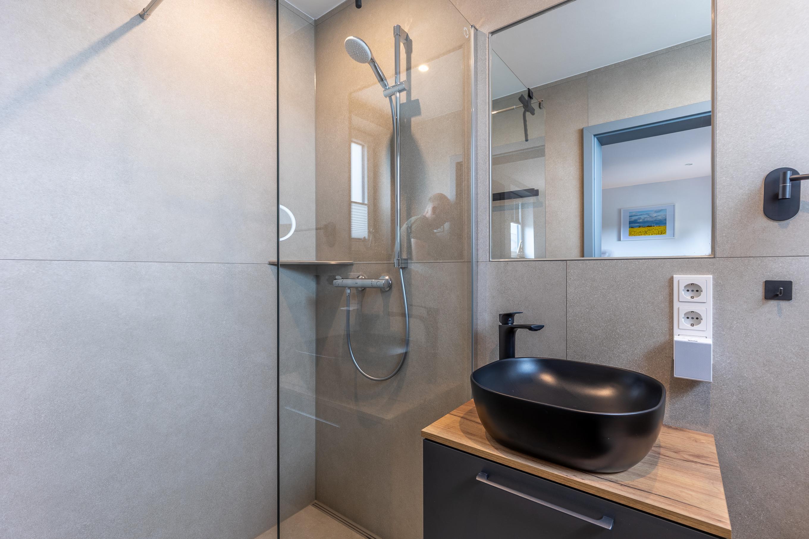 Das moderne Badezimmer verwöhnt Sie mit einer komfortablen Dusche und einem Föhn. Nach einem langen Tag an der frischen Nordseeluft können Sie hier wunderbar entspannen und neue Energie tanken.