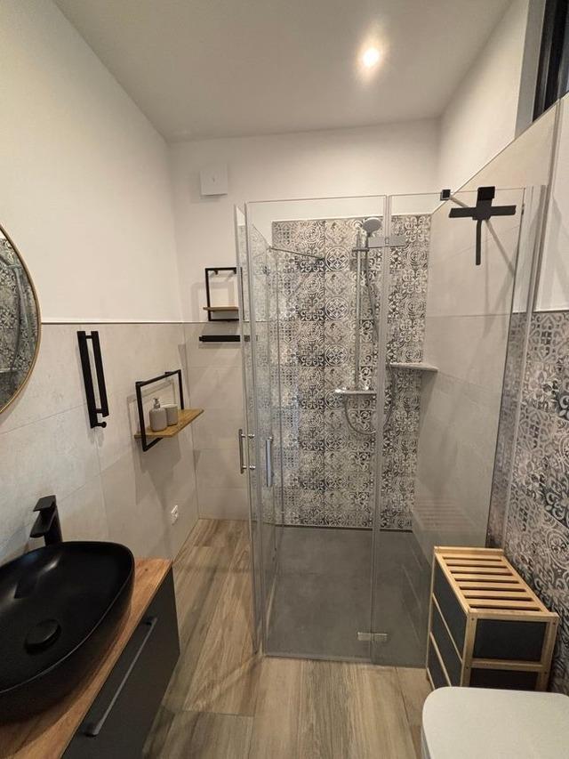 Modernes Bad mit Dusche und Föhn