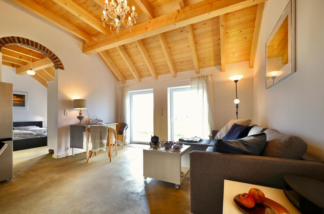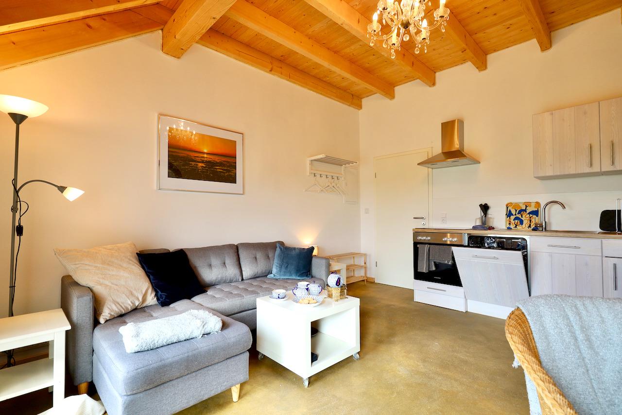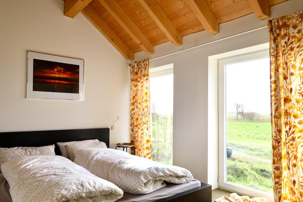 Große bodentiefe Fenster holen die Sonne ins Haus, die private Südterrasse lädt zum Verweilen ein. Natürliche Materialien wie unbehandeltes Holz, Kalkputz und reine Baumwoll-Bettwäsche schaffen ein besonders angenehmes Raumklima. Die sanfte Infrarot-Fußbodenheizung sorgt für wohlige Wärme; ideal für entspannte Tage zu jeder Jahreszeit.