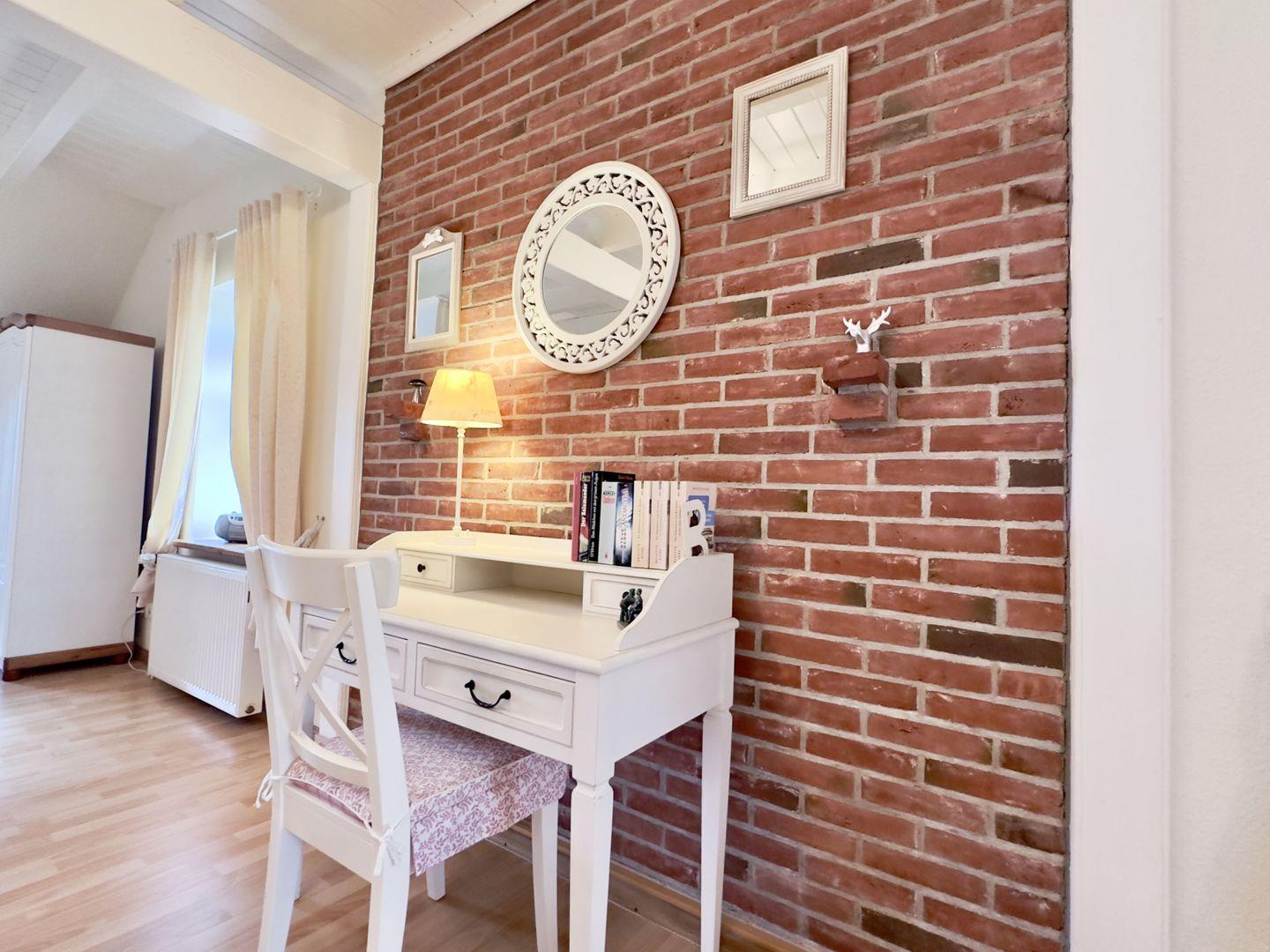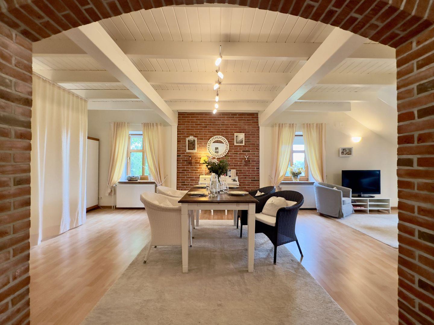 Bereits beim Betreten des Apartments werden Sie von den hellen, beeindruckenden Dachbalken im Wohnzimmer überwältigt. Diese weißen Balken und die verklinkerten Elemente verleihen dem Raum eine unverwechselbare, einladende Atmosphäre. Der gemütliche TV-Bereich, ausgestattet mit einem Sofa, das auch als Schlafsofa genutzt werden kann, lädt zu entspannten Abenden ein. Hier finden Sie Ihren persönlichen Rückzugsort nach einem ereignisreichen Tag.