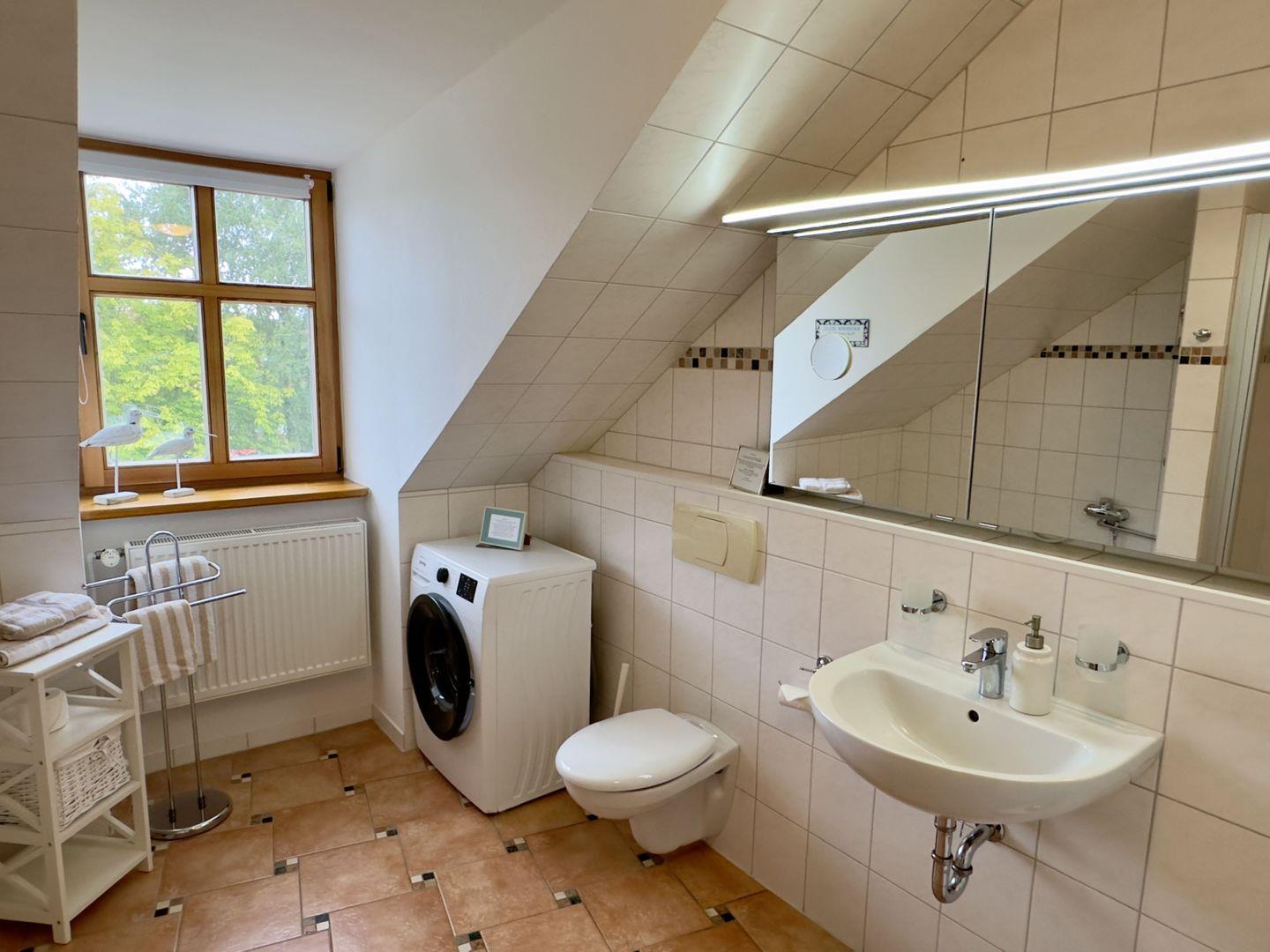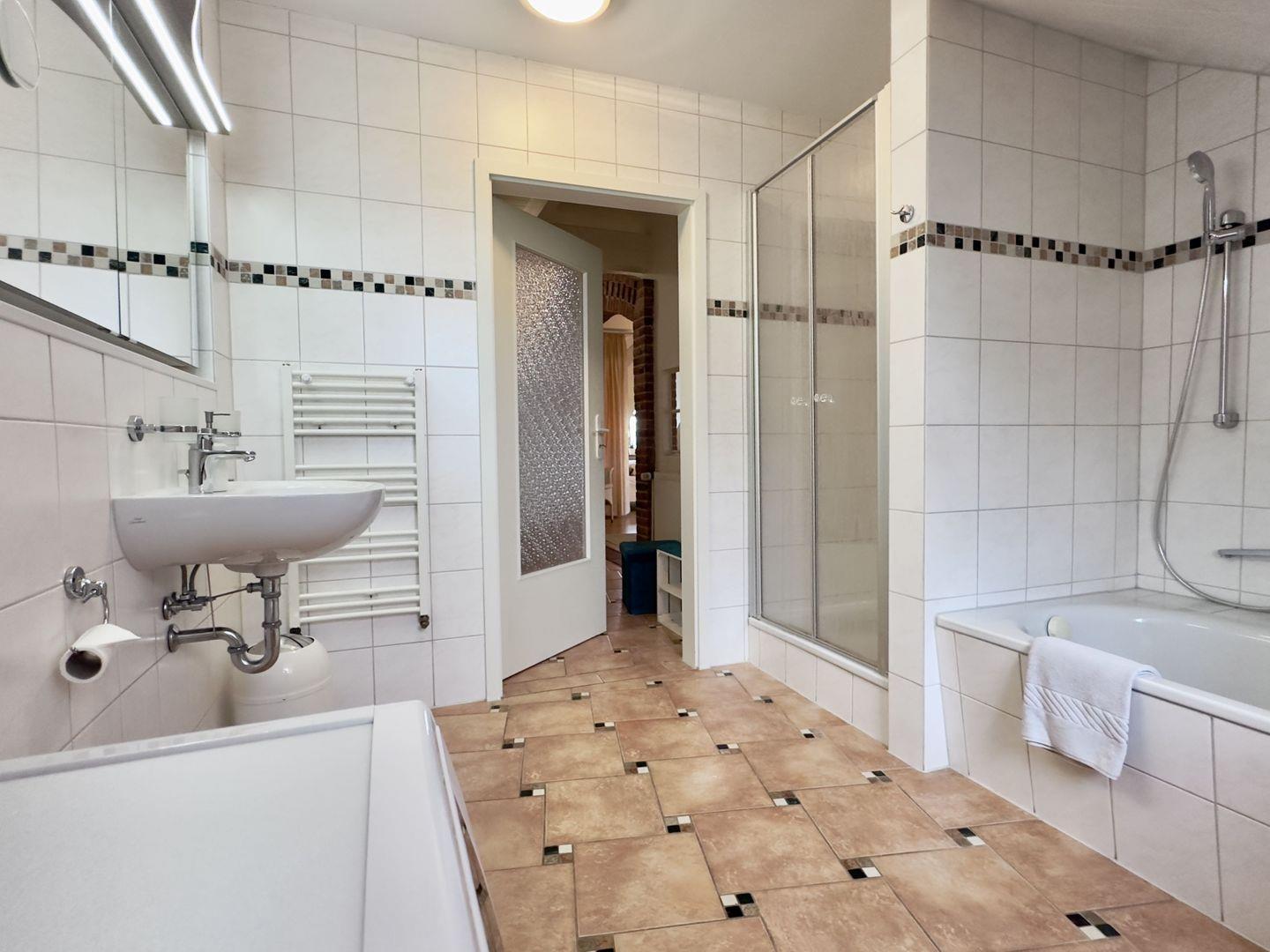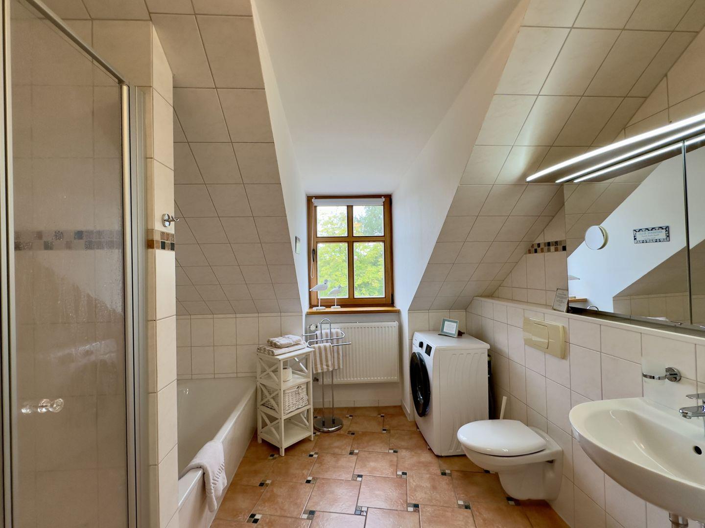 Das Tageslichtbad ist ein weiteres Highlight des Apartments. Es bietet nicht nur eine erfrischende Dusche, sondern auch eine Badewanne, die an stürmischen Tagen oder nach einem langen Tag für wohlige Entspannung sorgt. Ein großer Spiegel und ein Kosmetikspiegel stehen bereit, um Ihre täglichen Pflegebedürfnisse zu erfüllen.