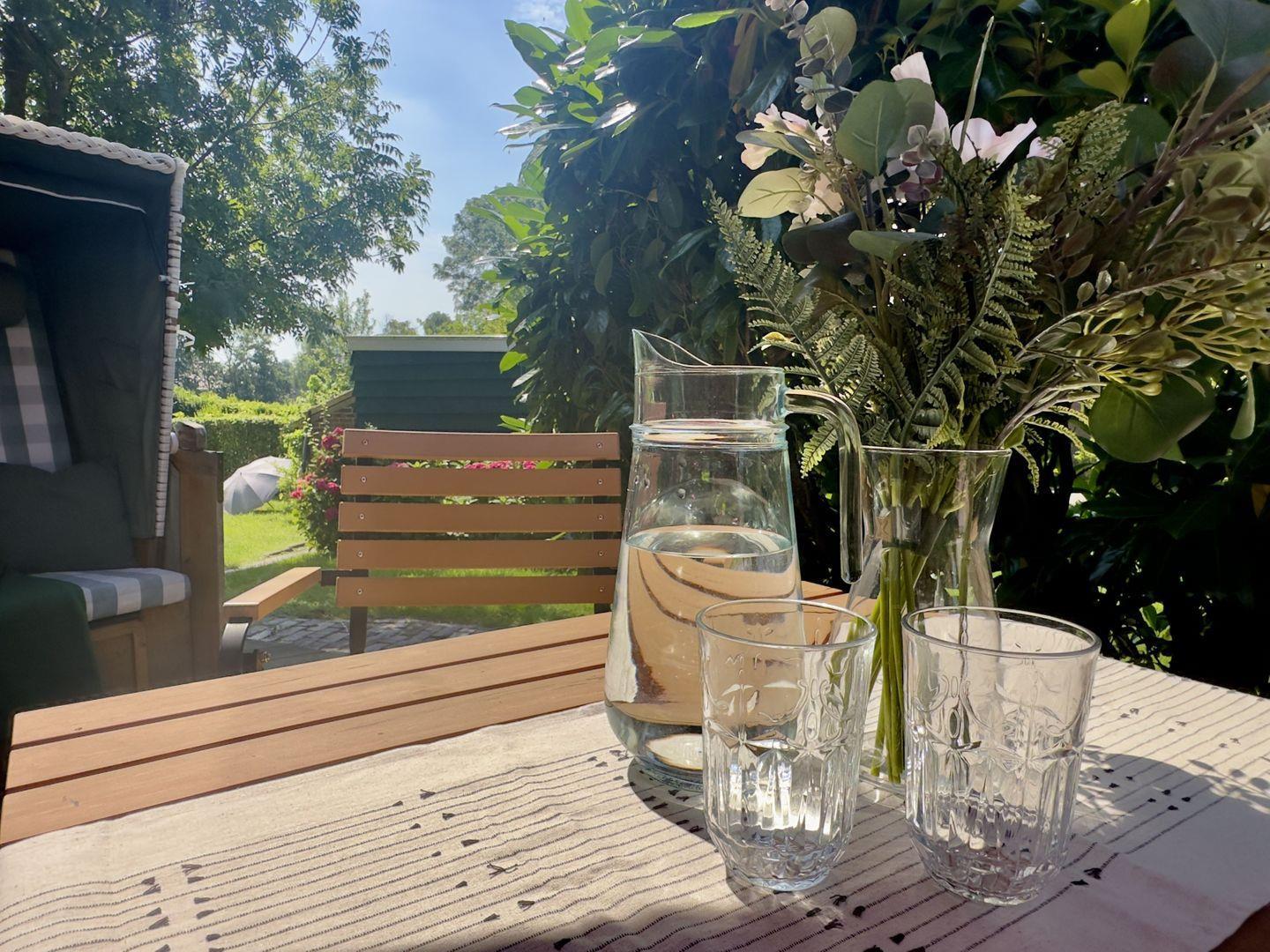 Die Terrasse führt in den wunderschönen Garten des Gulfhofs, wo ein Strandkorb zum Entspannen einlädt.