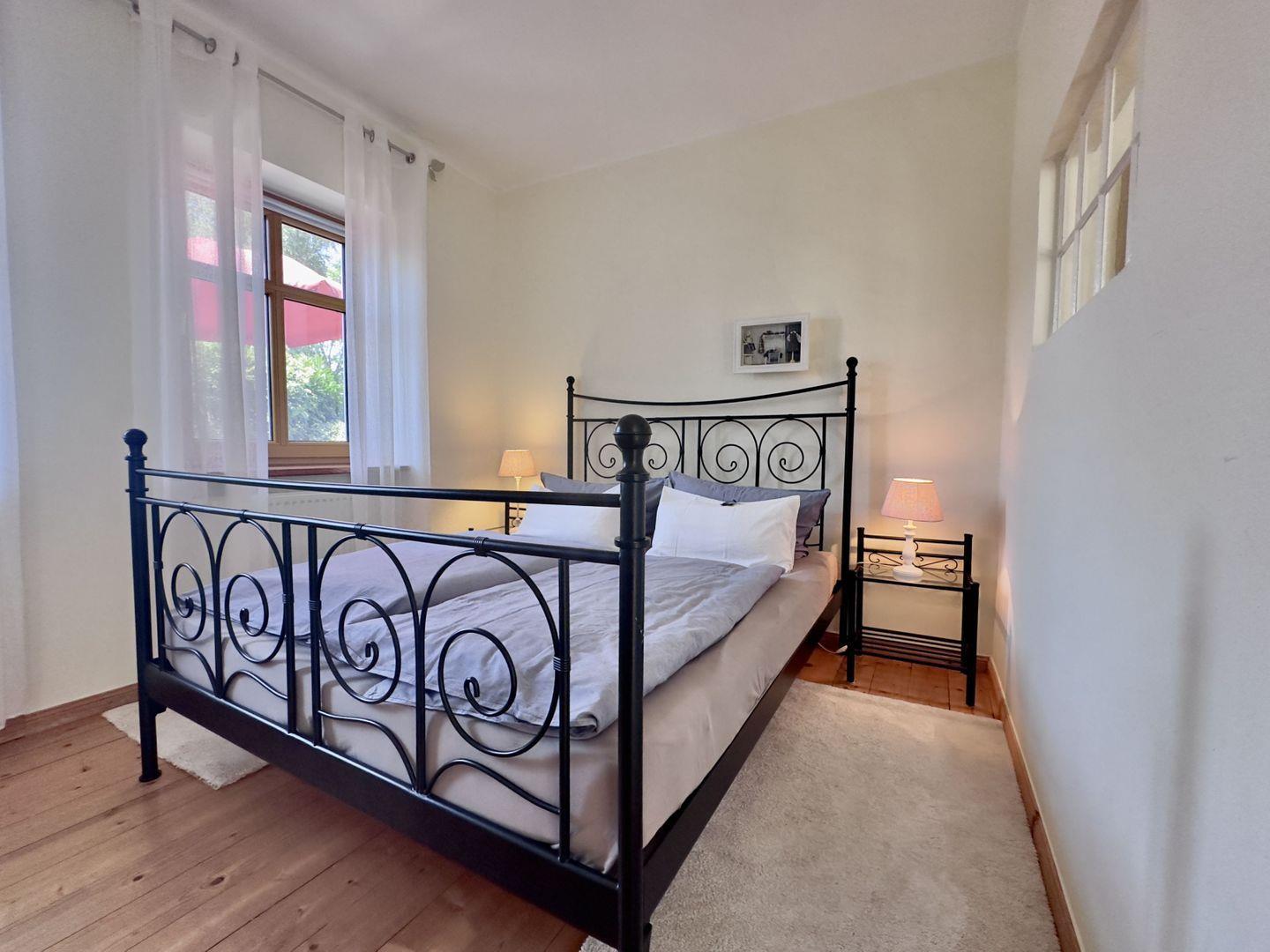 Das angrenzende Schlafzimmer, geschickt in einer Nische des Wohnzimmers verborgen, ist ein besonderer Rückzugsort. Das verschnörkelte Bett und das liebevoll gestaltete Ambiente bieten eine Oase der Entspannung, in der Sie sich geborgen fühlen können.