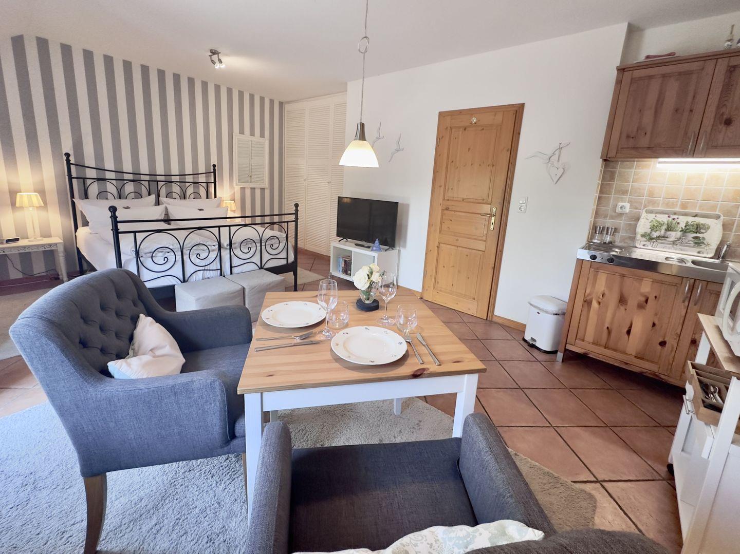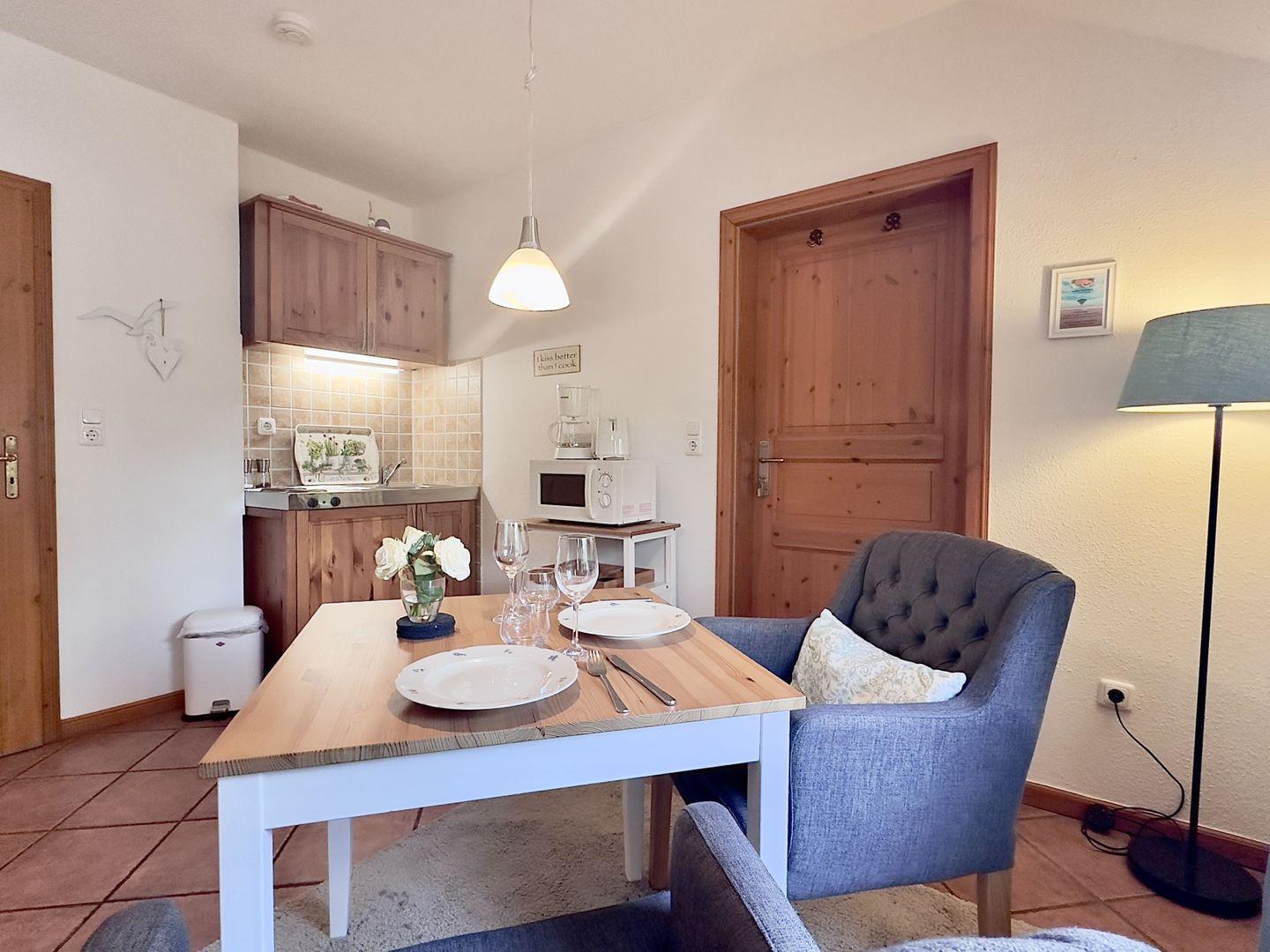Die kompakte Holzküche ist perfekt ausgestattet und lässt keine Wünsche für Ihre Selbstversorgung offen. Hier können Sie Ihre Mahlzeiten zubereiten und den Tag kulinarisch beginnen. Die geschickte räumliche Gestaltung verleiht dem Apartment eine wundervolle Atmosphäre, in der Sie sich sofort wohlfühlen werden.