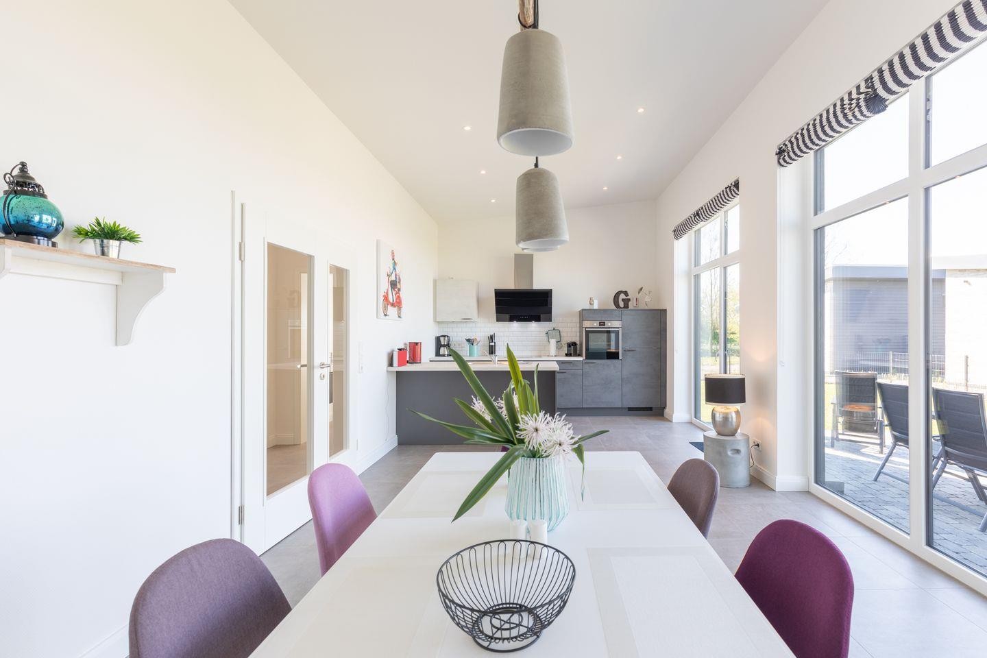 Der großzügige und lichtdurchflutete Wohnbereich erwartet Sie mit einer großen und gemütlichen Rundcouch und Flachbild-TV, einem modernen, schön dekoriertem Essbereich und der offenen, exklusiv ausgestatteten Küche mit Kühlschrank inkl. Gefrierfach, Spülmaschine, Kaffeemaschine und Nespresso Maschine.