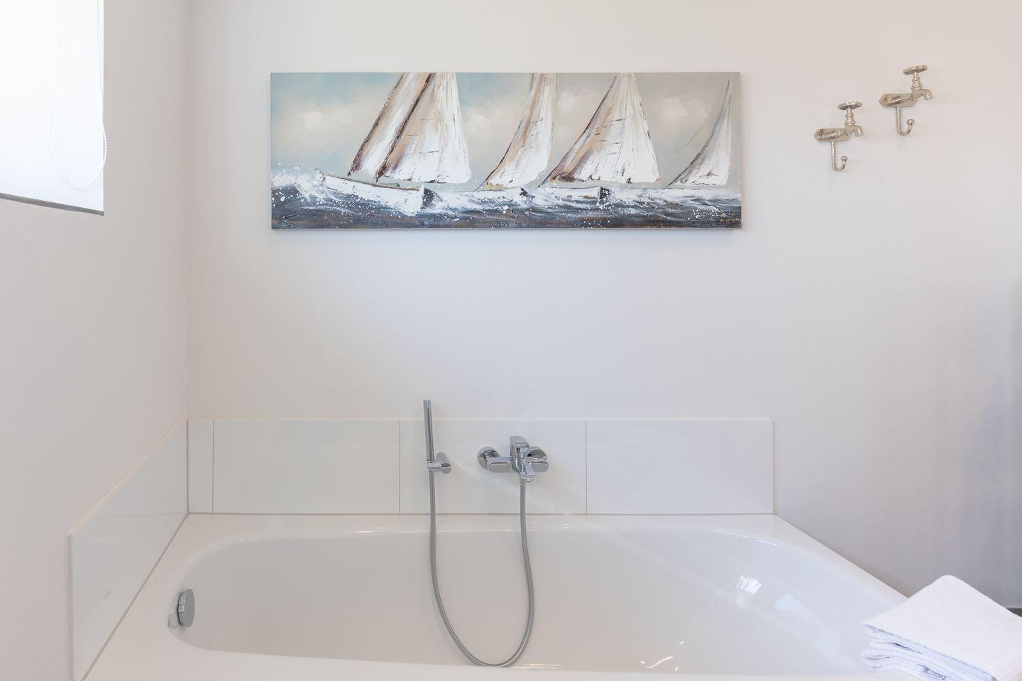 Das große Relax-Bad mit Dusche und Badewanne bietet Ihnen einen direkten Blick auf weite Felder.