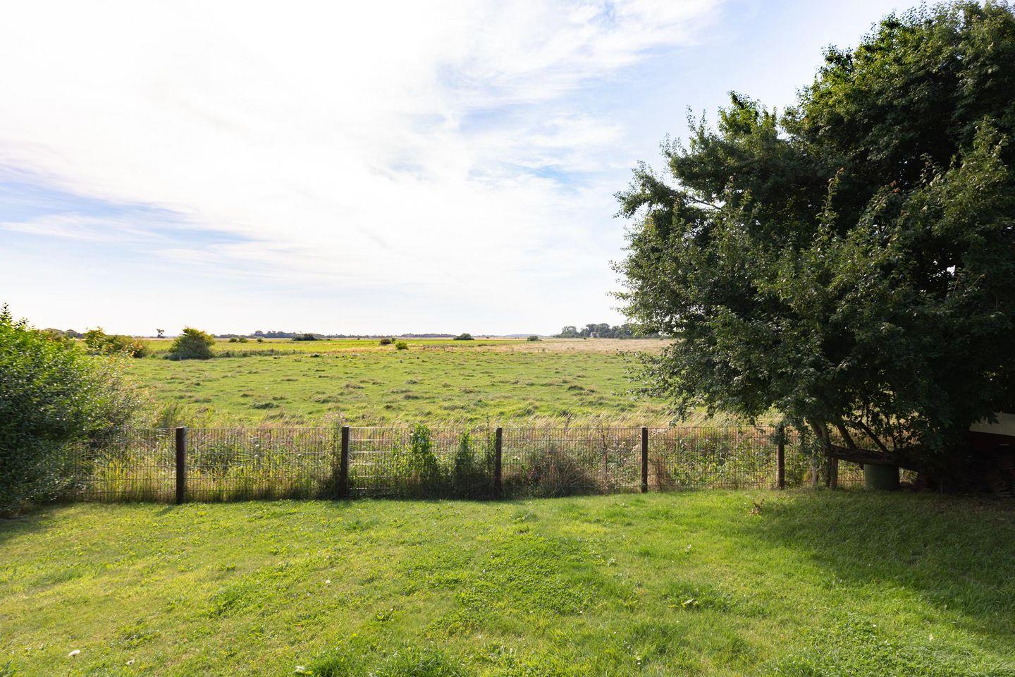 Rechts und links gibt es Nachbarn, nach vorn und hinten ist alles frei bis zum Horizont. Die nach Süd-Südost ausgelegte Terrasse befindet sich auf der straßenabgewandten Hausseite und gibt einen freien Blick in die Natur auf Weiden und Wiesen. Im Garten steht ein Kanu zur Verfügung, welches Gäste gerne für eine Kanufahrt auf dem ca. 500 m entfernten See Hülltofter Tief verwenden dürfen. Während der Vogelzugzeiten liegen die Rastplätze der Tiere oft direkt in Gartennähe und der Himmel ist von zahlreichen Schwärmen übersät. Für Hobbyornithologen gibt es also sowohl direkt am Haus als auch im nahe gelegenen Naturschutzgebiet Gotteskoog einiges zu beobachten.