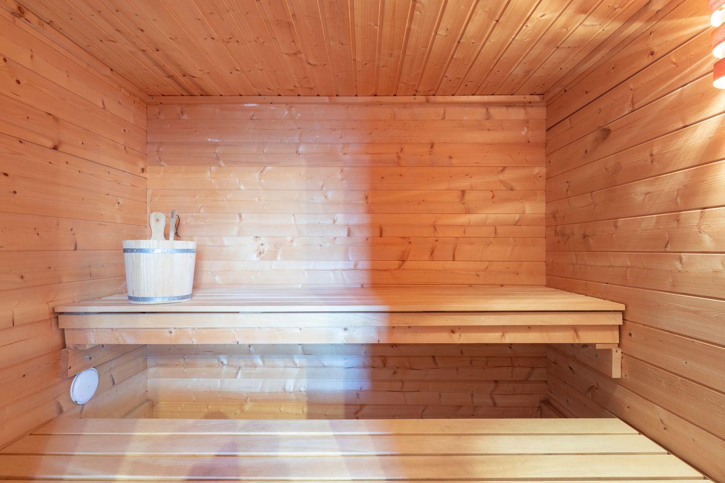 In der unteren Ebene des Hauses befindet sich ein kleiner Eingangsflur, ein großes Bad (inkl. Sauna (gebührenpflichtig: 3 € pro 30 Min.), ebenerdiger Dusche und Badewanne), ein großer Wohn-Küchenbereich mit Ess- und Sofaecke und TV.