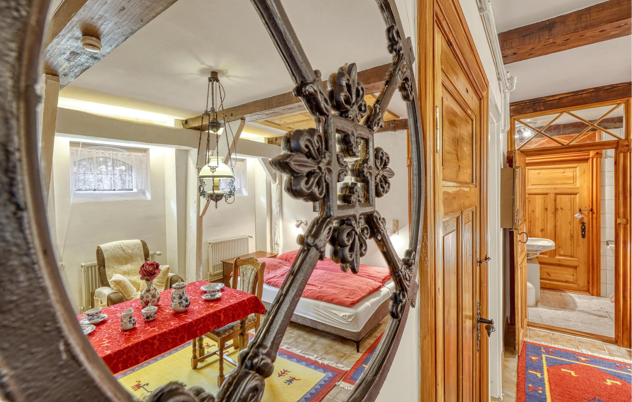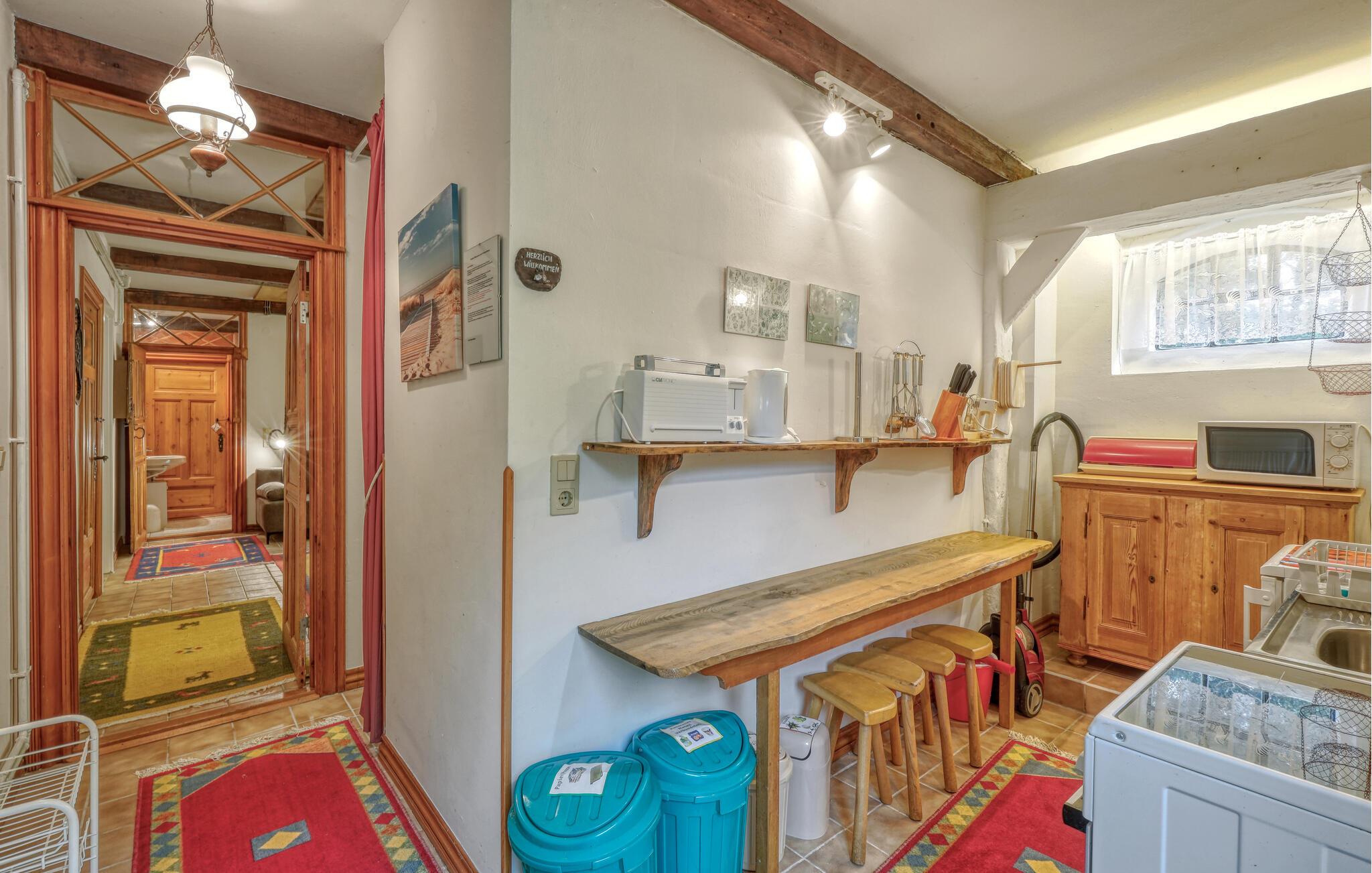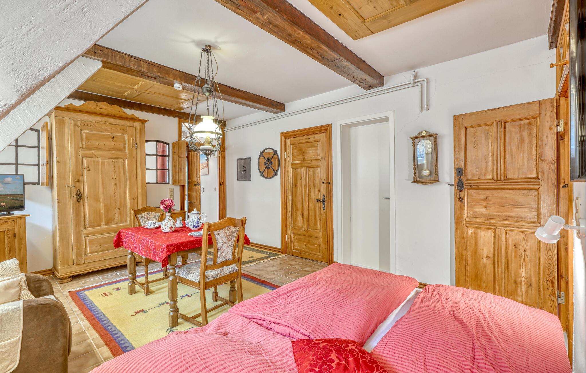 Genießen Sie einen entspannten Urlaub zu zweit in dieser gemütlichen Erdgeschoss-Ferienwohnung, die ländliche Ruhe mit traditionellem Ambiente verbindet. Betreten Sie die helle Wohnung und fühlen Sie sich sofort wohl. Entspannen Sie im großzügigen Wohnzimmer mit bequemen Sitzgelegenheiten, gemütlicher Einrichtung und einem charmanten Mix aus traditionellen Holzelementen und freundlichen Farben. Nutzen Sie die kleine, gut ausgestattete Küche, um sich kulinarisch selbst zu versorgen, und nehmen Sie Ihre Mahlzeiten direkt am Esstisch ein.