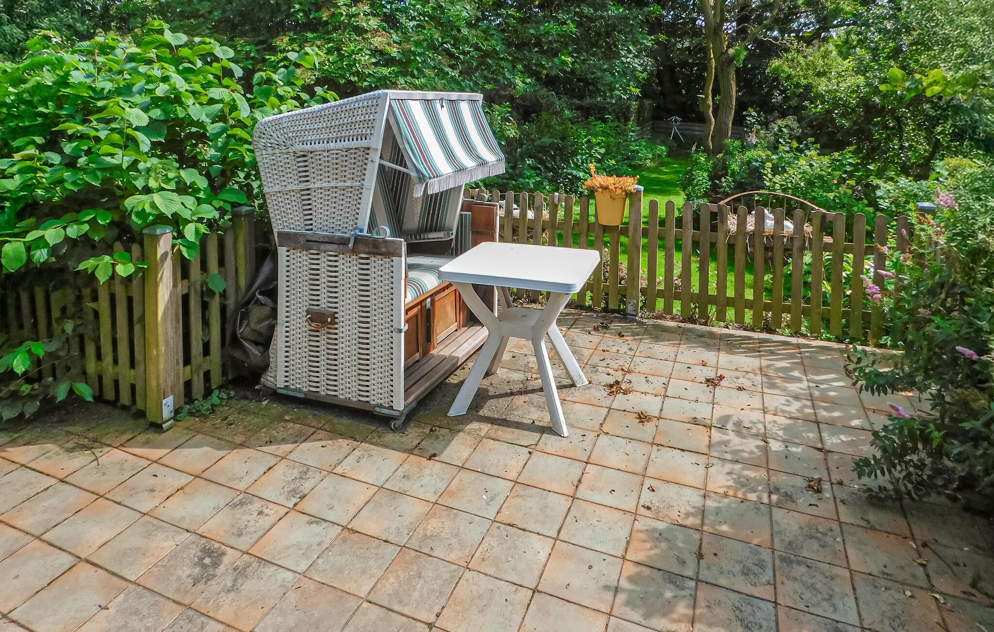 Treten Sie hinaus in den liebevoll gestalteten Außenbereich. Machen Sie es sich im Strandkorb oder auf der Terrasse bequem und genießen Sie den Blick auf den Garten. Nutzen Sie den geschützten Sitzbereich, um bei jedem Wetter Zeit im Freien zu verbringen, und lassen Sie die Seele zwischen Blumen, dekorativen Elementen und friesischem Ambiente baumeln.