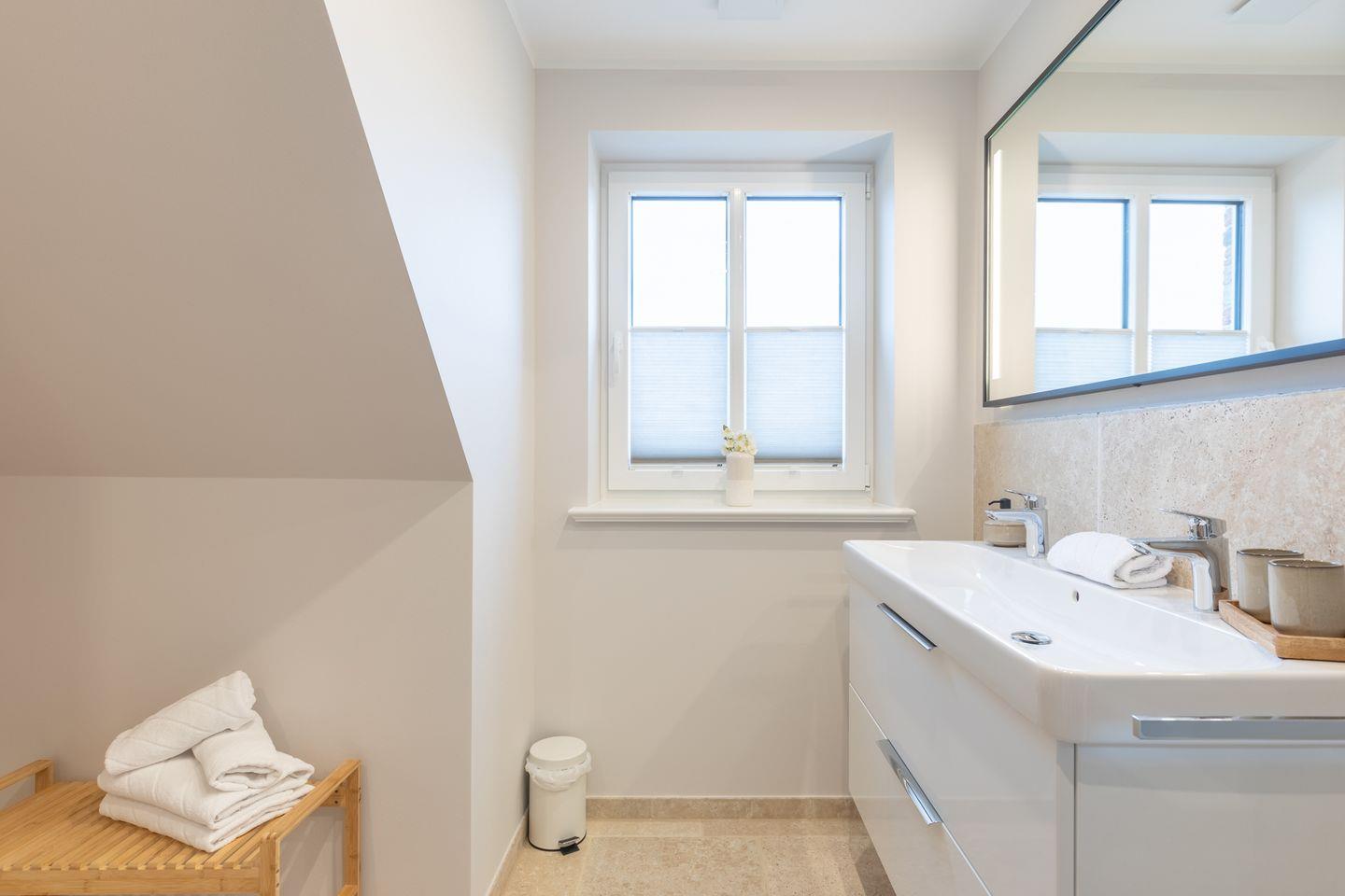 Im Erdgeschoss stehen Ihnen ein Duschbad mit ebenerdigem Zugang und ein Hauswirtschaftsraum mit Waschmaschine und einem Trockner zur Verfügung.