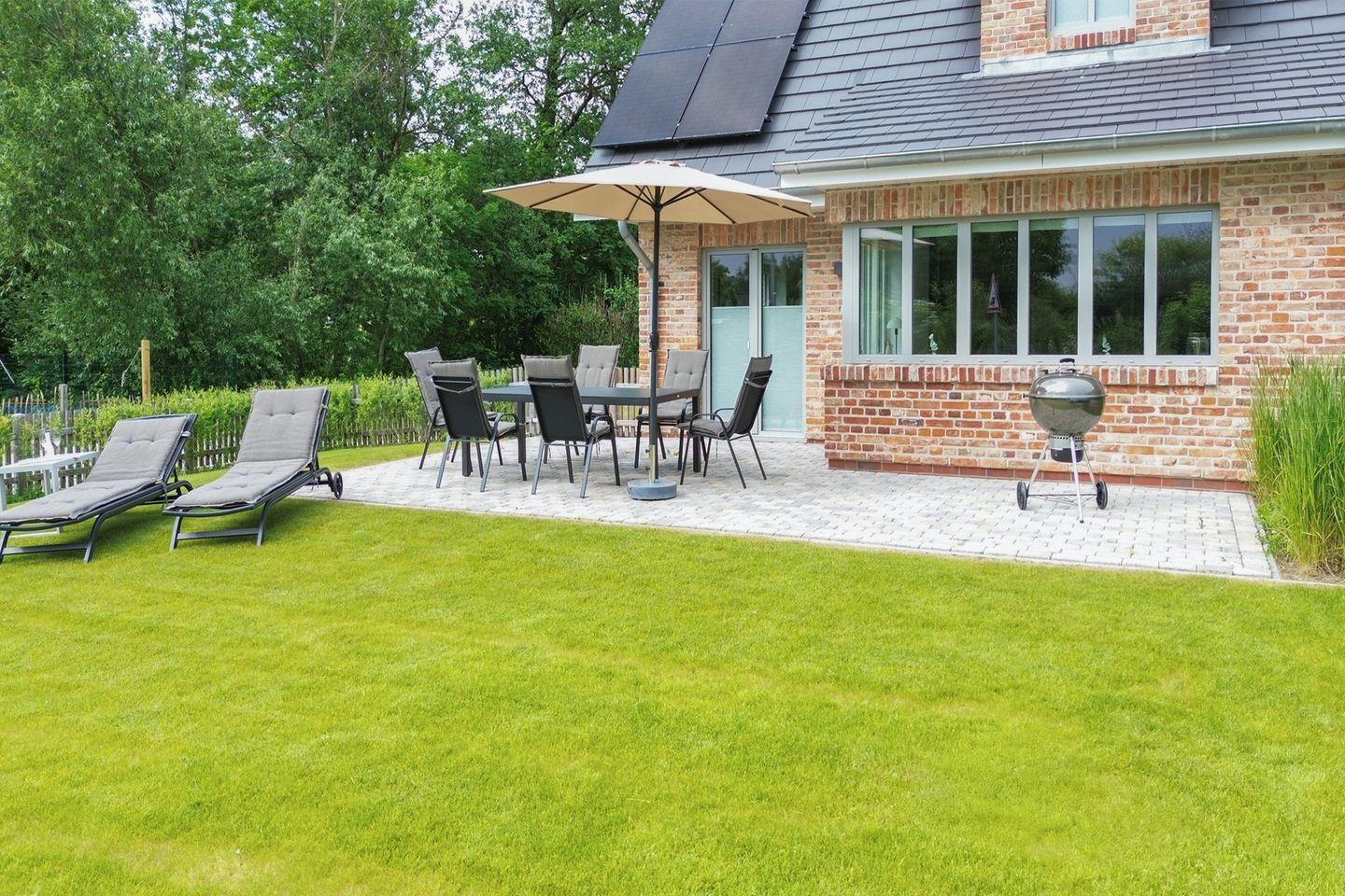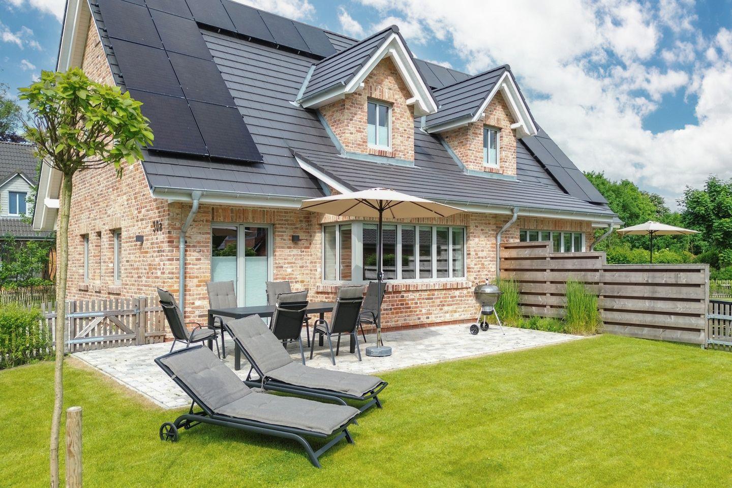 Modernes Biikehuus West in Niebüll mit Sauna, eingezäuntem Garten und E-Bike-Ladestation für erholsamen Nordseeurlaub.
