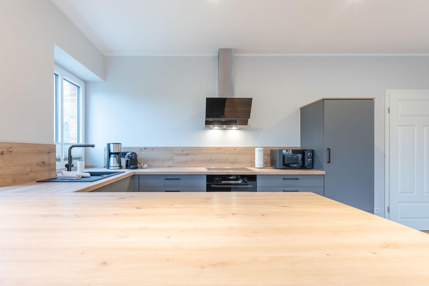 Der großzügige Wohnbereich lädt mit einer schönen Sofalandschaft (Schlafcouch) zu gemütlichen TV-Stunden ein. Die offene Küche ist sehr gut ausgestattet: Geschirrspüler, Kühlschrank, Gefrierfach, Backofen, Induktionsherd, Dunstabzugshaube, Weinkühlschrank, Nespresso-Maschine, Filterkaffee-Maschine (Filtergröße 4), Wasserkocher und ein Toaster.