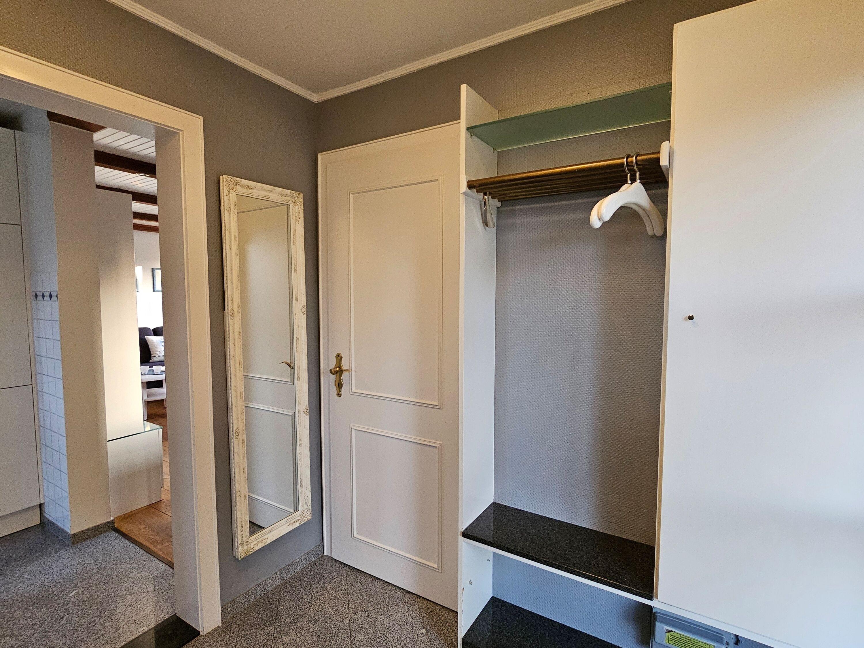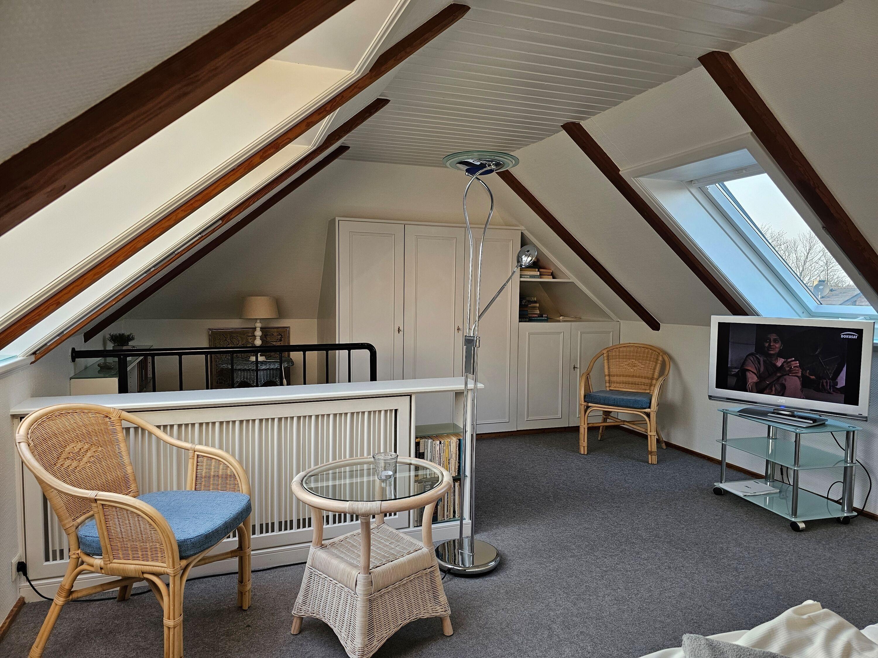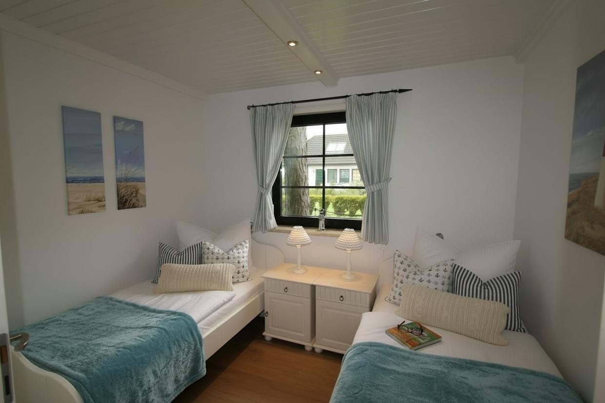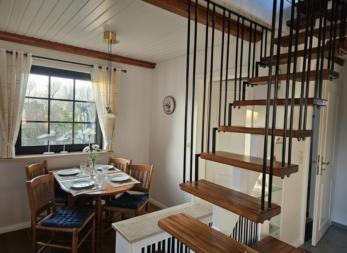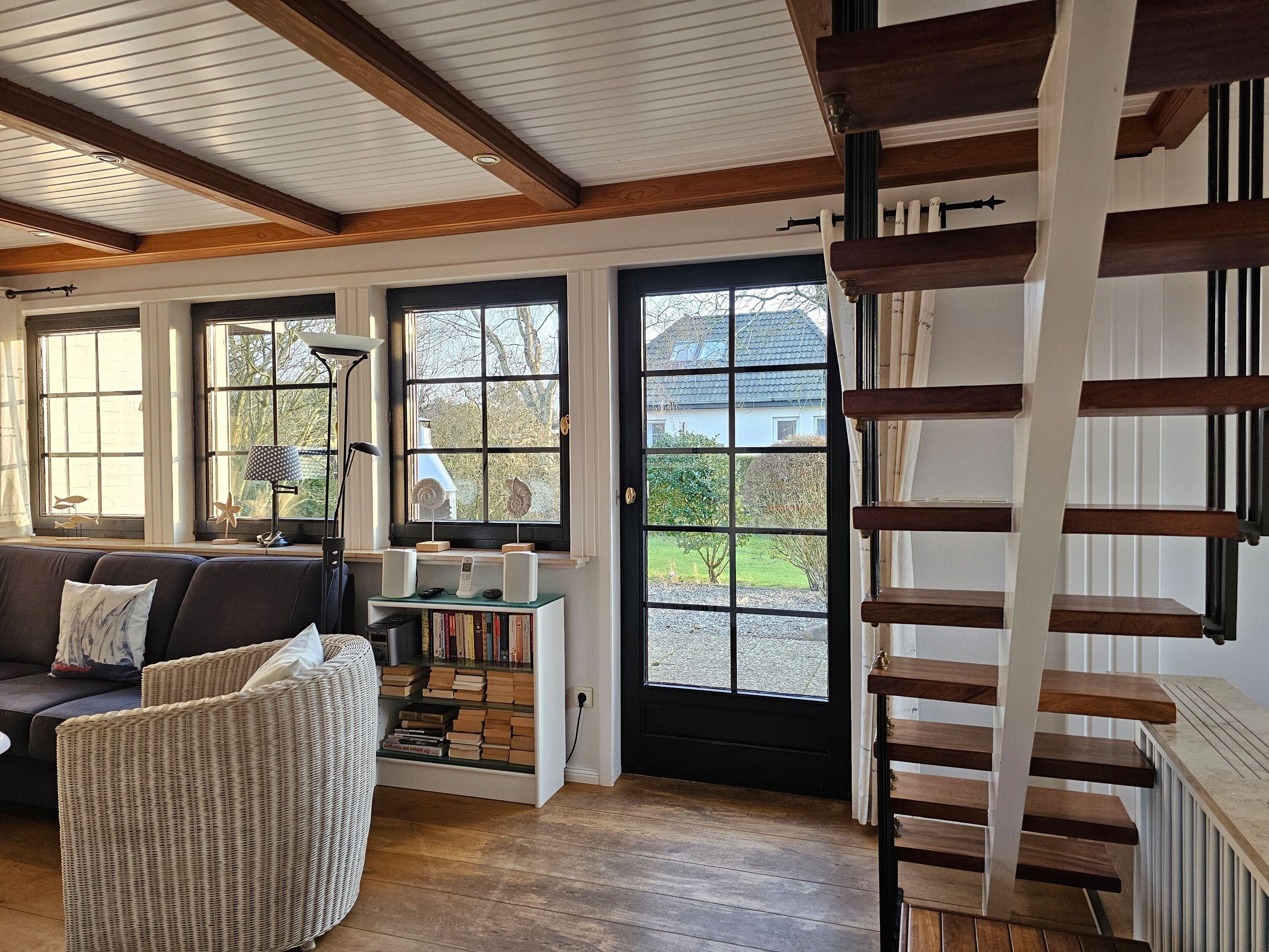Im Erdgeschoß des Hauses befindet sich eine voll ausgestattete, separate Küche, eine Essecke, eine gemütliche Couch, ein Schlafzimmer und ein Duschbad mit separatem WC. Auf der Terrasse mit angrenzendem Garten stehen Gartenmöbel sowie ein Strandkorb (während der Saison) und ein Grill zur Verfügung. Im Abstellraum sind Waschmaschine und Trockner zur kostenfreien Nutzung vorhanden. Im Obergeschoss gibt es ein großzügiges Schlafzimmer mit einem zweiten Fernseher. Bei der Treppe vom EG ins OG handelt es sich um eine Raumspartreppe.