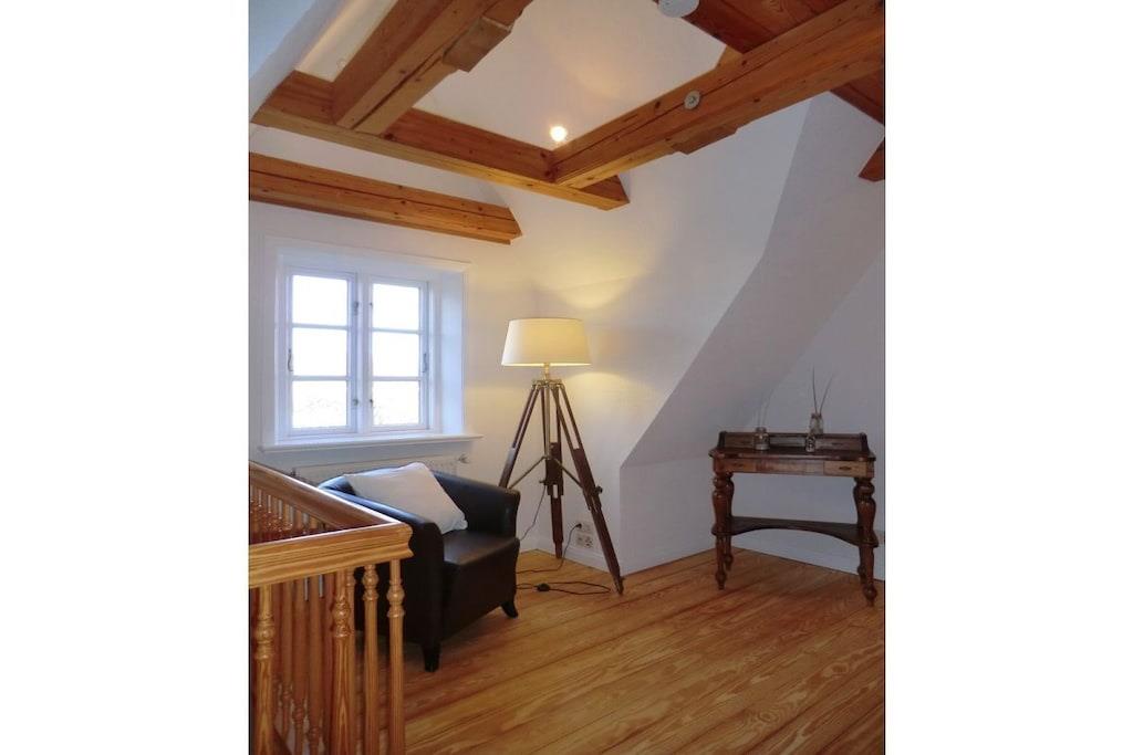 Erdgeschoss: Eingangsdiele mit Aufgang in das Dachgeschoss, Gäste/WC, voll ausgestattete offene Küche mit Tresen zum hellen Wohn- und Esszimmer mit TV und Kamin sowie Ausgang auf die Terrassen in Süd- und Ostausrichtung mit Gartenmöbeln und Liegen, Schlafzimmer mit Doppelbett und eigenem Duschbad/WC, Hauswirtschaftsraum mit Waschmaschine und Trockner. Dachgeschoss: Lesegalerie, Schlafzimmer mit Doppelbett und herrlichem Ausblick auf den Dorfteich, drittes Schlafzimmer mit zwei Einzelbetten und weiterem Flat-TV, Dusch- und Wannenbad/WC.
