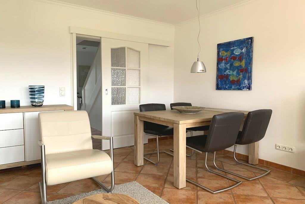 In absolut strandnaher Lage zwischen Nieblum und Wyk befindet sich dieses exklusive Endhausteil unter Reet auf einem großzügigen Grundstück in einer ruhigen Sackgasse. In unmittelbarer Nähe befindet sich der Golfplatz, der als einer der schönsten Deutschlands gilt. Aufteilung: Erdgeschoss: Eingangsflur mit Treppenaufgang in das Dachgeschoss, Küche, Duschbad/WC mit Fenster, Wohn-/Esszimmer mit Flat-TV und Ausgang auf die sonnige Südterrasse. Dachgeschoss: Schlafzimmer mit Doppelbett und weiterem Flat-TV, Schlafzimmer mit zwei Einzelbetten
