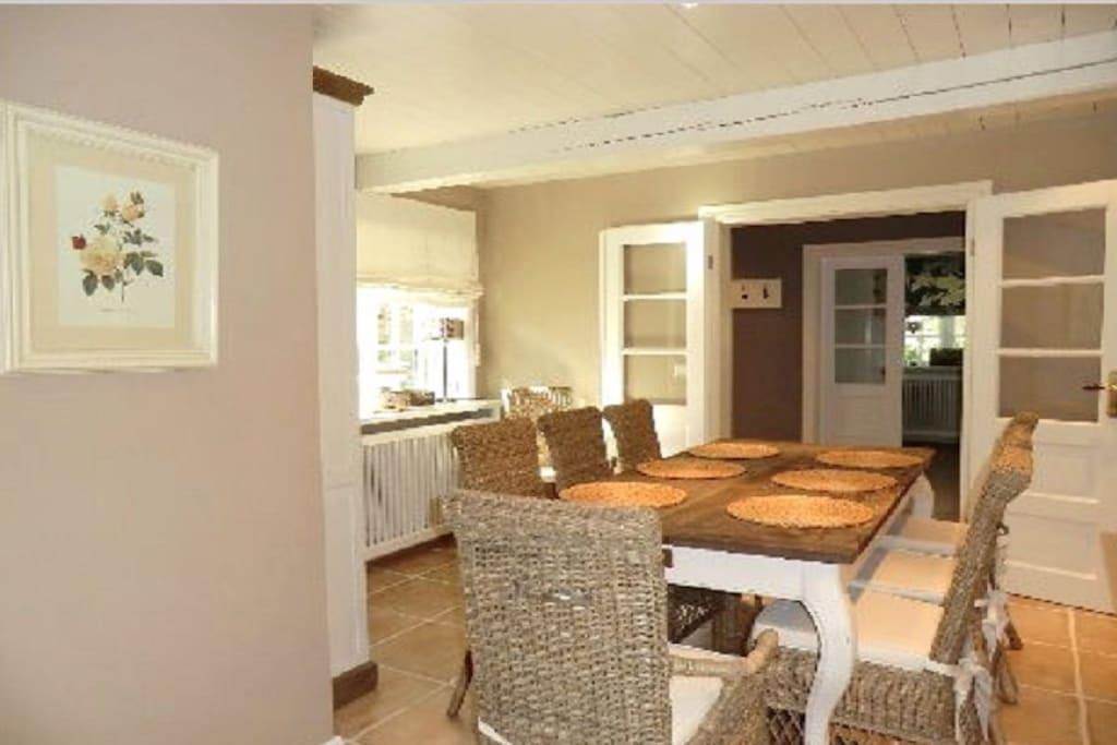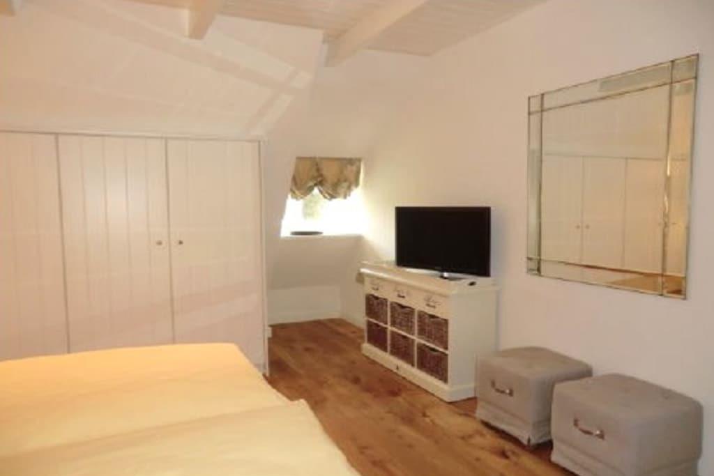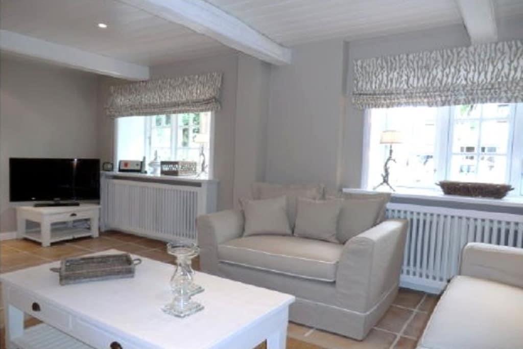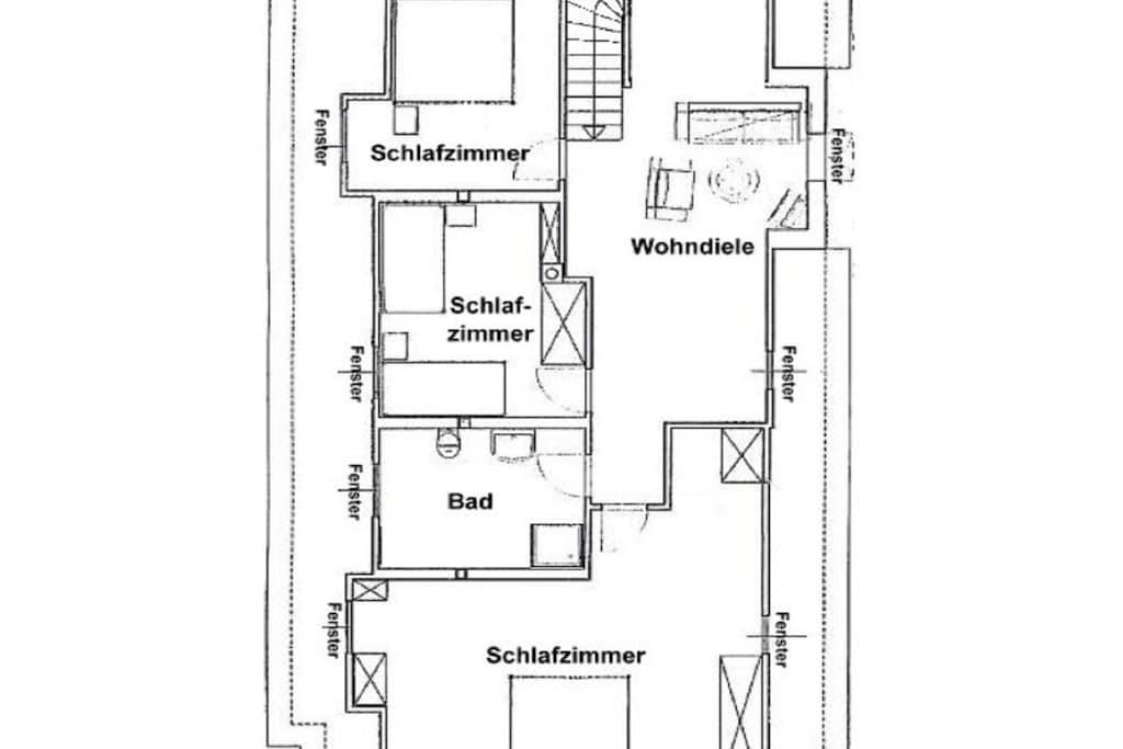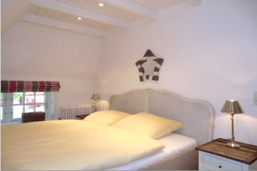 Erdgeschoss: Große Eingangsdiele mit Garderobe, Gäste-WC, große Komfortküche, Wohnzimmer mit hist. Kachelofen, Musikanlage und großem Flat-TV, Esszimmer, Schlafzimmer mit Doppelbett, Duschbad/WC mit “Rainshower”, Ausgang in den Garten. Dachgeschoss: Großzügige und gemütliche Wohndiele mit Lesesessel und stilvollem Arbeitsplatz im hellen Giebelbereich, Schlafzimmer mit Doppelbett, Schlafzimmer mit zwei Einzelbetten, viertes Schlafzimmer mit Doppelbett und Flat-TV, Duschbad/WC mit “Rainshower” sowie zwei Waschtischen.