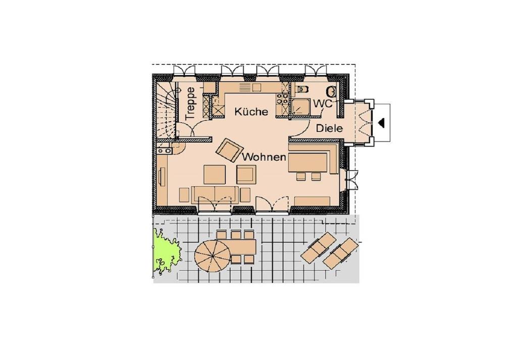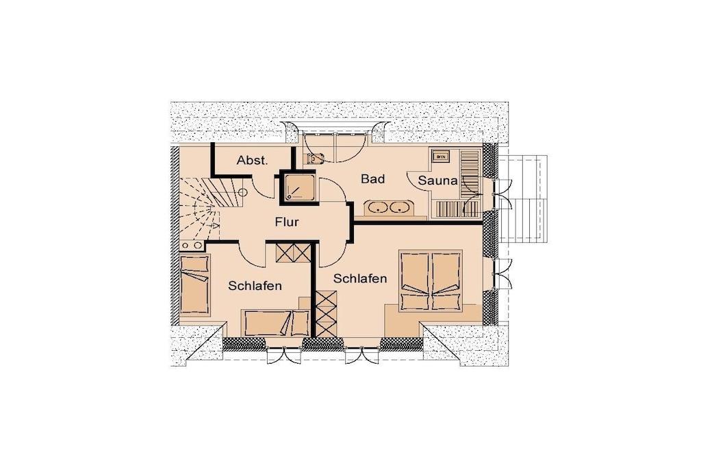 Eingangsdiele mit Garderobe, Duschbad/WC, helles Wohn- und Esszimmer mit Mylin Kachelofen, TV und DVD-Player, vollausgestatteter offenen Küche und Ausgang auf die Terrasse / in den Garten in Süd- und Ostausrichtung, Flur mit Waschmaschine und Trockner sowie Aufgang in das Obergeschoss. Obergeschoss: Schlafzimmer mit Doppelbett und zweitem TV, Duschbad/WC mit Sauna, zweites Schlafzimmer mit zwei Einzelbetten. Dachgeschoss: Spiel- / Aufenthaltsraum mit weiterem kleinen TV.