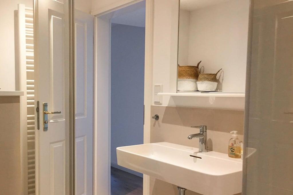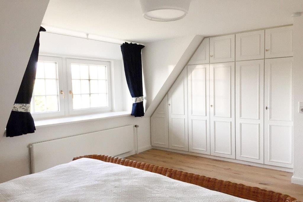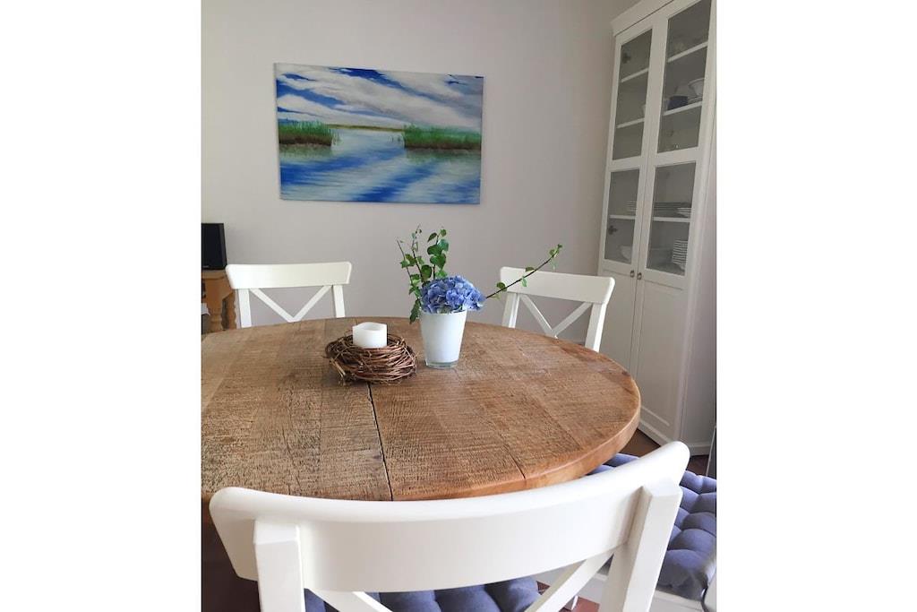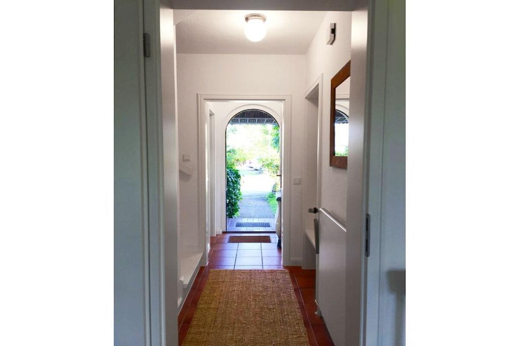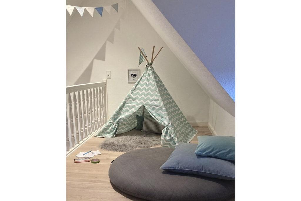 Durch den Flur gelangt man in das große Wohn- und Esszimmer, welches durch bodentiefe Fenster viel Licht und freie Sicht bietet. Durch die Terrassentür erreicht man von hier aus auch den eigenen Garten und die neu gepflasterte Terrasse mit Tisch und Stühlen. Das große Sofa lädt neben Flat TV zum Ausruhen ein, der Original Mylin-Ofen mit wunderschöner Optik durch handgefertigte Kacheln und glänzendem Messing, spendet im Winter angenehme und wohlige Wärme. An dem runden Holztisch im Essbereich haben bequem 5 Leute Platz, (ein Triptrap-Hochstuhl steht zusätzlich zur Verfügung) und ist gut von der neuen Küche aus zu erreichen. Dort kann man optimal in der modern und voll ausgestatteten Einbauküche (u.a. mit Bora-Induktionskochfeld, Geschirrspüler, Backofen und Bosch Haushaltsgeräten) alle Art von Speisen zubereiten. Vom Flur aus (hier befindet sich u.a. ein Gäste-WC) gelangt man über die hellen Holztreppen in die oberen Etagen. Hier befinden sich die Schlafräume mit einem Doppelbett und einem großen Einbauschrank sowie drei Einzelbetten. Im Dachgeschoß befindet sich zusätzlich ein schöner Spielbereich. Alle Räume können für eine angenehme Nachtruhe optimal verdunkelt werden. Ein Baby-Reisebett kann bei Bedarf aufgestellt werden. Das helle und ansprechende Badezimmer mit großzügiger Dusche erlaubt einen frischen Start in den Tag für die ganze Familie. Ein separater, zweiter Duschraum erlaubt das gleichzeitige Duschen.