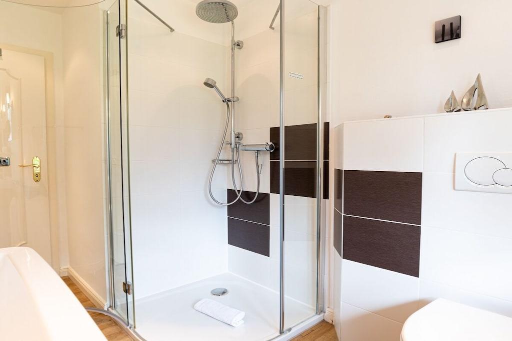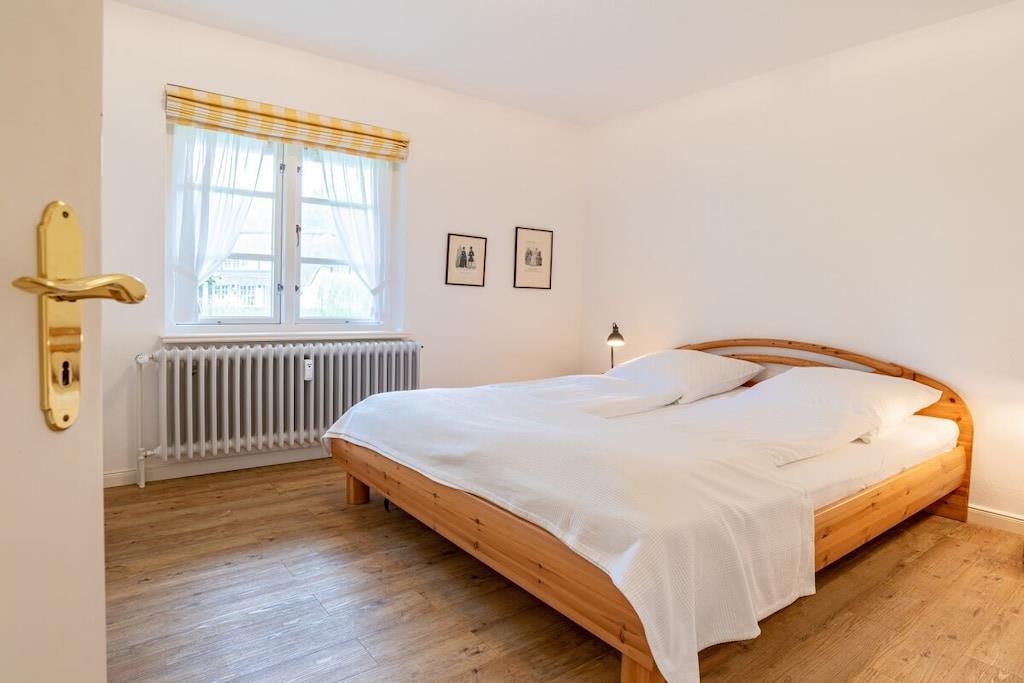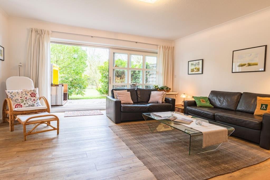 Flur mit Garderobe, Abstellraum mit Waschmaschine, Duschbad/WC, Schlafzimmer mit Doppelbett, Schlafzimmer mit Ausziehbett und kleinem Arbeitsplatz, Wohnzimmer mit Ausgang auf die sonnige Südterrasse mit Gartenmöbeln (Strandkorb von Ostern bis Oktober) und Übergang in den voll ausgestatteten Küchenbereich mit Essplatz.