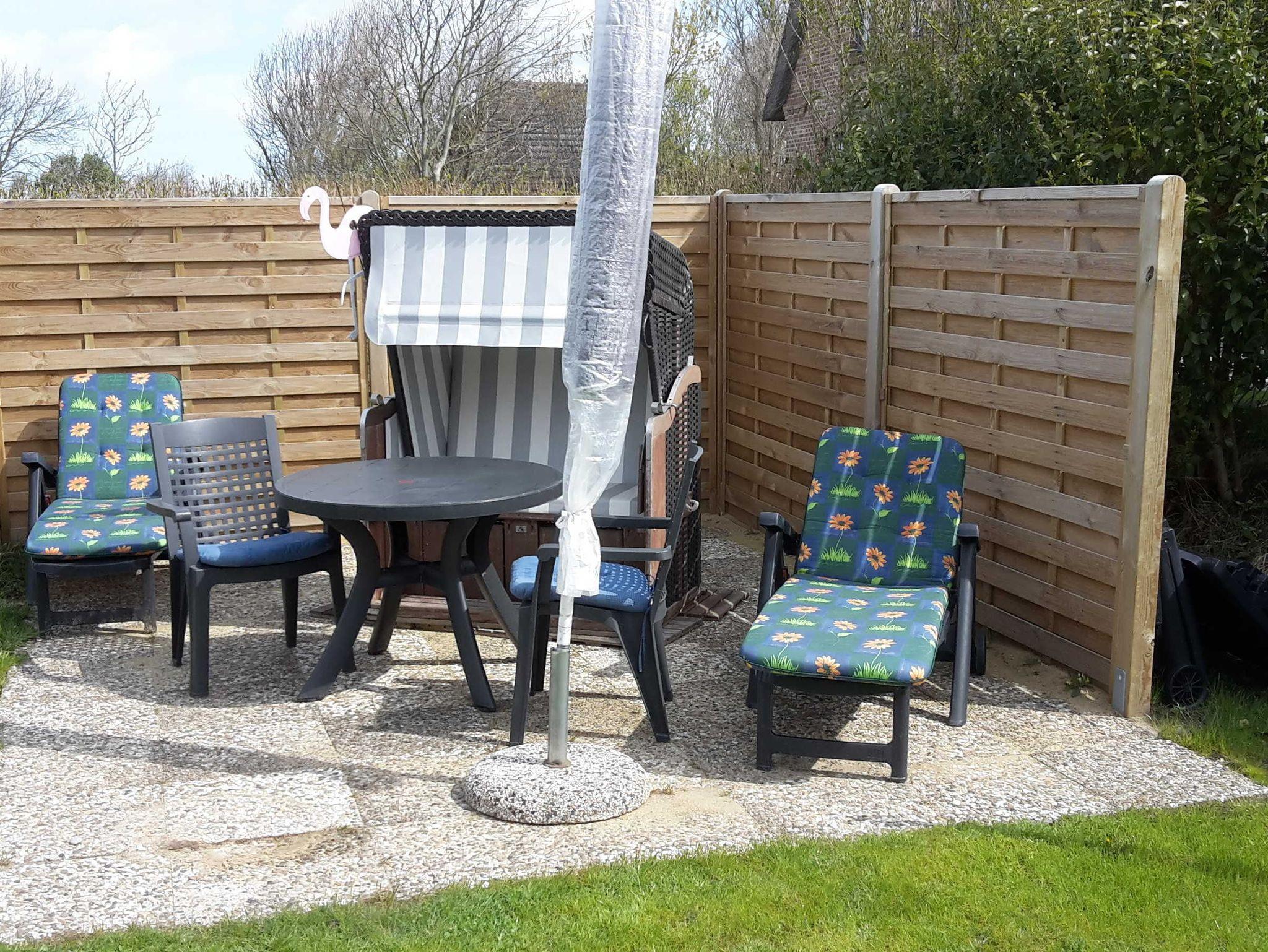 Zu jeder Fewo gehört eine Terrasse mit Strandkorb und Gartenmöbeln.