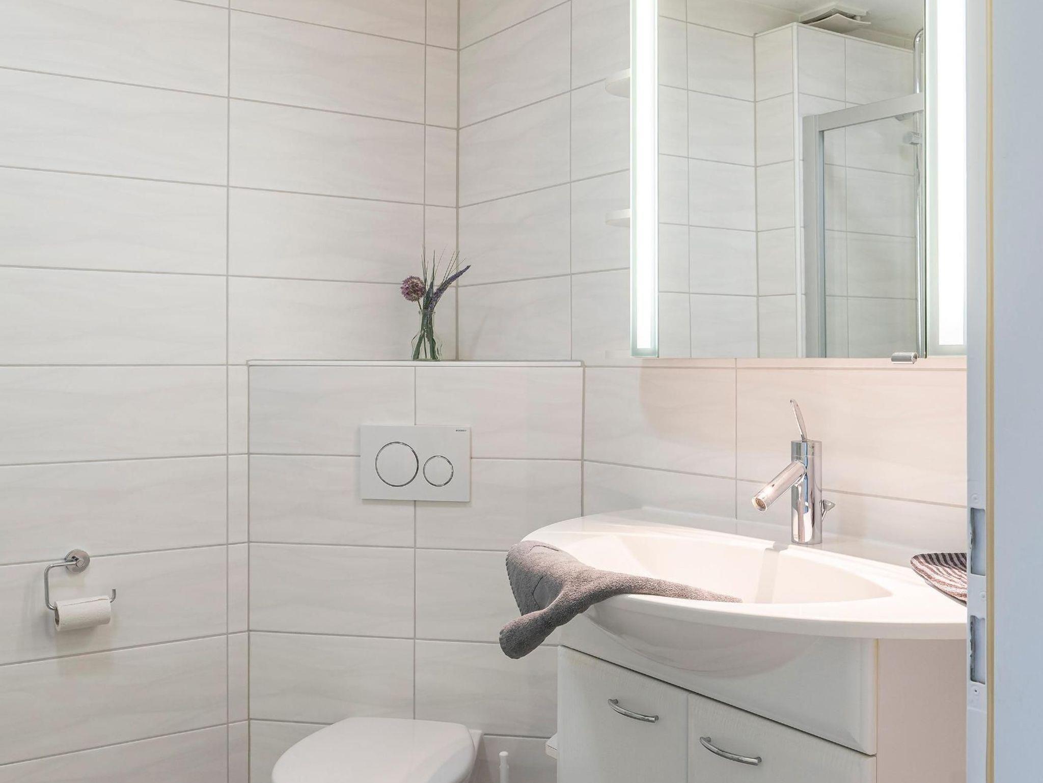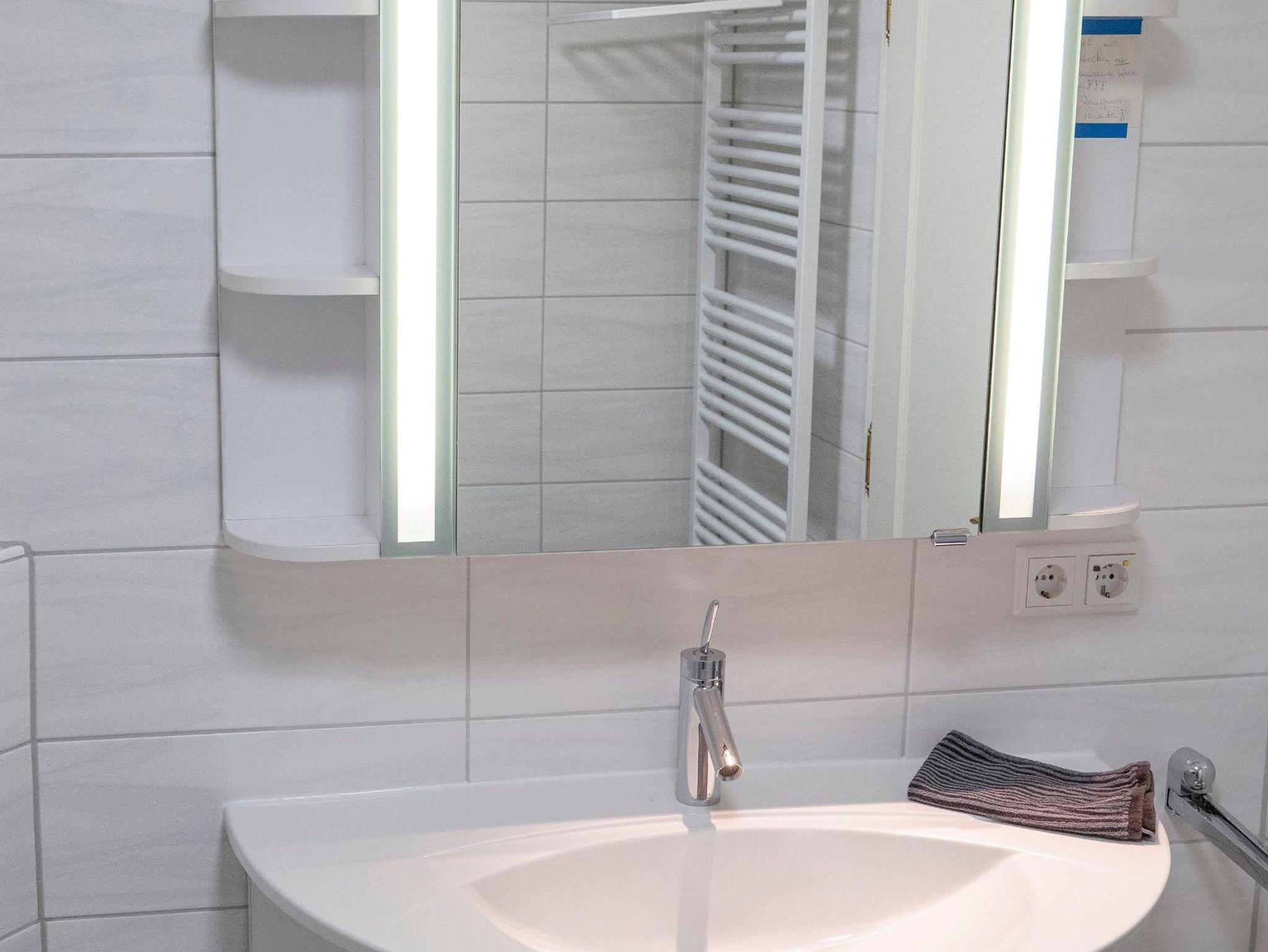 Sanitär: bodenebene Dusche, Föhn, Handtuchheizkörper, Schminkspiegel.
