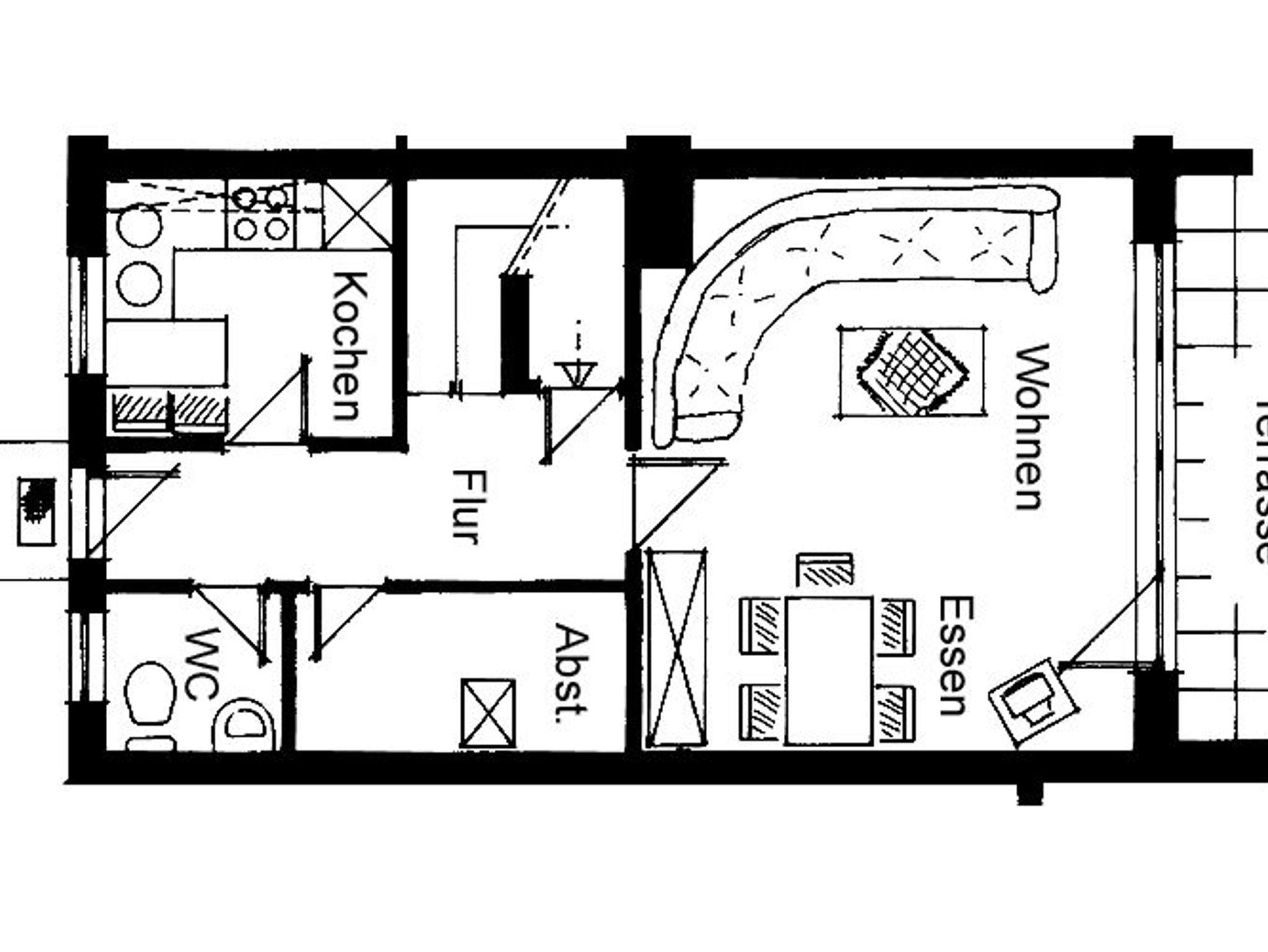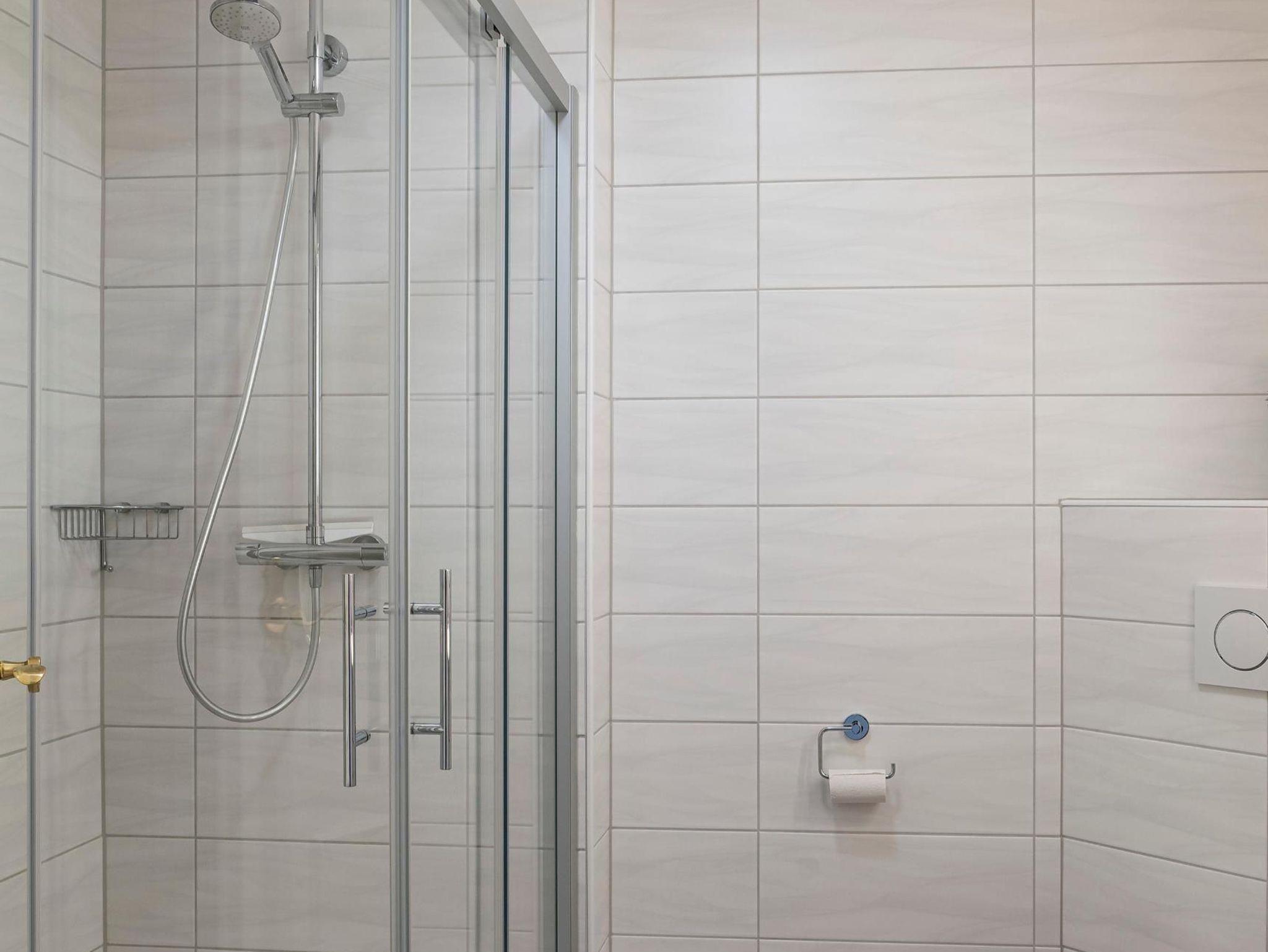 Raumaufteilung: 1 Schlafraum (1 Doppelbett), 1 Schlafraum (2 Einzelbetten), 1 Wohnraum, 1 Flur, 1 separate Küche, 1 Badezimmer mit Dusche, 1 zusätzliches WC, 1 Abstellkammer.