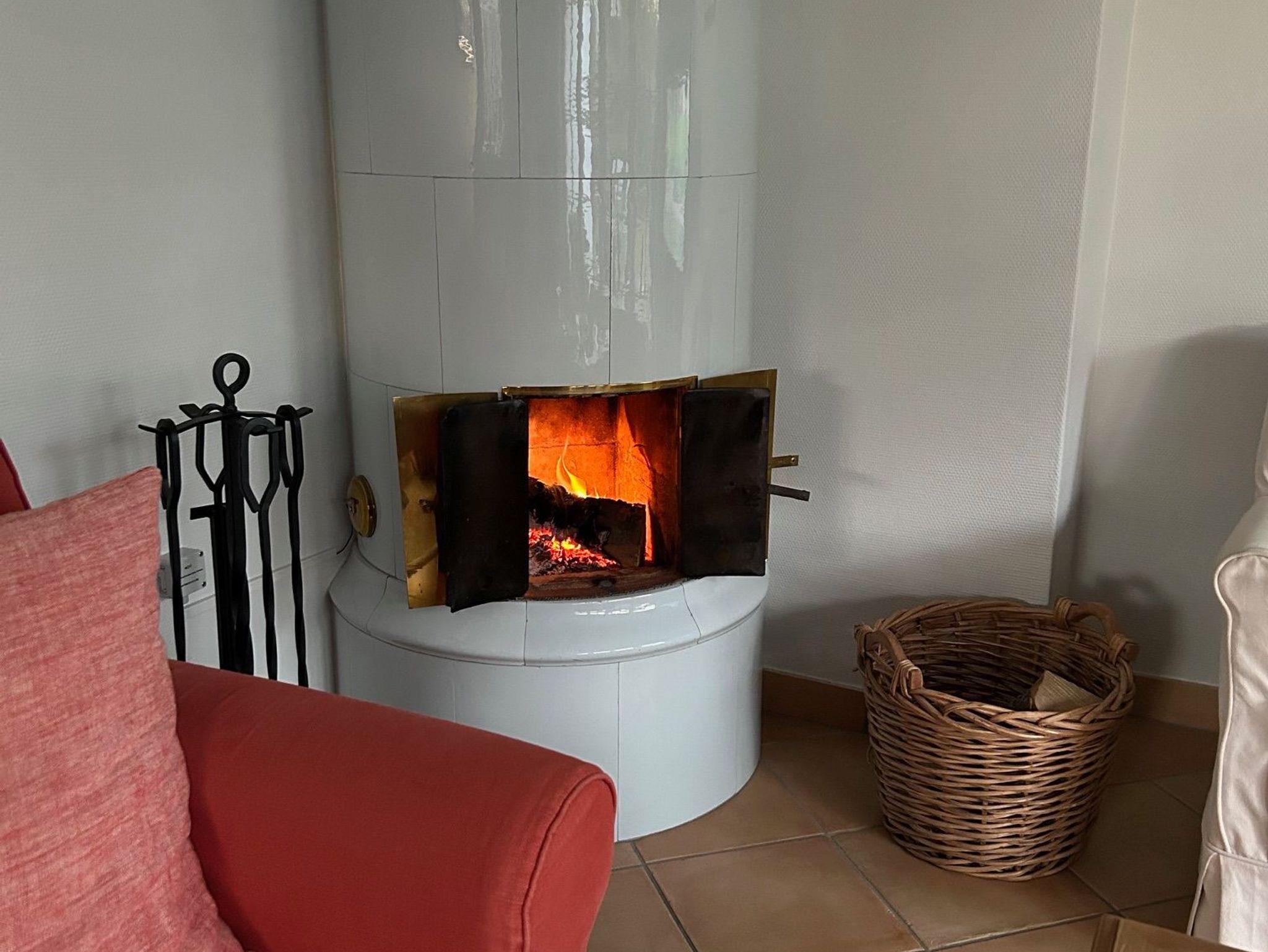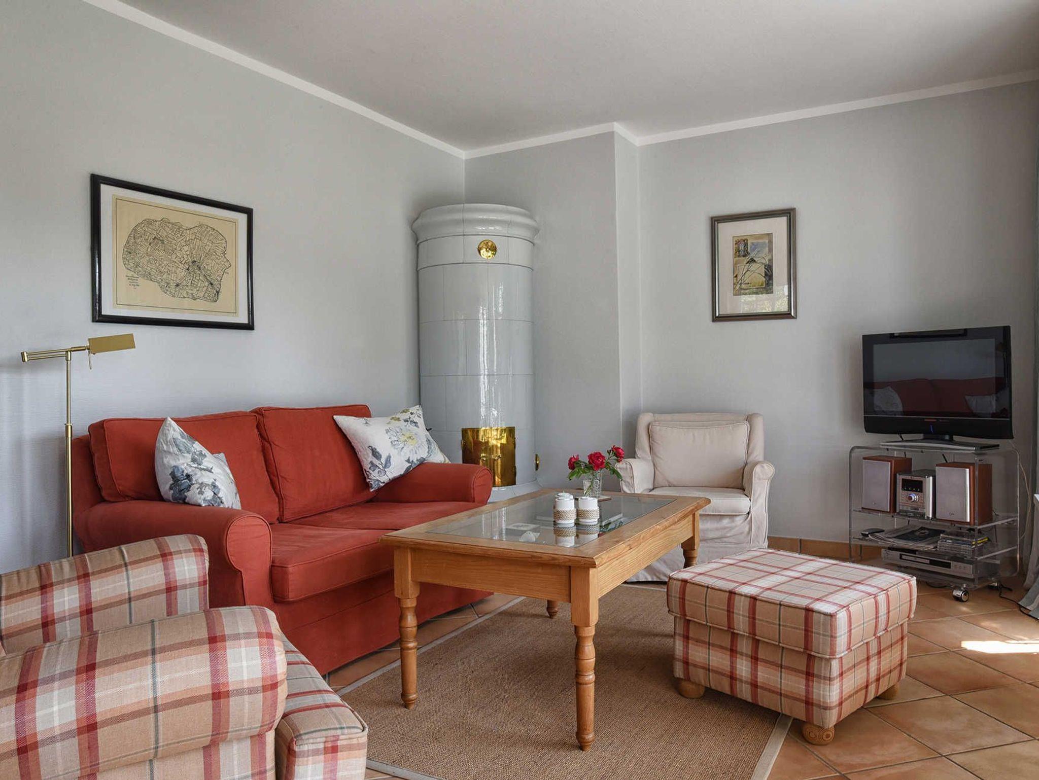 Vom ebenerdigen Flur geht es rechts in die Küche. Links liegt das Gäste-WC. Der Wohnraum ist unterteilt in einen Bereich mit Sitzecke und Kachelofen sowie einem Essbereich. Zur Küche besteht eine Verbindung über eine Durchreiche. Im Wohnraum befindet sich eine Musikanlage sowie ein Flachbildfernseher mit Satellitenempfang.