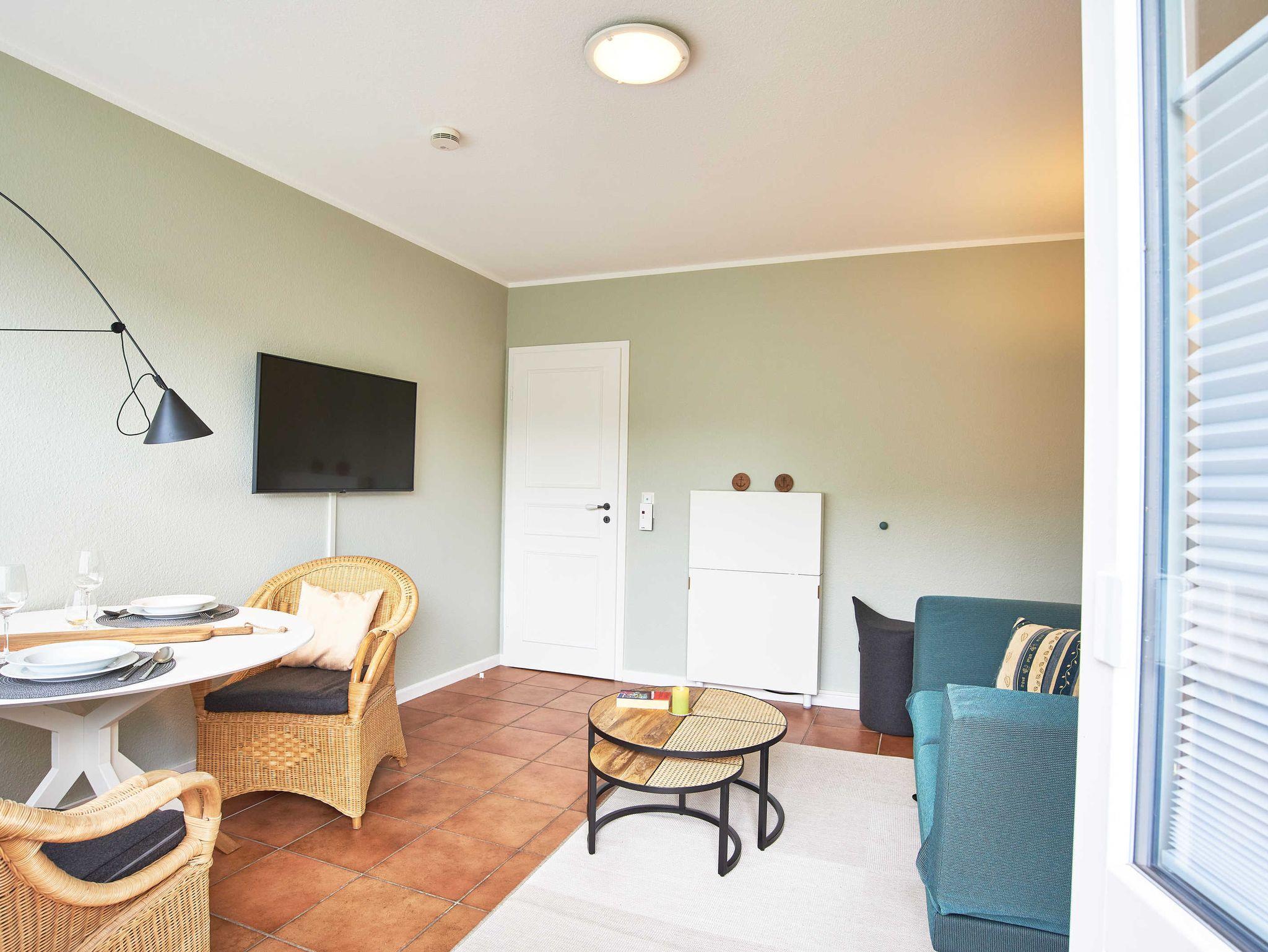 Das lichtdurchflutete Wohnzimmer hat große Fenster nach Süden. Ein runder, variabel einstellbarer Esstisch mit zwei Korbsesseln lädt zu ausgedehnten Mahlzeiten ein. Das sehr variable, diskrete Designer-Sofa wartet auf Liebhaber ausgedehnter Lese-Abende. Oder sind Sie im Home-Office? Ein cleverer Designer-Sekretär mit integriertem Licht, Steckdosen und USB-Anschluss sorgt für angenehmes Arbeiten. Für moderne Unterhaltung sorgen ein NanoCell Smart-TV von LG (2022) und Wlan. Vom Wohnzimmer aus gelangen Sie über eine Glastür auf die großzügige, ruhige Terrasse, die den ganzen Tag in der Sonne liegt und einen ruhigen, schönen und weiten Blick ins Grüne bietet. Auflagen für die Sitzmöbel finden Sie in der Truhe.