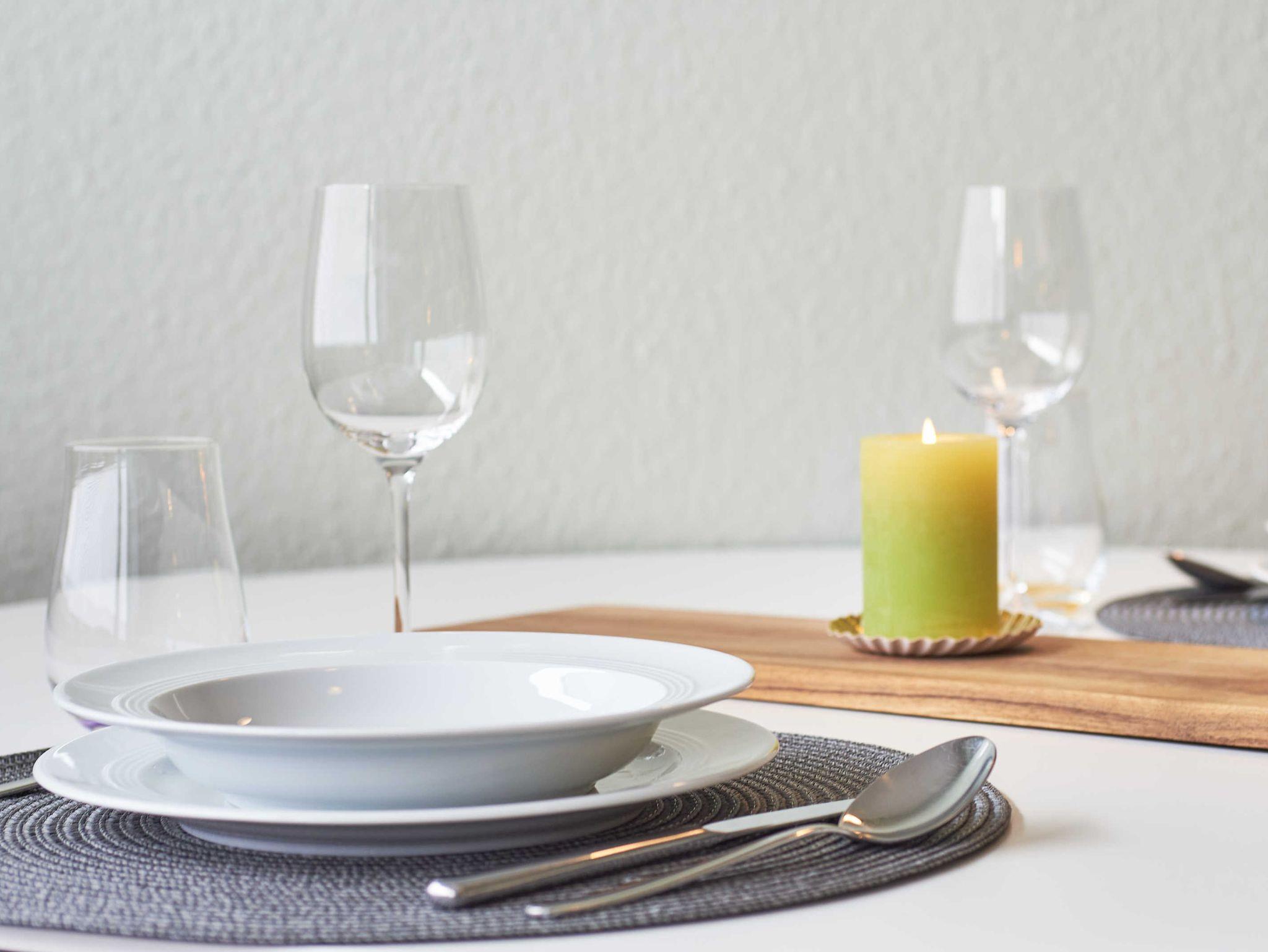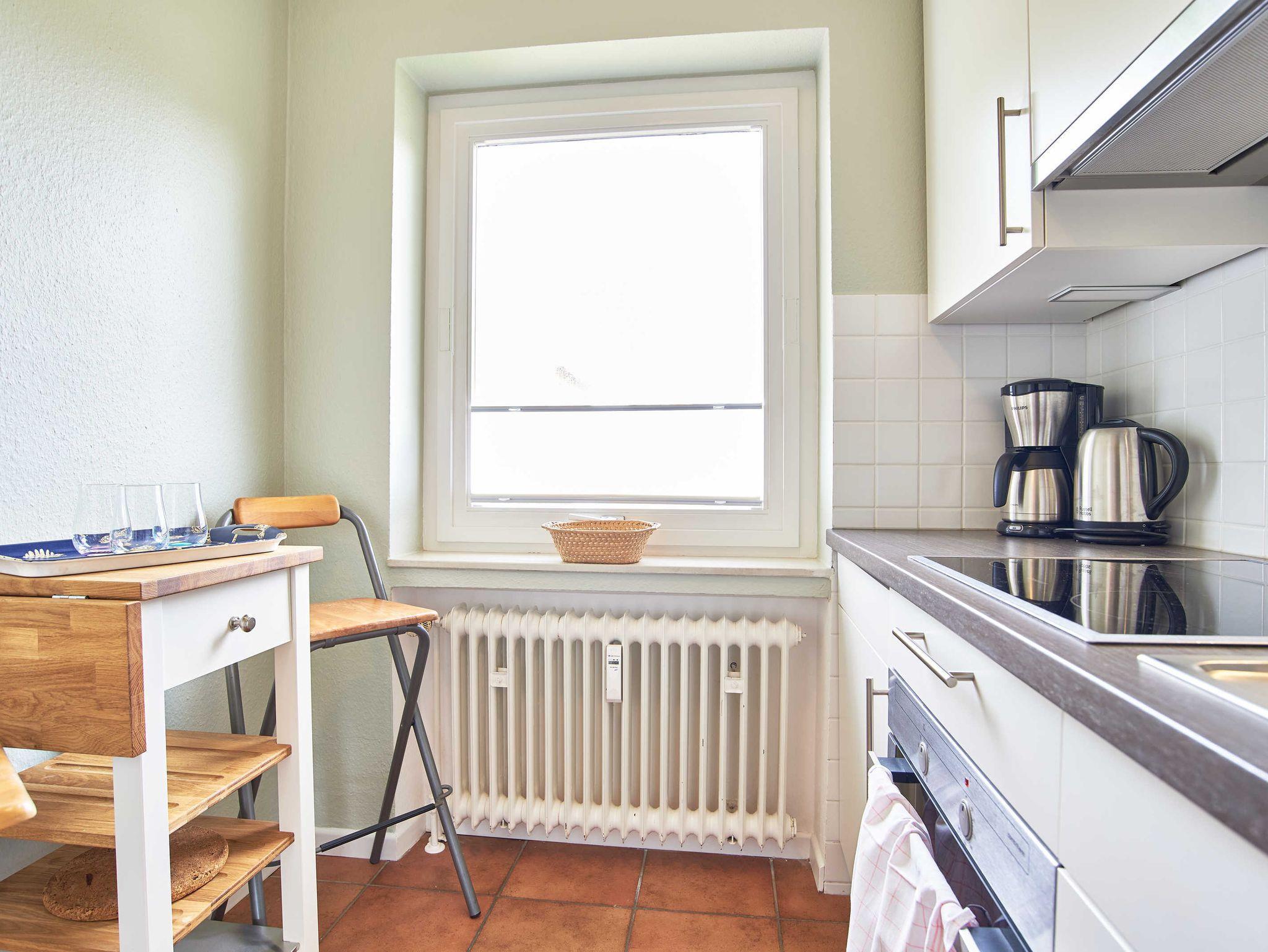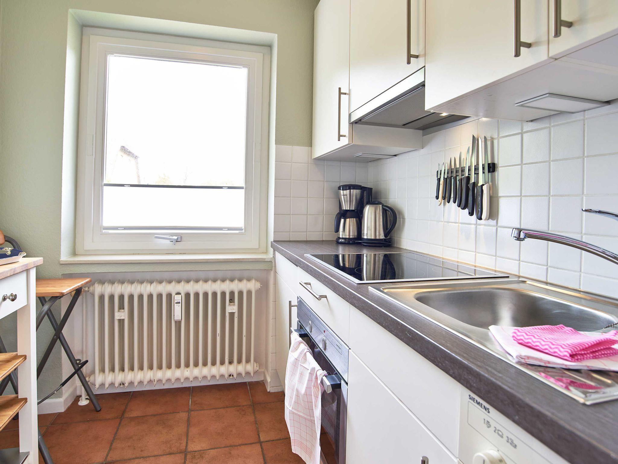In der modernen, voll ausgestatteten Küche finden Sie unter anderem einen Herd mit Backofen, einen Kühlschrank mit Gefrierfach, Geschirrspüler, Filter-Kaffeemaschine, Wasserkocher, Toaster, Handrührer sowie allerlei Pütt und Pann zum Kochen und Backen.