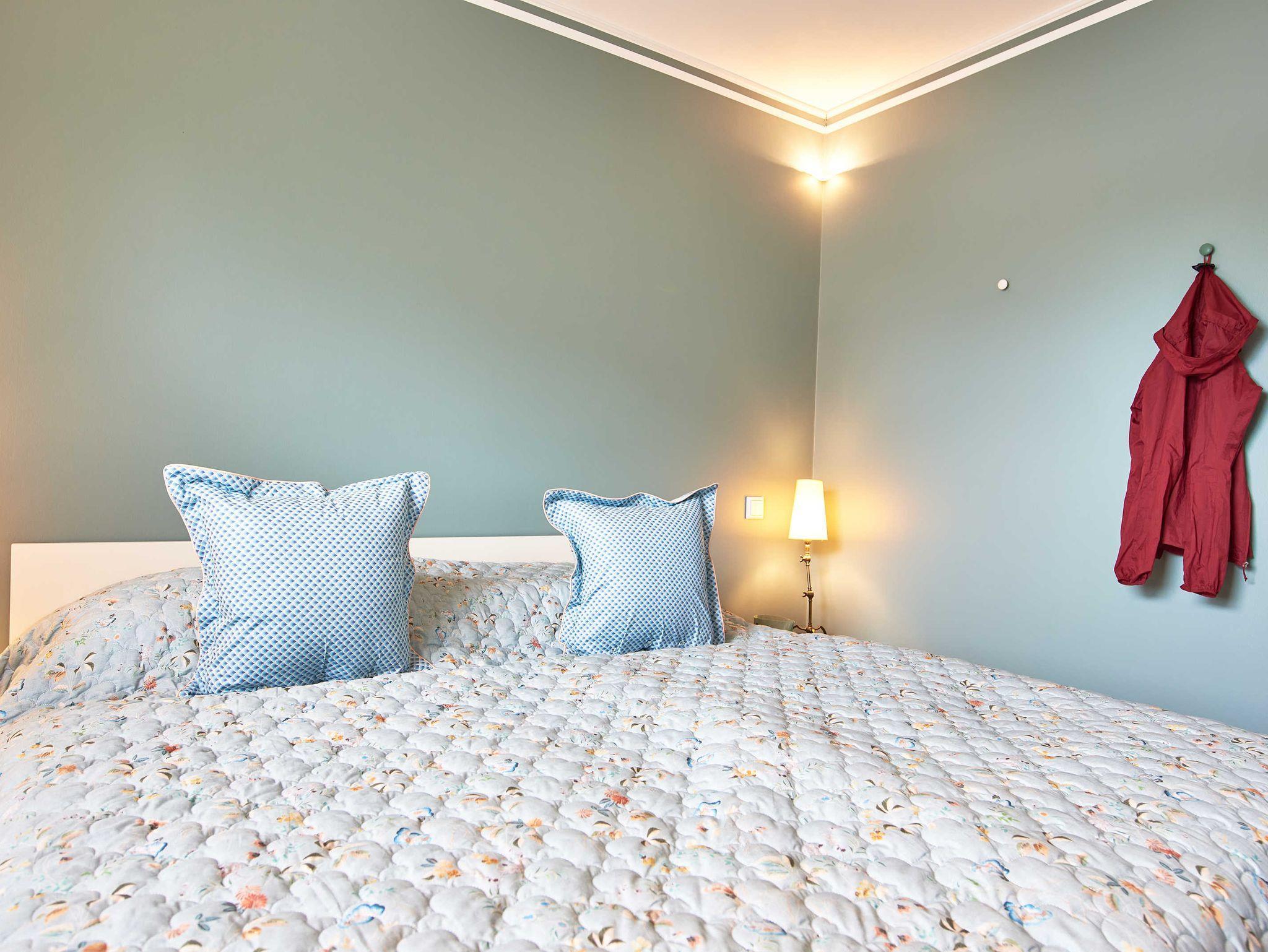 Das Schlafzimmer mit offener Garderobe im nordischen Stil, wunderschönen maritimen Farben und romantischen Beleuchtungsmöglichkeiten sorgt für besondere Gemütlichkeit. (Die Matratzen sind 190 cm lang!) In einem Einbau-Fach über der Garderobe finden Sie weitere Kissen und Decken.