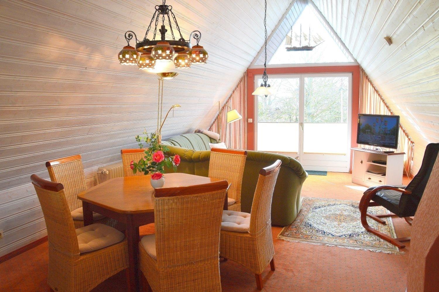 Das helle und freundliche Wohnzimmer hat Zugang zum Südbalkon. Die Essgruppe ist in nordischen Farben gehalten. Flachbid-SAT-TV, DVD-Player und Musikcenter runden das Bild ab. Die zwei Schlafzimmer sind mit Doppelbetten ausgestattet. Es ist genügend Platz vorhanden, um hier ein zusätzliches Kinderbett aufzustellen. Eine sep. Küche (komplett ausgestattet) und das Badezimmer mit Duche/WC gehören ebenfalls zur Ausstattung. Eine Unterstellmöglichkeit für Fahrräder und Kinderwagen ist ebenfalls vorhanden.