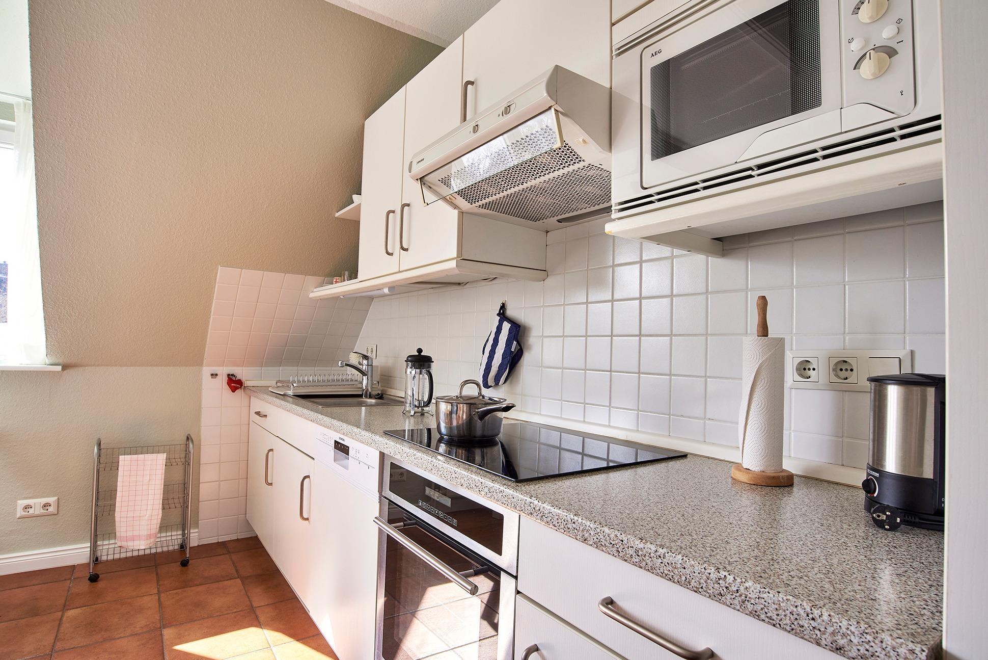 In der modernen, voll ausgestatteten Küche finden Sie unter anderem Induktionsherd mit Backofen, Kühlschrank mit Gefrierfach, Mikrowelle, Geschirrspüler, WMF-Smoothie-Mixer, Nespresso-Maschine, Filter-Kaffeemaschine, Wasserkocher, Toaster, Handrührer sowie allerlei Pütt und Pann zum Kochen und Backen. Geschirr und Besteck sind für 8 Personen vorhanden. Im Wohnzimmerschrank finden Sie eine große Auswahl neuer, hochwertiger Gesellschaftsspiele, für Entspannungstraining sorgt eine Yogamatte mit –blöcken und –gurt.
