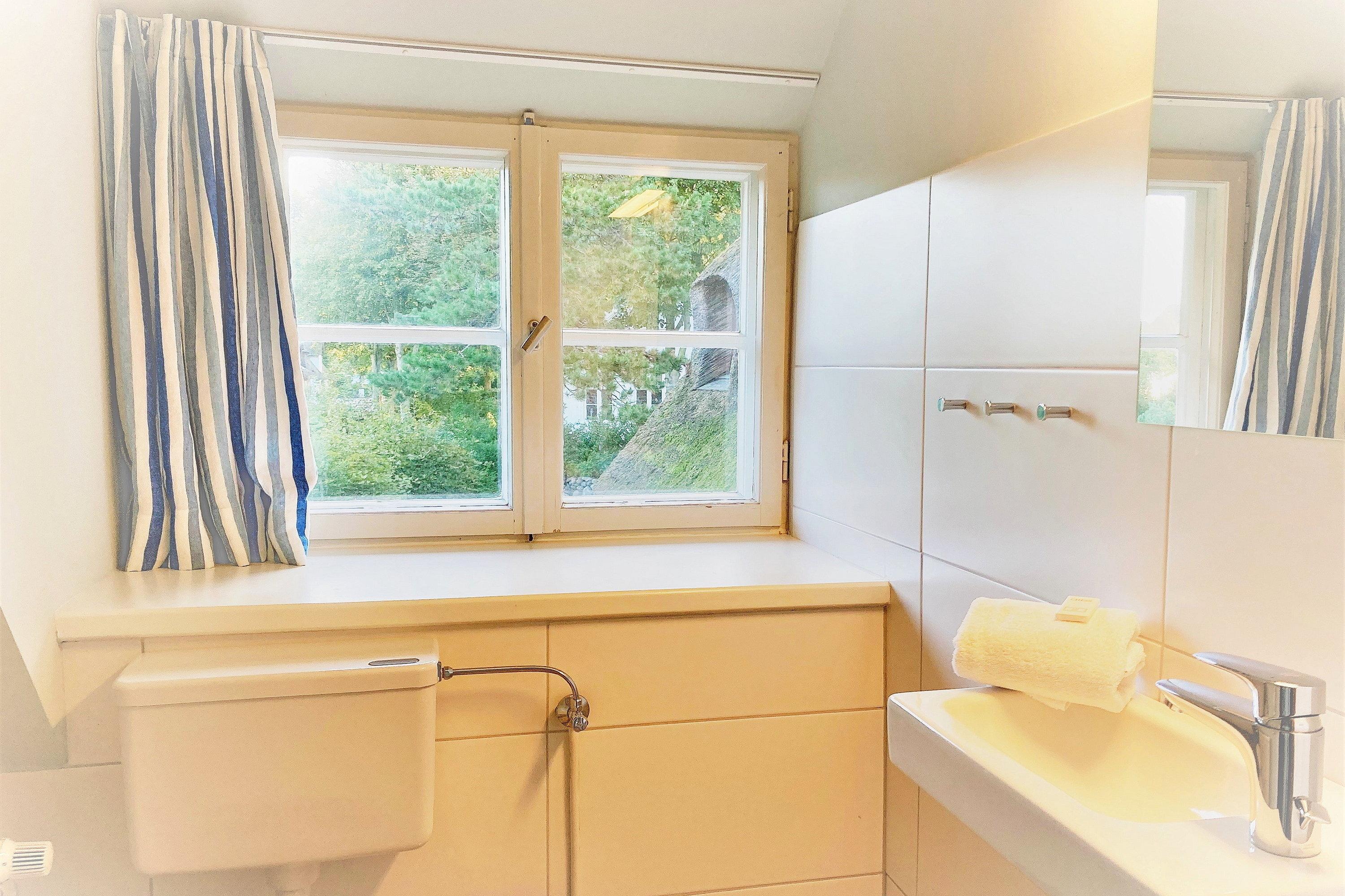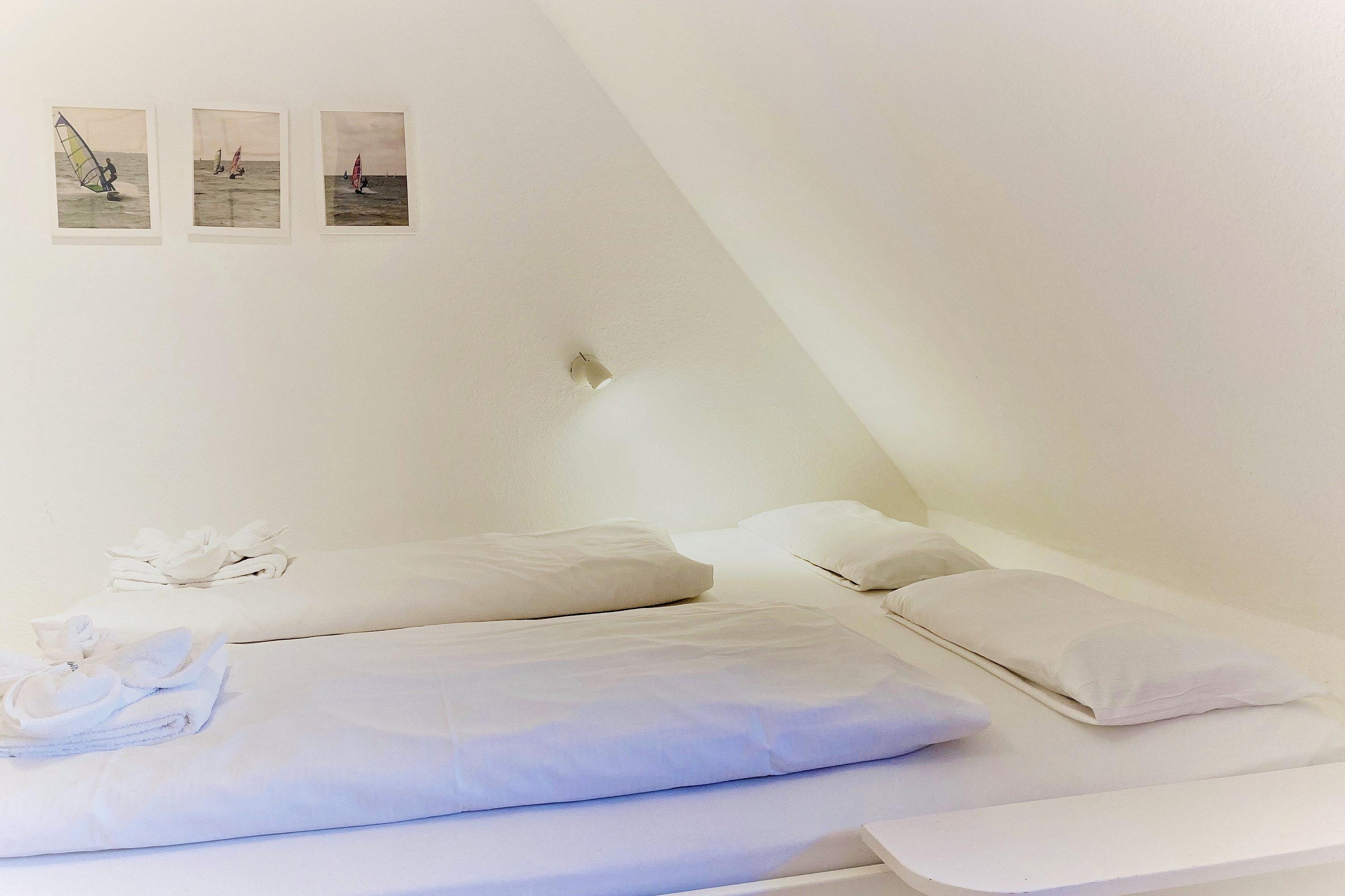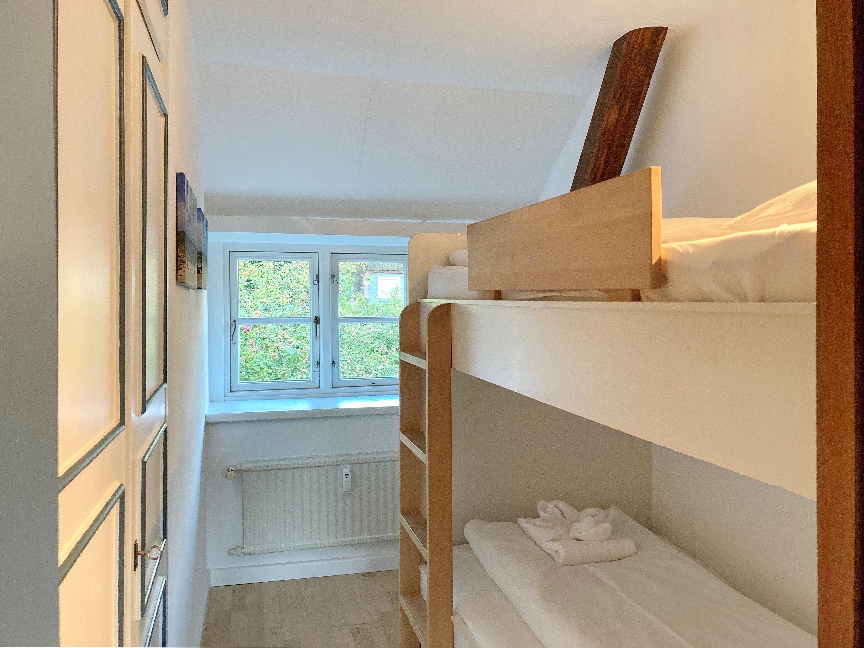 Unsere OG-Fewo "Heuboden" (ca.68 qm) liegt im ersten Obergeschoss des inseltypischen Reetdachhauses und lädt bis zu 6 Personen zu herrlichen Urlaubstagen ein. Die Ferienwohnung verfügt über ein großes, gemütliches Wohnzimmer mit WLAN, Telefon-Flatrate (deutsches Festnetz), Hifi-Anlage, Sat-TV und einer Essecke. Die separate Küche (Durchgangszimmer) ist gut ausgestattet und Geschirrspüler, Herd mit Backofen, Kühlschrank mit Gefrierfach, Kaffeemaschine, Toaster und Wasserkocher sind natürlich vorhanden. Das Badezimmer mit Dusche und Fenster ist modern gestaltet und zusätzlich gibt es noch ein Gäste-WC (ebenfalls mit Fenster). Des Weiteren gibt es noch drei Schlafräume mit einem Doppelbett (180 x 190 cm), zwei Einzelbetten (120 x 200 [&] 90 x 190cm) und 1 Etagenbett (90 x 190cm), die ruhige Nächte in Nieblum versprechen.