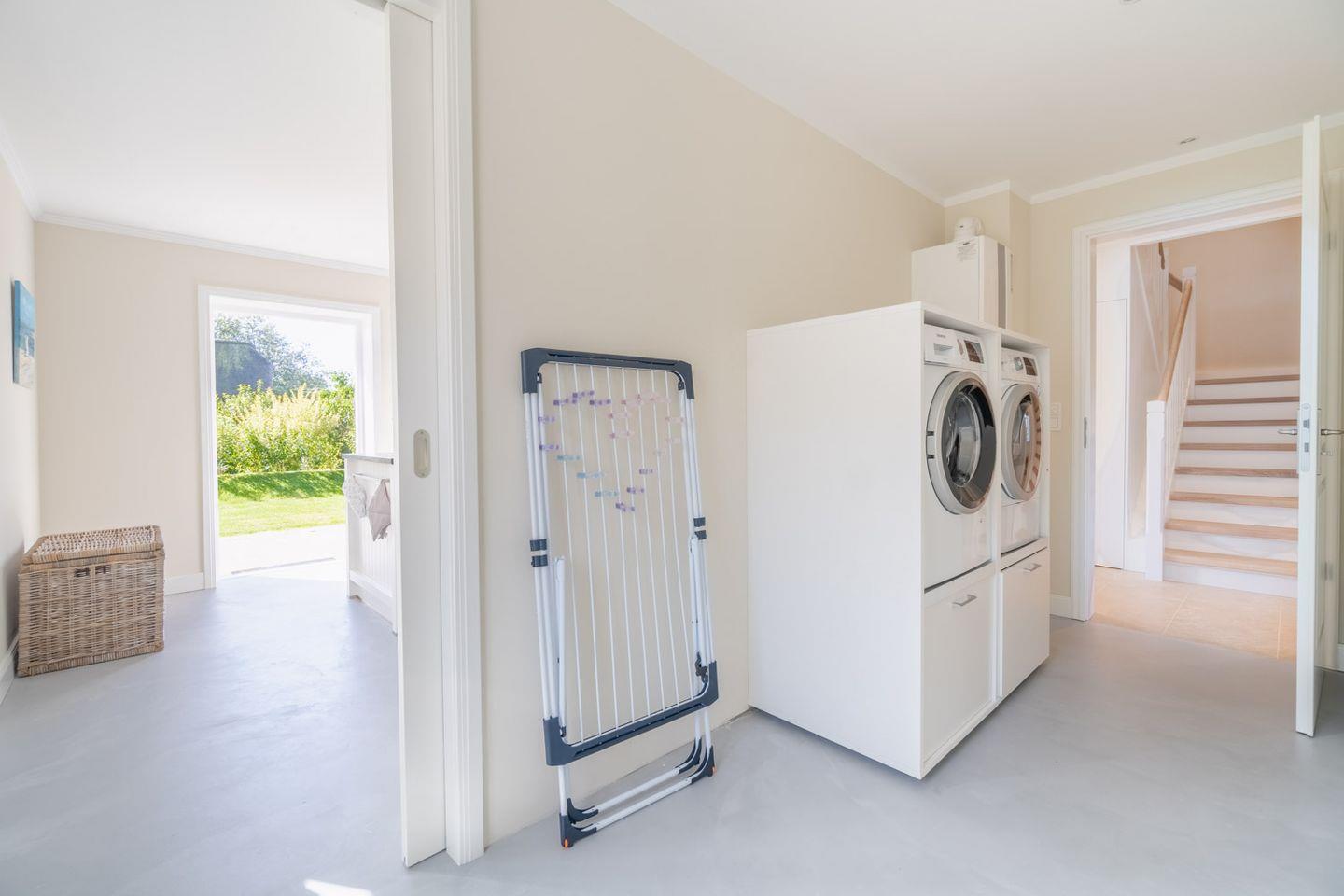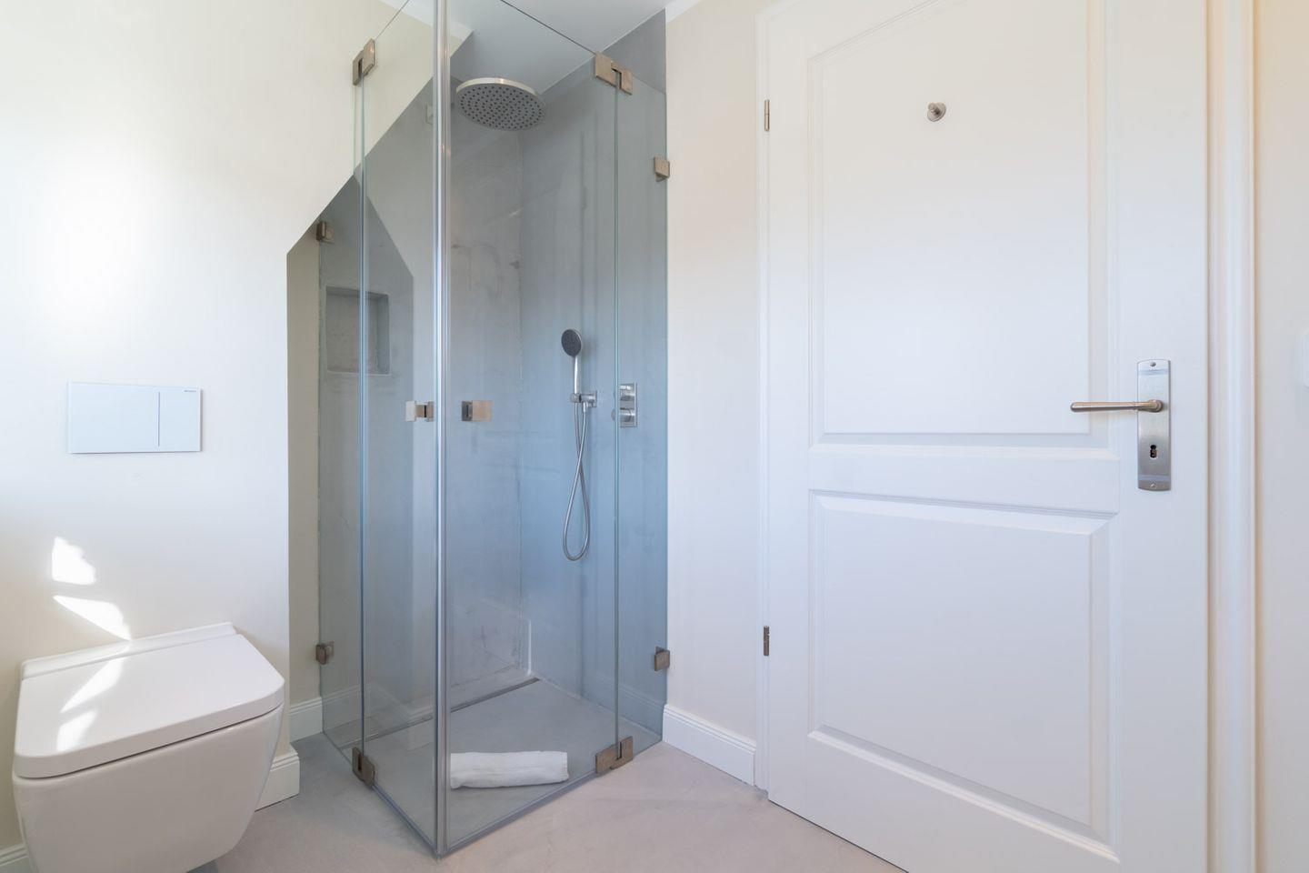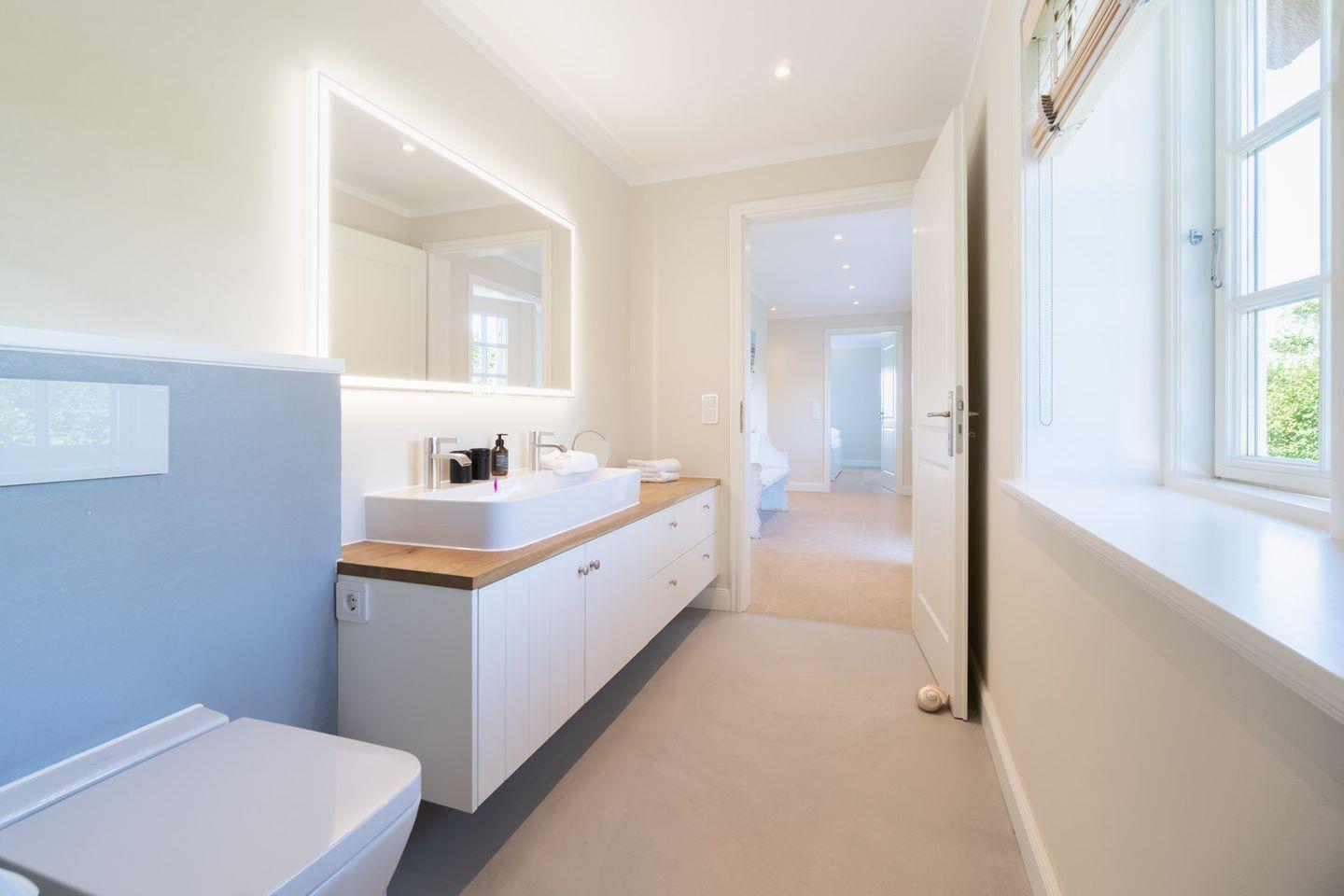 Im Erdgeschoss befinden sich ein Schlafzimmer, ein Badezimmer sowie ein Duschbad mit großem Doppelwaschbecken. Die Küche ist offen gehalten, kann aber mit einer massiven Schiebetür separiert werden. Der offene Wohn- und Essbereich ist mit hochwertigen Einbauten einer hiesigen Tischlerei ausgestattet und geschmackvoll eingerichtet worden. Eine Soundanlage im Wohnzimmer und ein Smart-TVs im Schlafzimmer im Erdgeschoss sowie im Wohnbereich lassen die Herzen von Technikfans höher schlagen. Im Erdgeschoss befindet sich ein Hauswirtschaftsraum mit Waschmaschine und Trockner.