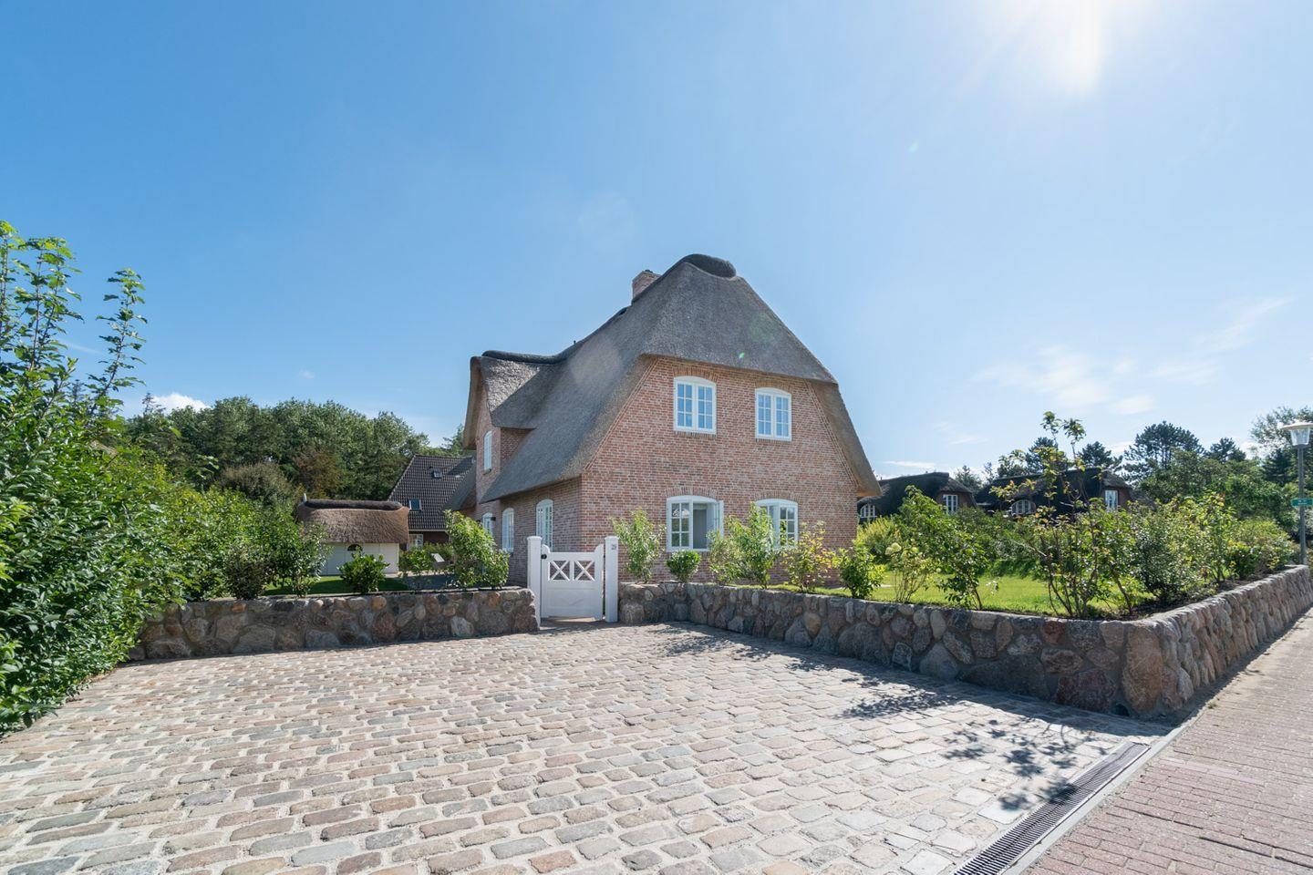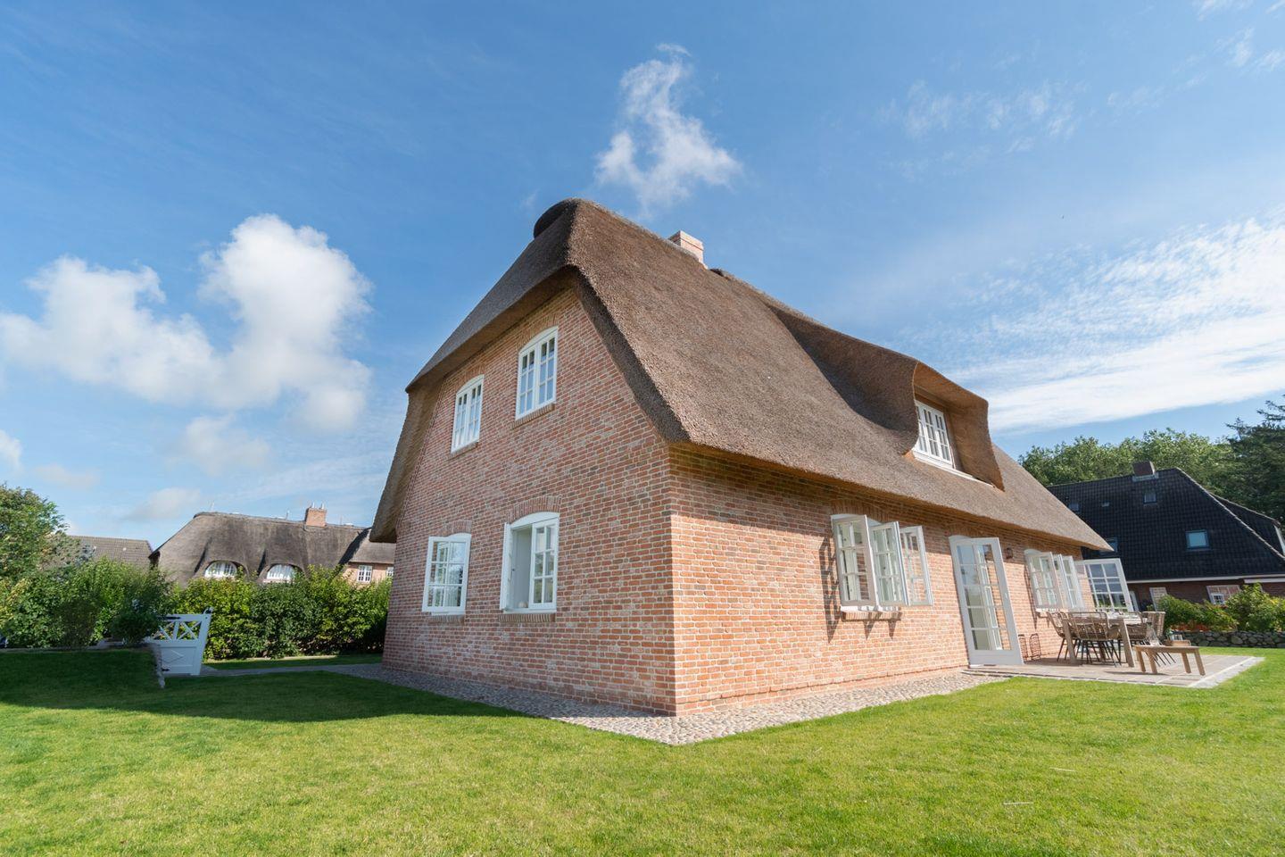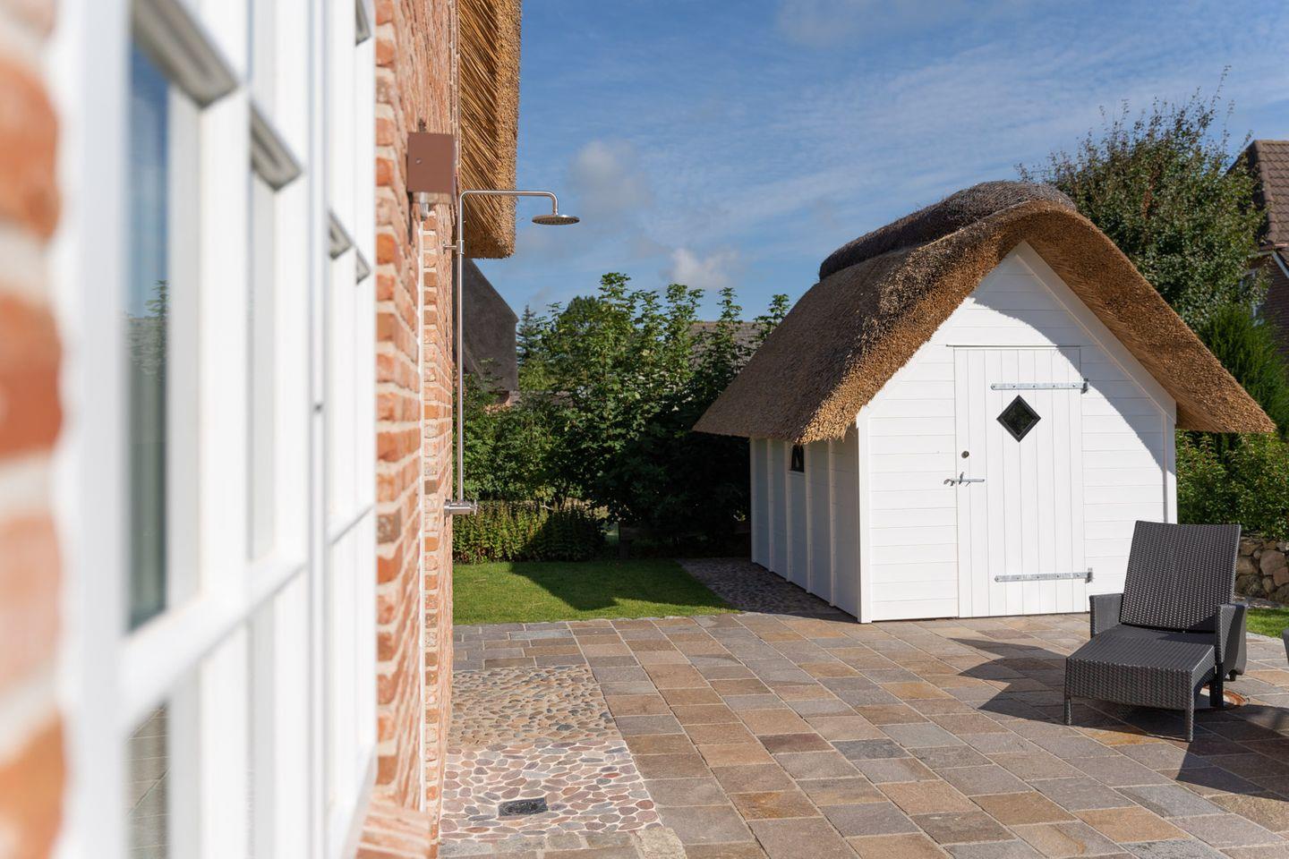 Der Garten verläuft um die freistehende Immobilie unter Reet. Es befindet sich ein Terrassenplatz mit Sonnenliegen und Strandkorb im Außenbereich und ein weiterer Platz mit einem Essplatz und -stühlen. Fahrräder können in der kleinen Gartenhütte unter Reet untergestellt und eingeschlossen werden und bei Bedarf können E-Bike-Akkus hier direkt aufgeladen werden. Zwei PKW-Stellplätze runden das Angebot ab.