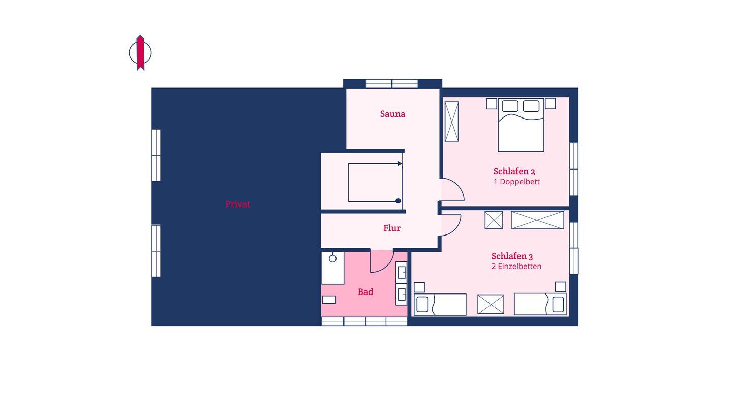 Im Obergeschoss befinden sich zwei weitere Schlafzimmer, ein weiteres Badezimmer und die Sauna.