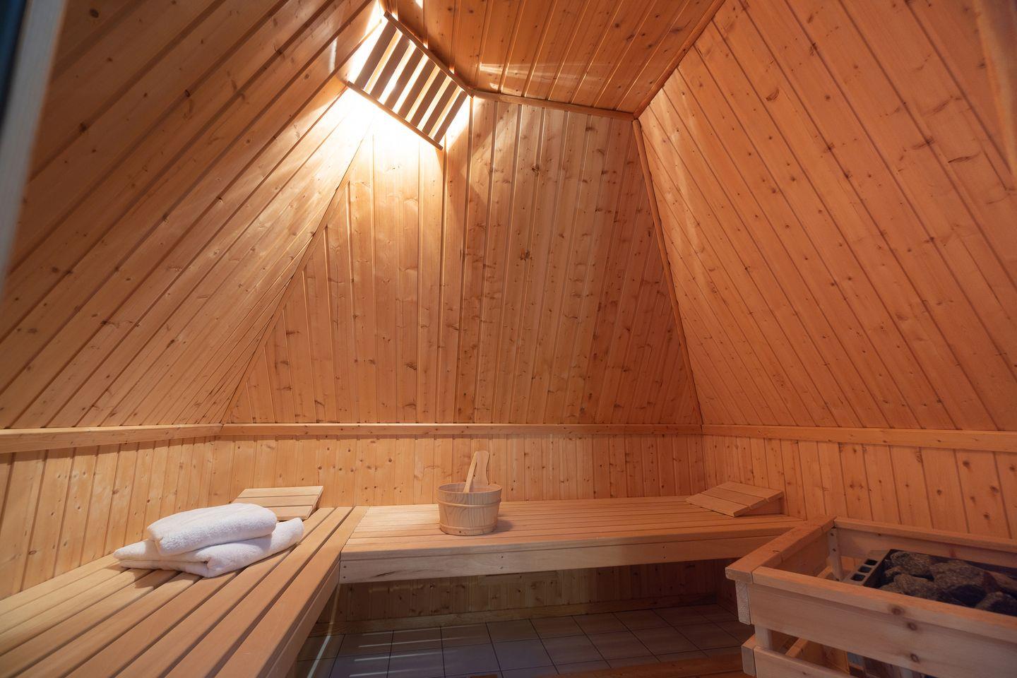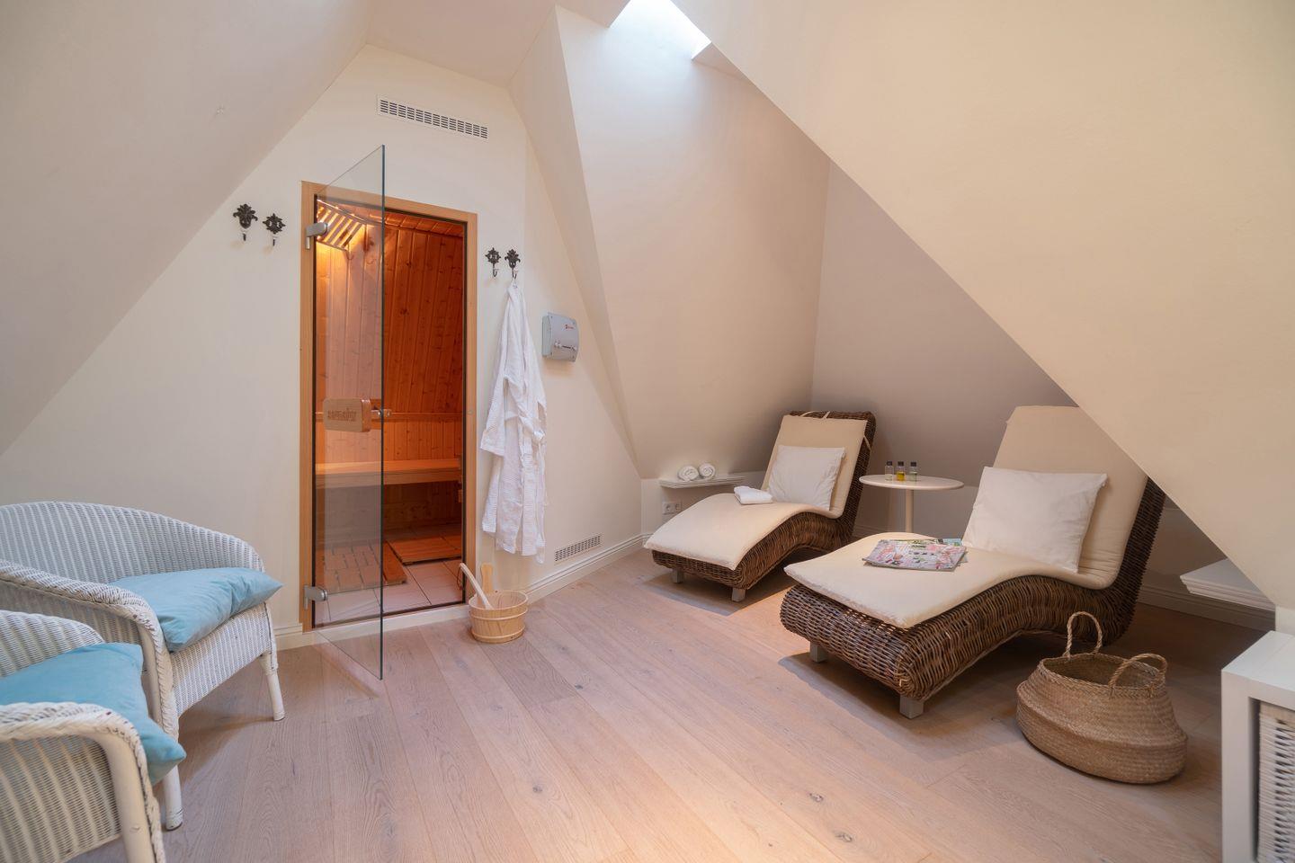 Im Dachgeschoss befindet sich die hauseigene Sauna mit angrenzendem Ruheraum.