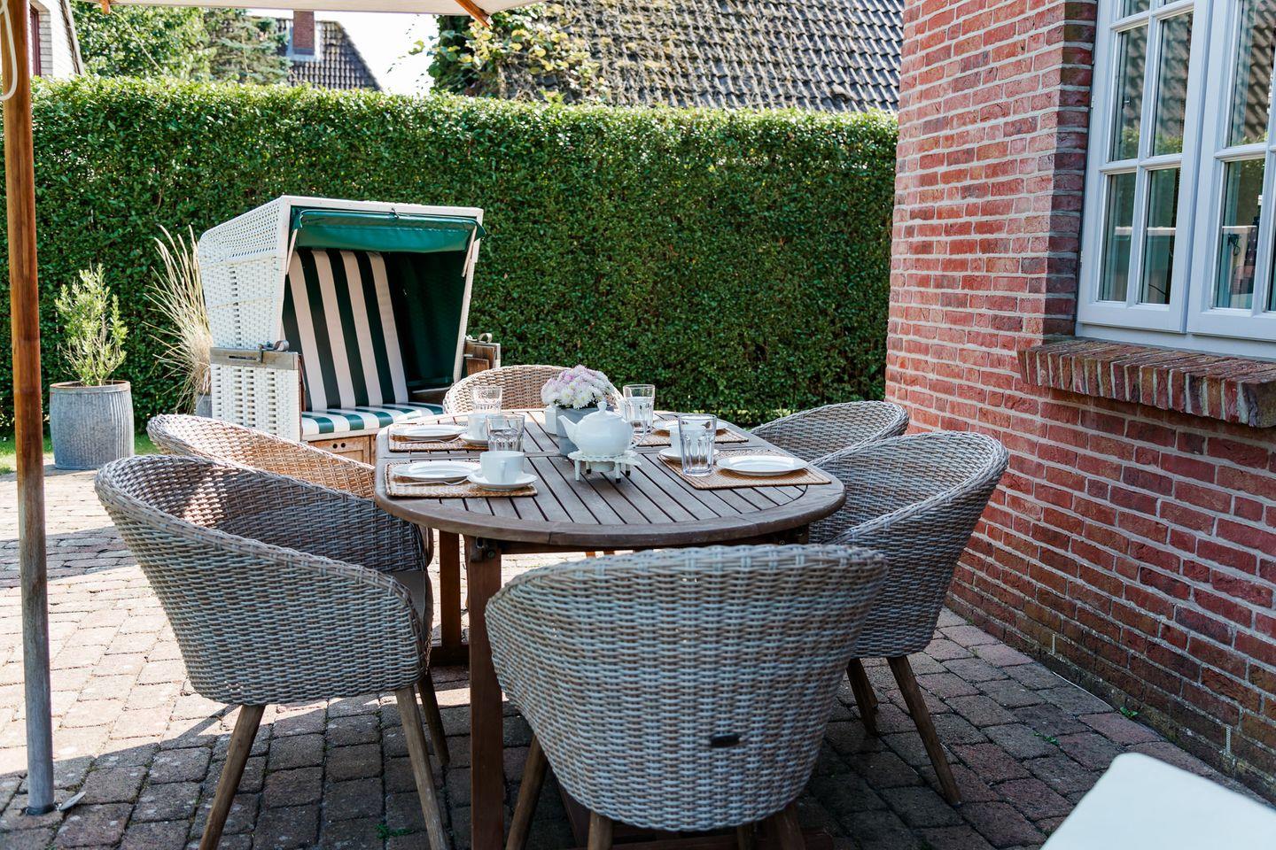 Genießen Sie Ruhe und Komfort in der Reet Lodge auf Föhr mit Sauna und großem Garten.
