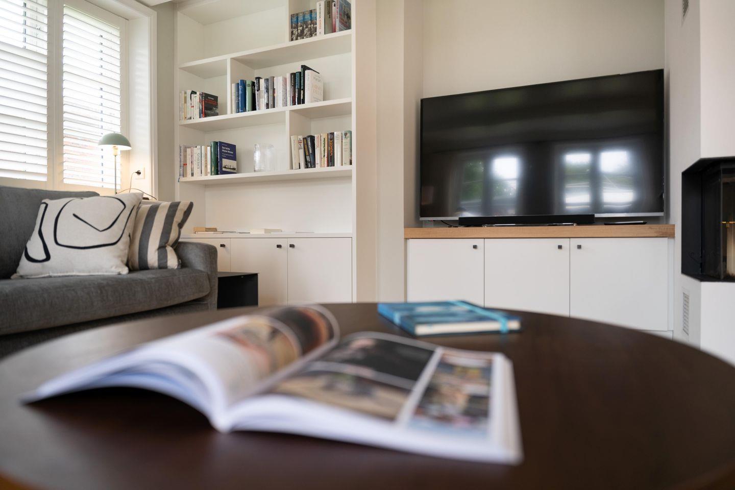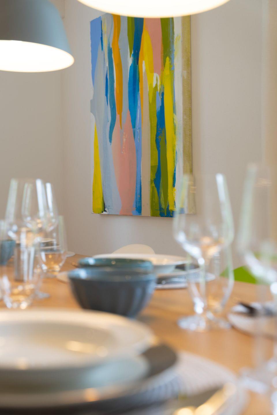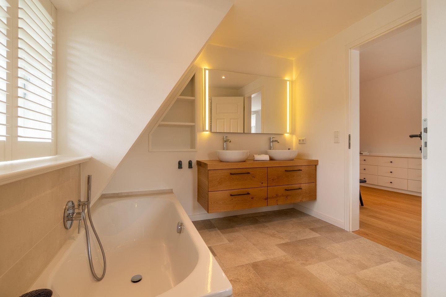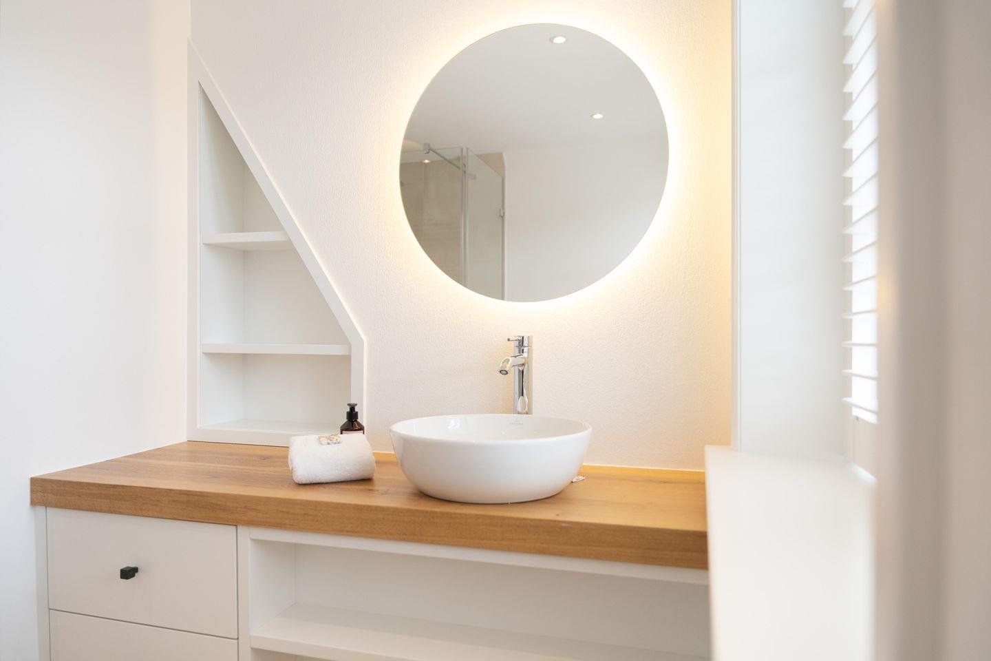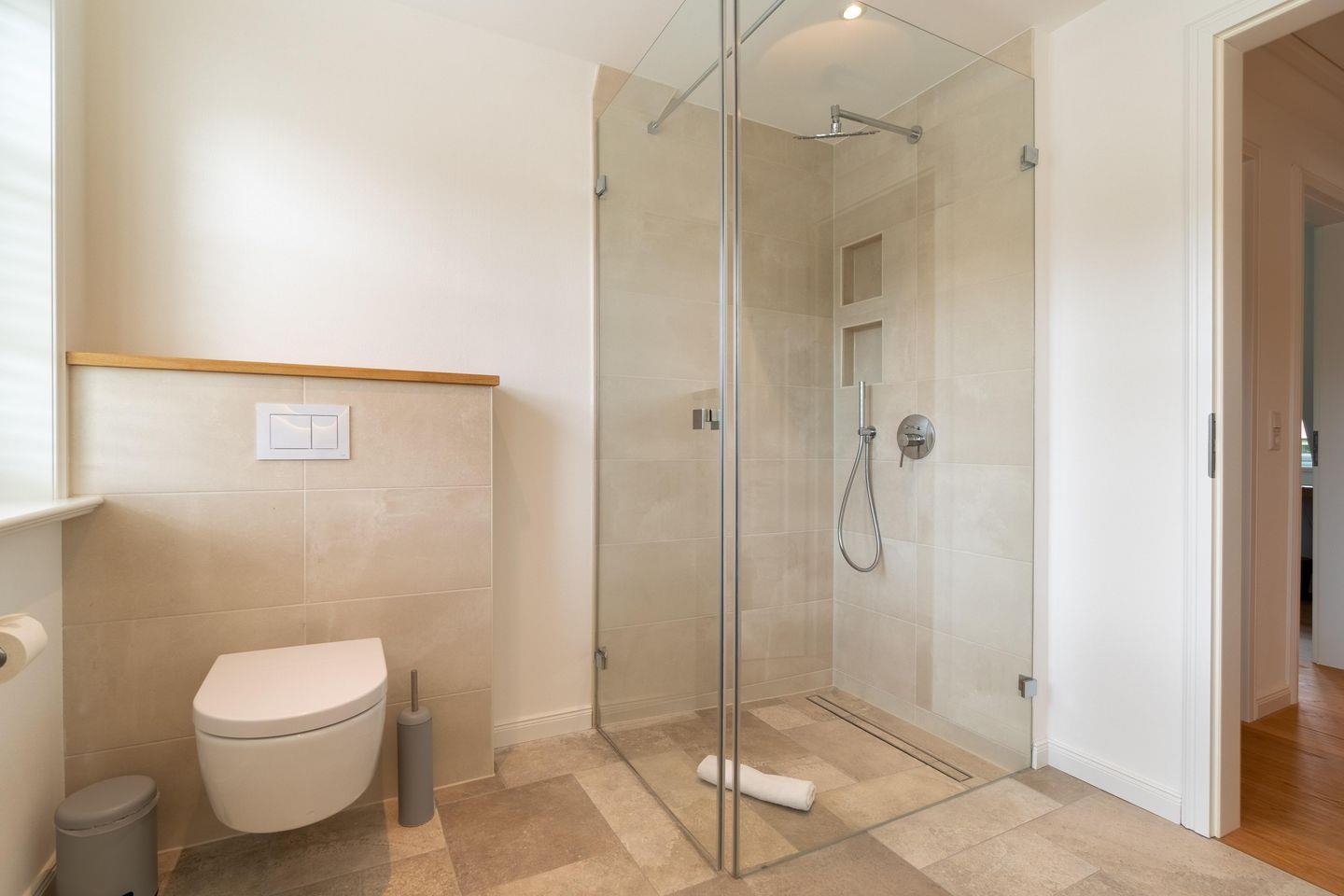 Im Erdgeschoss befinden sich der großzügige Wohn- und Essbereich mit offener Küche sowie ein Gäste-WC. Vom Wohnbereich aus gelangen Sie in den Garten und auf die beiden Terrassen. Der Kamin sorgt auch an kühleren Tagen für eine wohlige Atmosphäre.