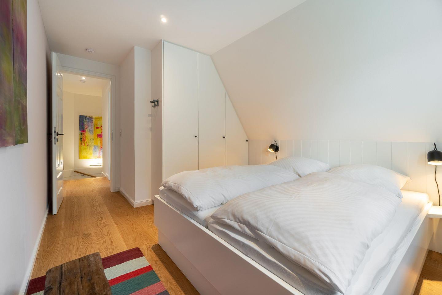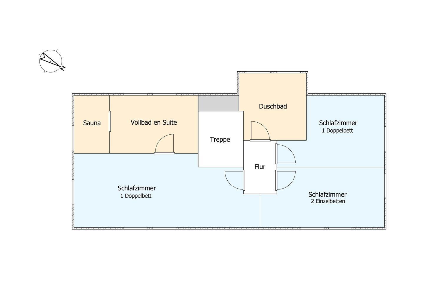 Im Obergeschoss befinden sich die drei Schlafzimmer - zwei mit einem Doppelbett und eines mit zwei Einzelbetten - sowie ein Vollbad mit Sauna und ein Duschbad.