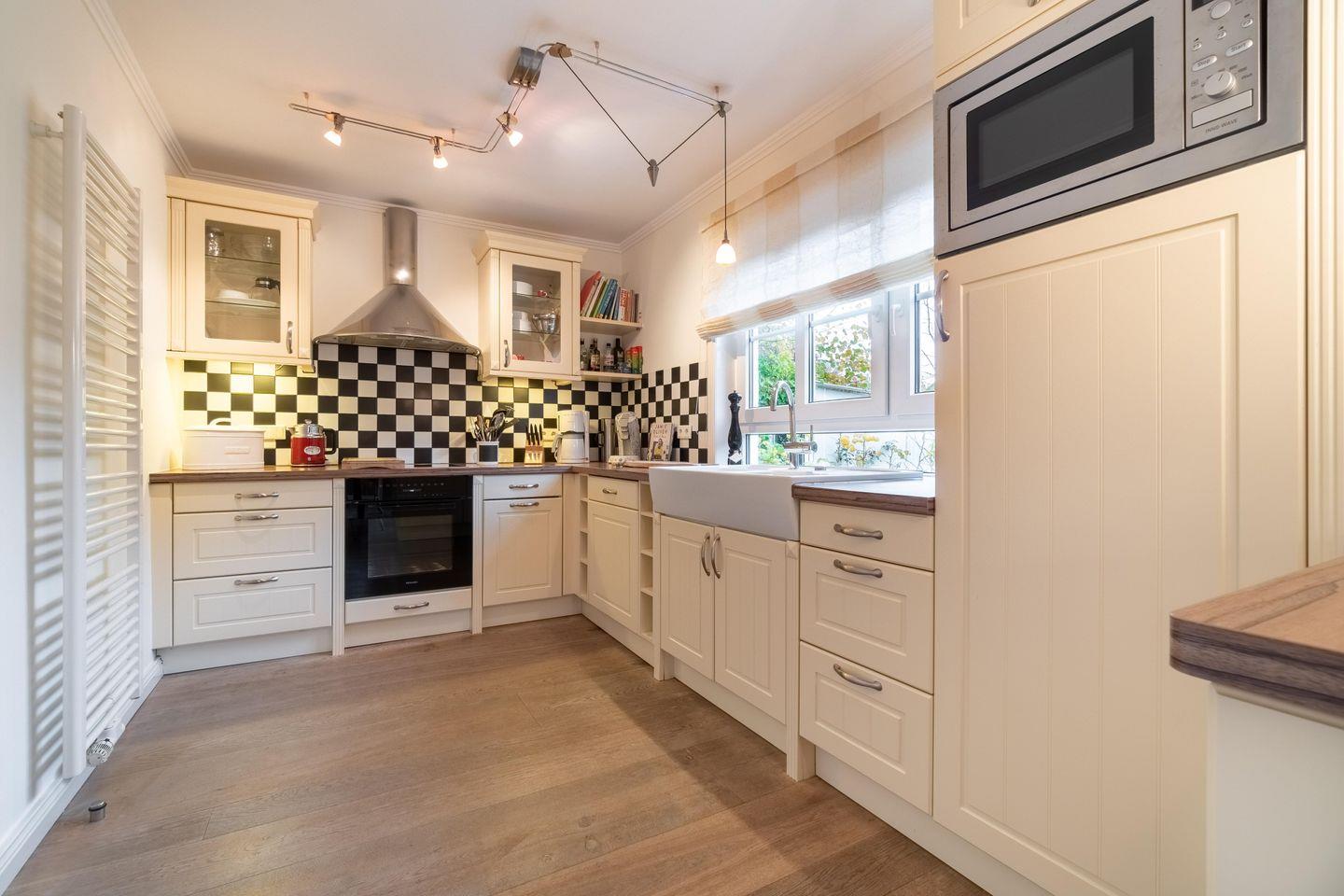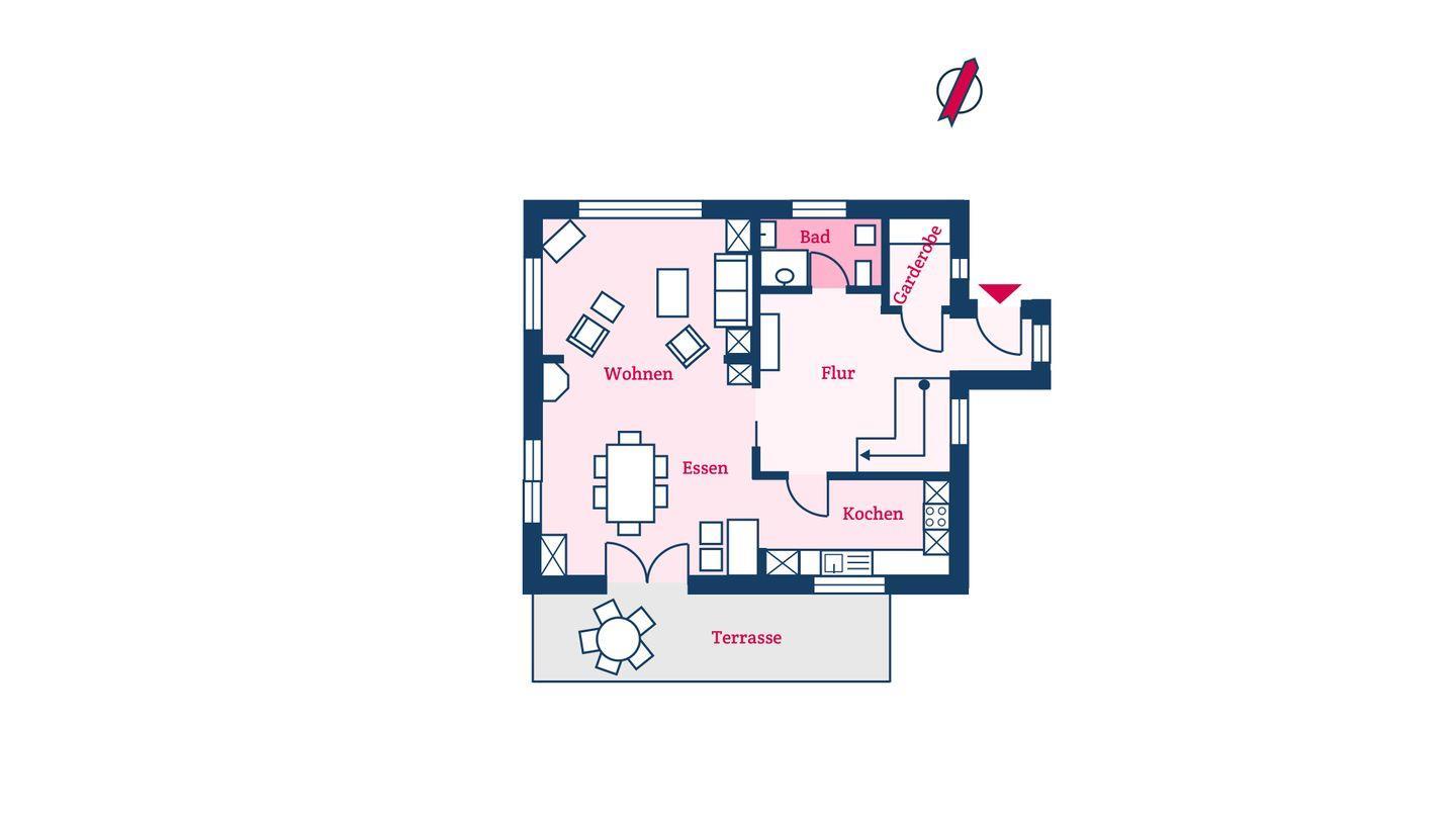 Im Erdgeschoss befinden sich der großzügige Wohn- und Essbereich mit offener Küche und ein Duschbad sowie ein separater Garderobenraum. Der Kamin im Wohnbereich spendet wohlige Wärme an kühlen Abenden. Über den Essbereich gelangen Sie auf die Terrasse und in den eigenen, 800 m² großen Garten.