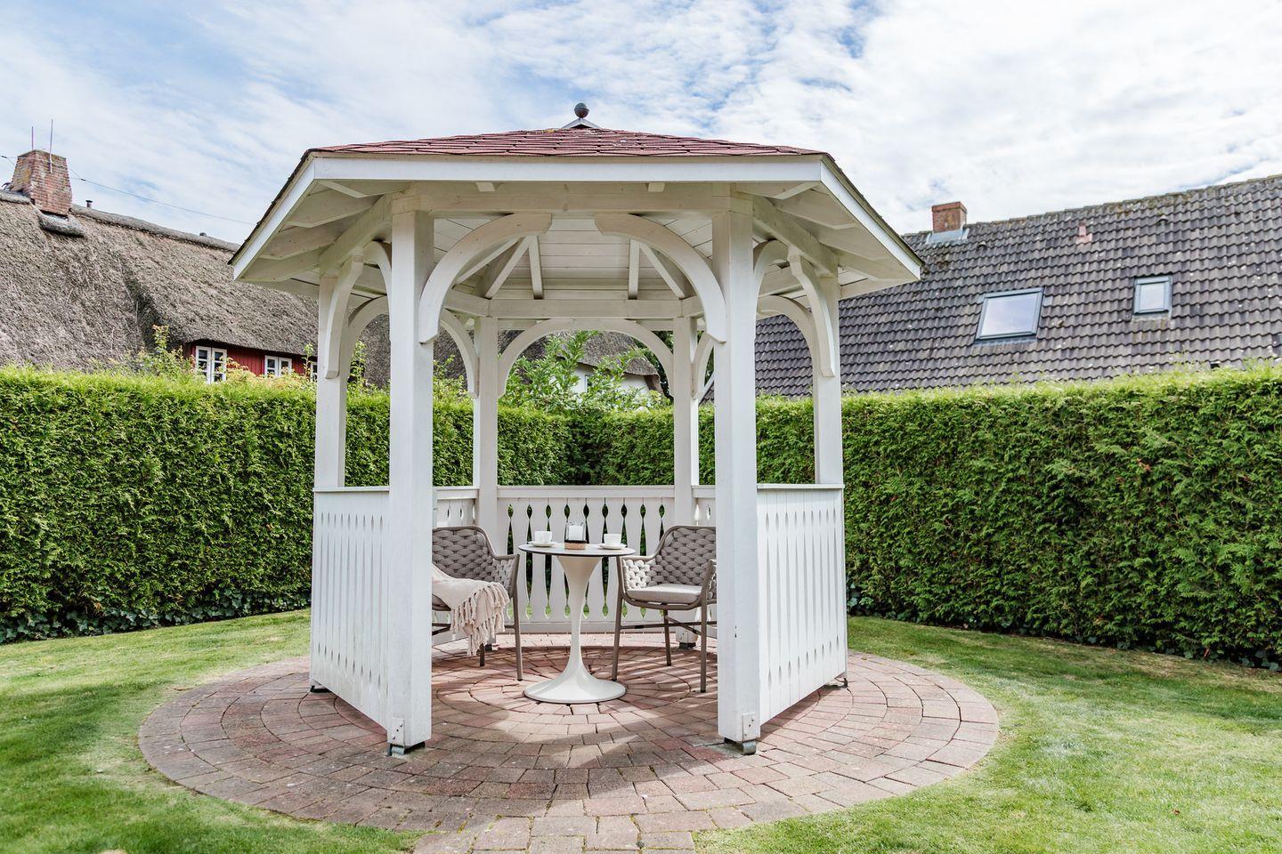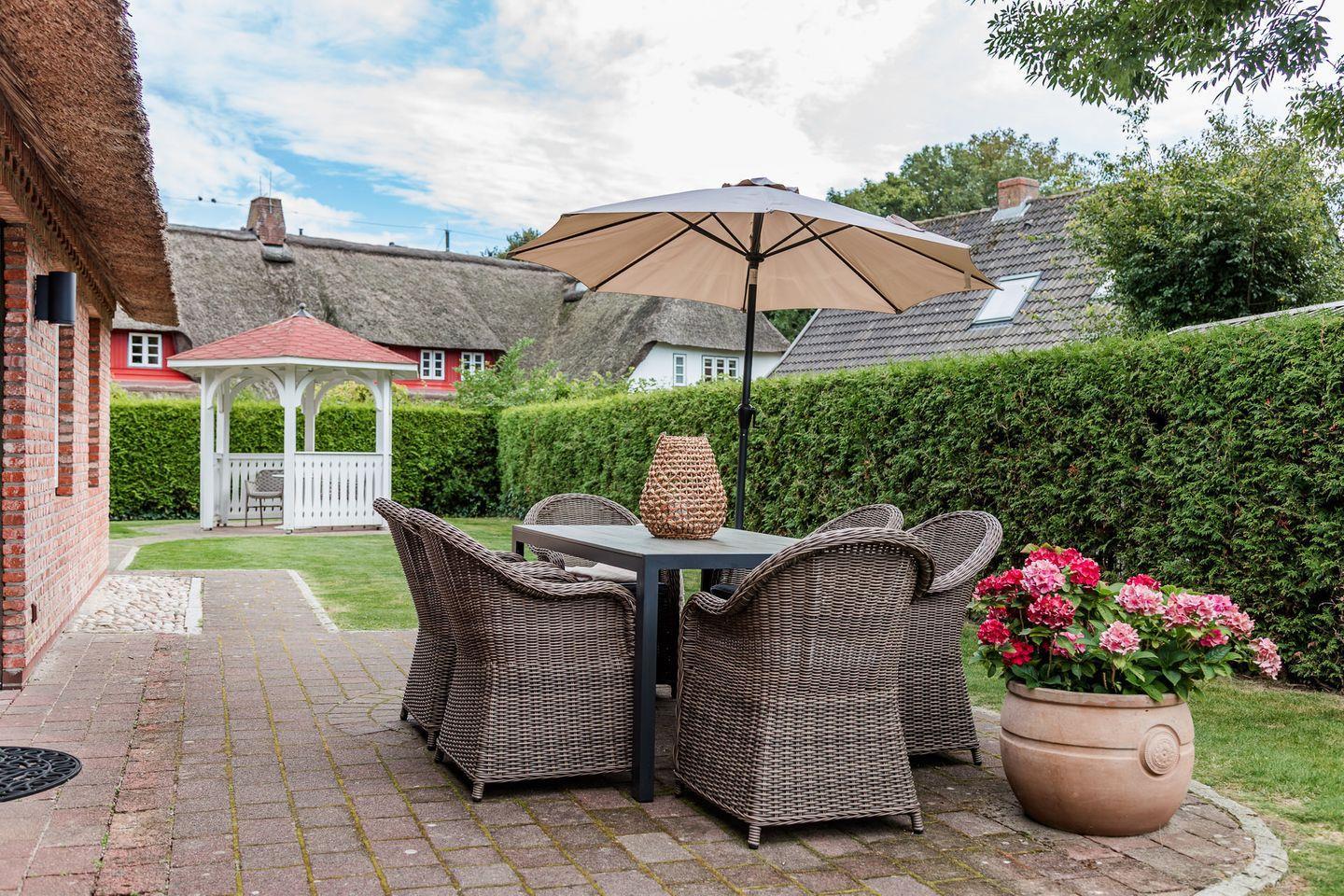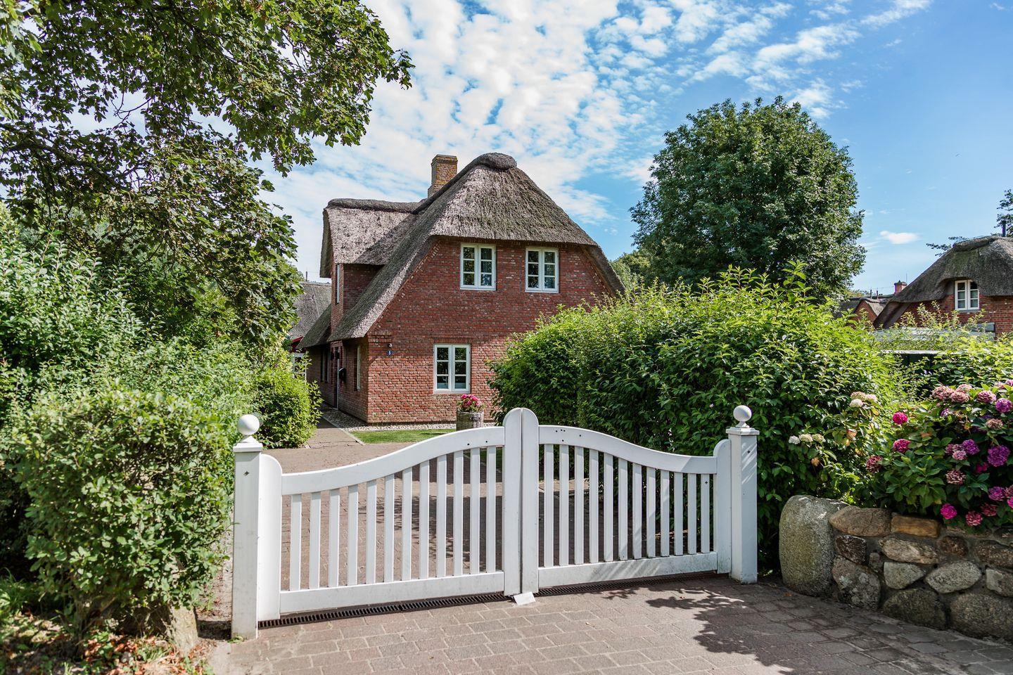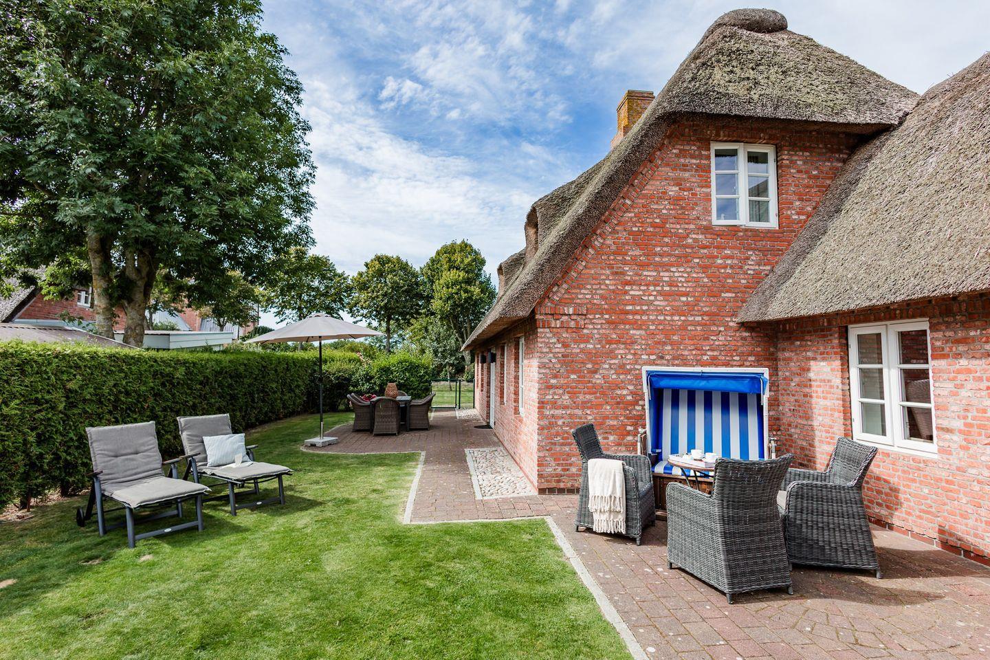 Das reetgedeckte Haus Friesenliebe auf Föhr bietet Sauna, Kamin und großen Garten mit Terrasse für erholsame Ferien.
